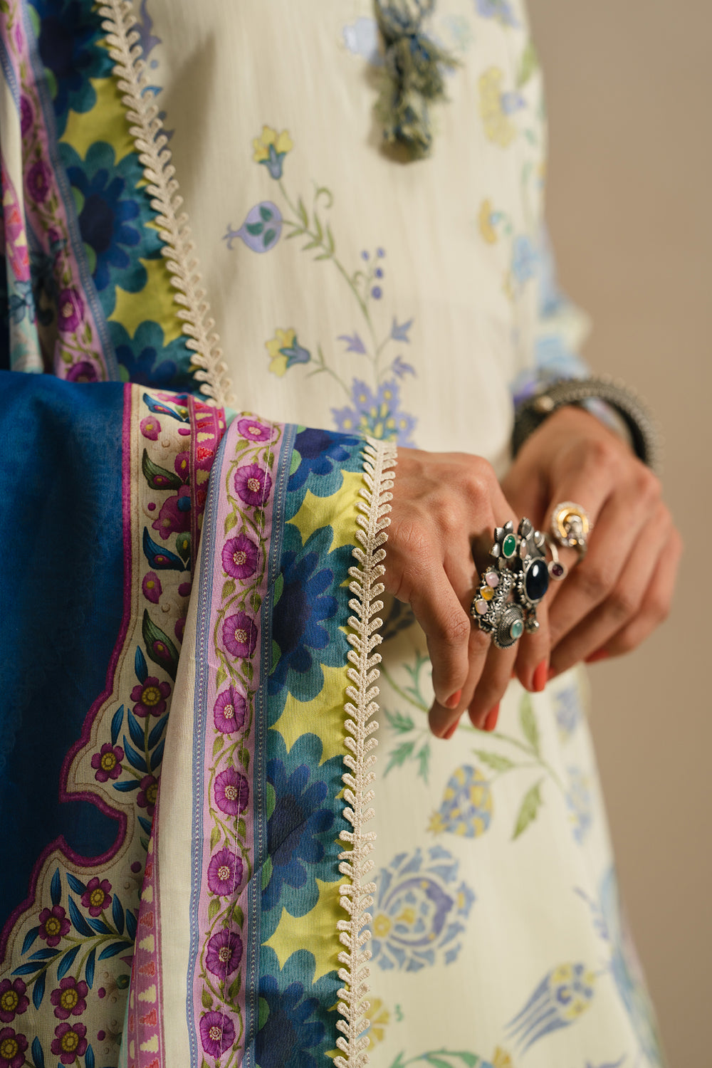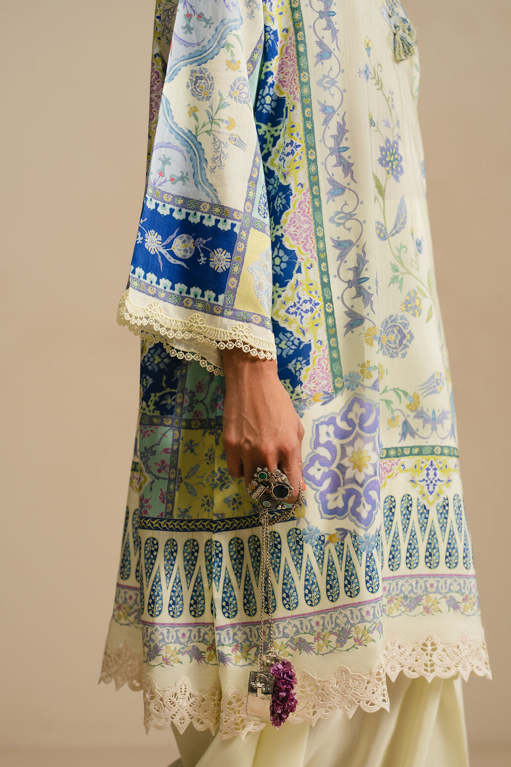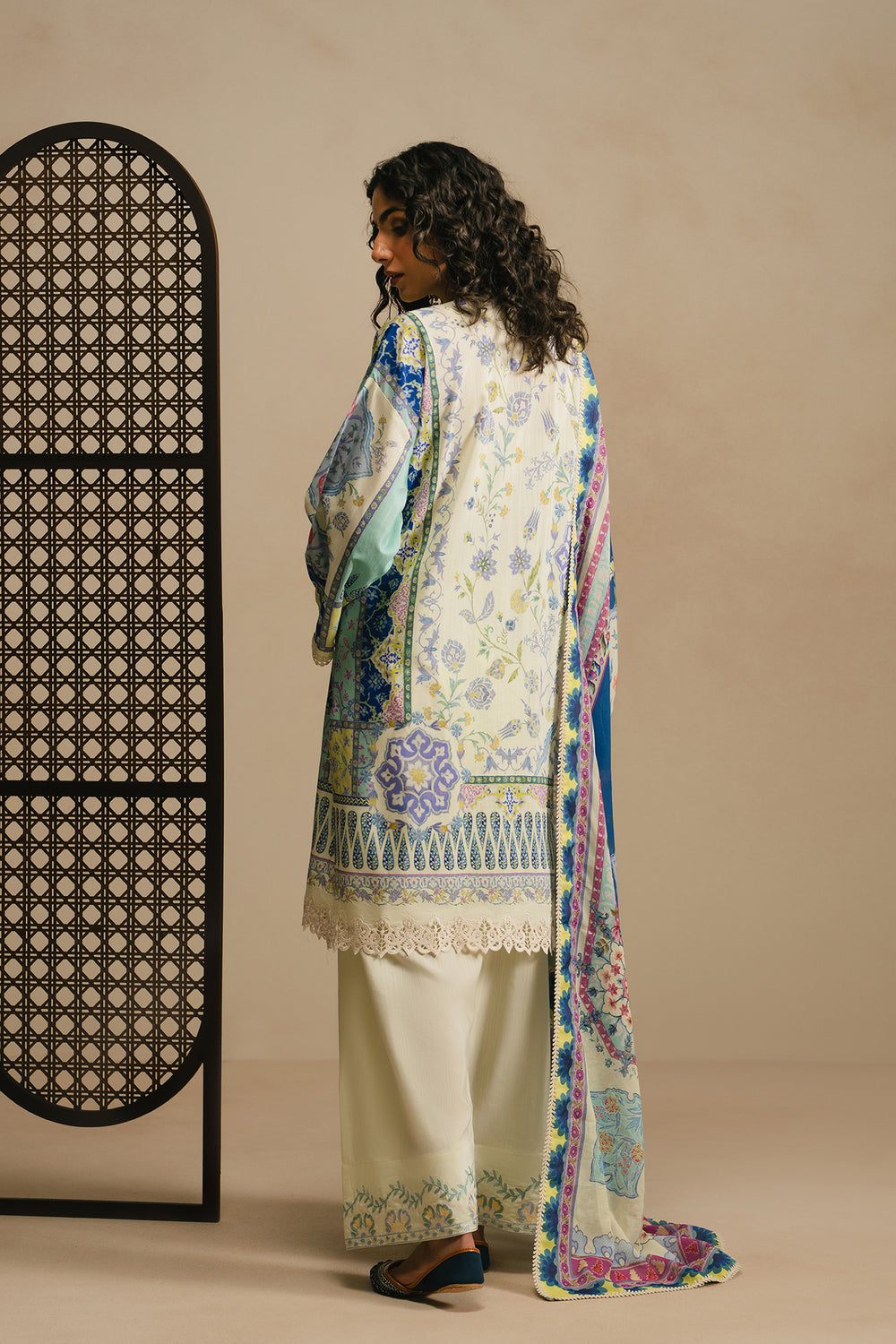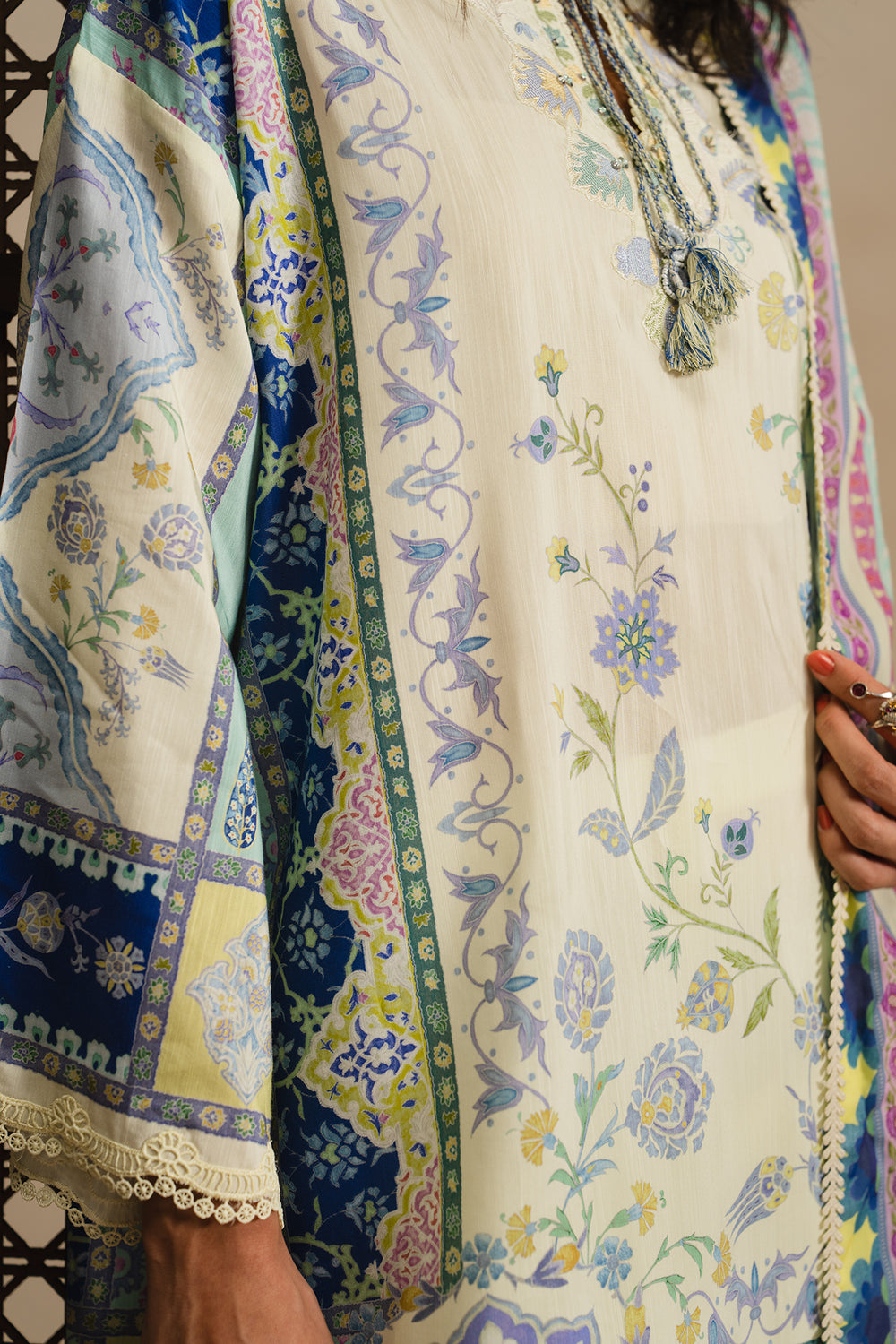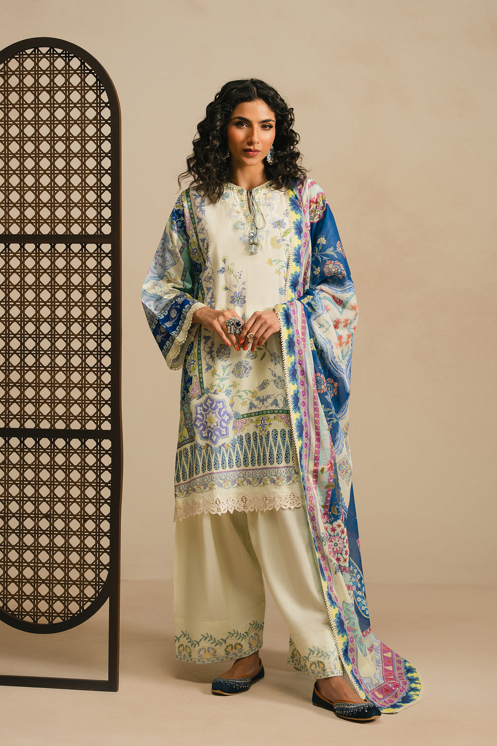 Ivory kameez with intricate multi-colored floral and geometric prints, featuring a keyhole neckline with delicate tassels and wide lace border at the hem. Paired with a striking cobalt blue dupatta adorned with vibrant paisley and floral patterns along the borders and lace trim. Completed with wide-leg, off-white trousers featuring subtle embroidery at the ankles. A cohesive three-piece ensemble that blends traditional elegance with contemporary design.