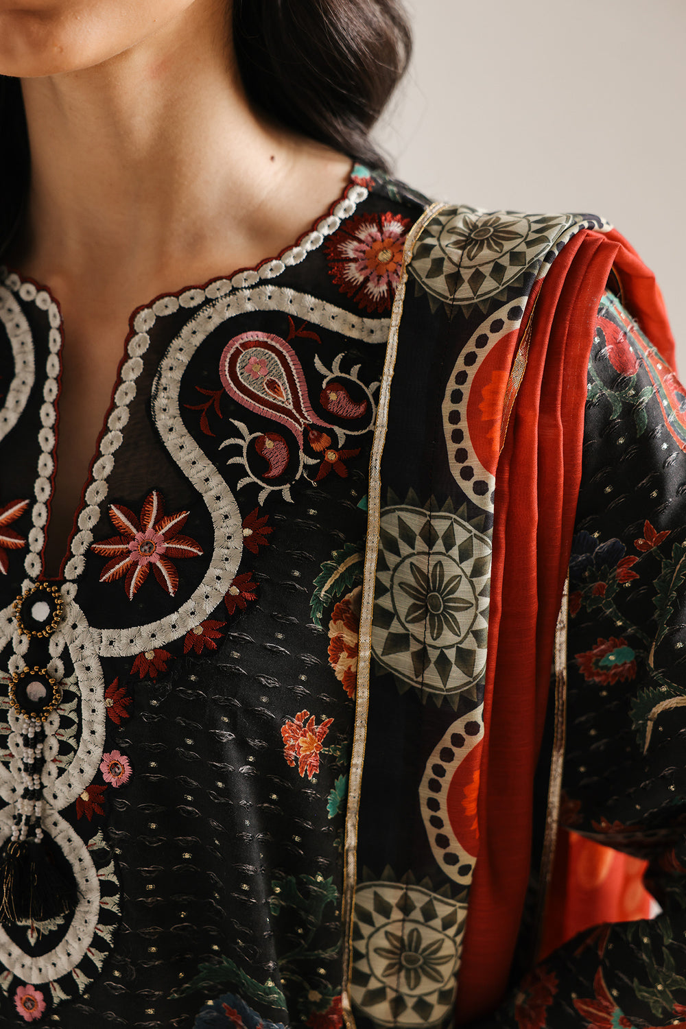 Cultivate a sense of artistic grandeur with this floor-length two-piece suit, featuring a majestic A-line shirt and a coordinated statement dupatta. The jet-black shirt is designed with a high, intricately embroidered round neckline and long flared sleeves, showcasing a vibrant all-over digital print of traditional motifs, floral sprays, and geometric patterns in rich shades of terracotta, emerald, and teal. This ornamental design is anchored by a dramatic, multi-layered border of scalloped arches and floral medallions along the hemline. The ensemble is elevated by a voluminous, lightweight dupatta that mirrors the shirt's rich palette, featuring a bold central print of architectural and botanical elements framed by a wide, decorative border.