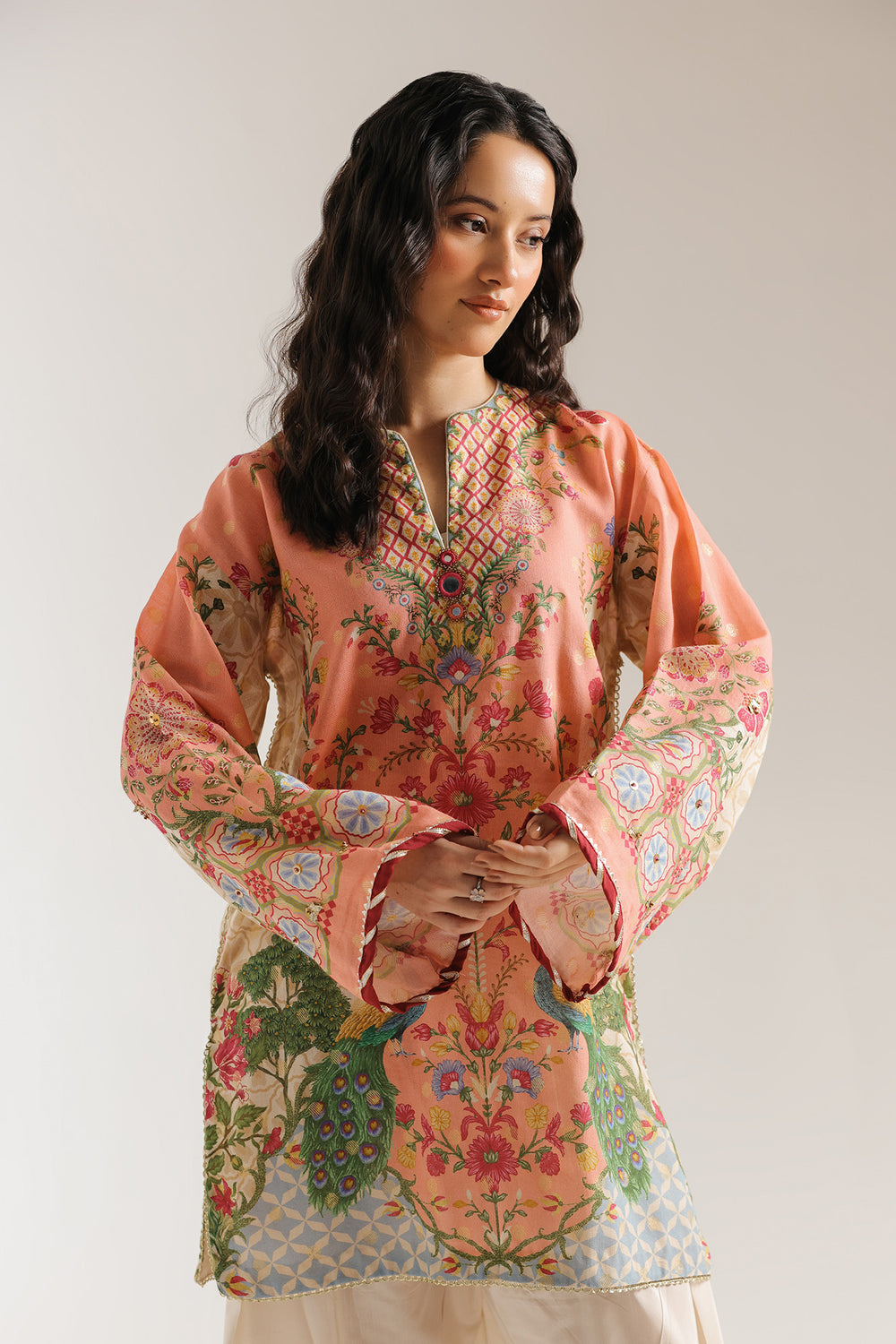 This graceful two-piece printed jacquard suit features a delicate cream and blush pink color palette, perfect for serene daytime elegance. The mid-length, loose-fit shirt is crafted from textured jacquard fabric, featuring an all-over floral print and a traditional V slit neckline. The ensemble is paired with voluminous cream-colored shalwar adorned with matching scalloped border at the base. This outfit combines a breezy, comfortable cut with high-end artisanal finishes, making it a sophisticated choice for festive gatherings or semi-formal events.