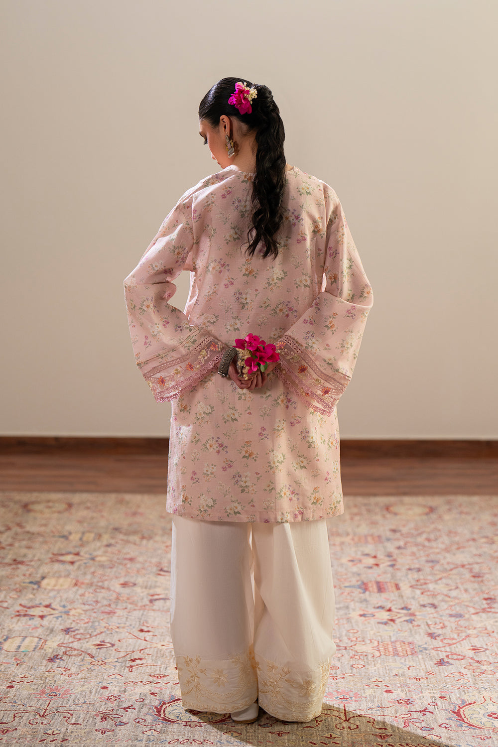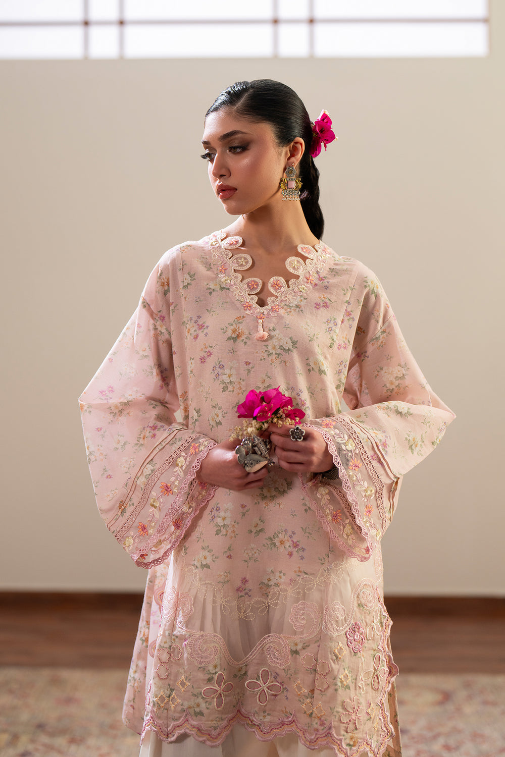 This blush pink embroidered suit radiates ethereal charm and feminine grace. The shirt is adorned with an all-over delicate floral print, beautifully accented by a statement laser-cut floral neckline. Intricate tonal embroidery and soft lace detailing enhance the hem and sleeve cuffs, creating a layered, textured look. Paired with off-white wide-leg farshi shalwar featuring subtle embroidery at the base, this ensemble is a perfect choice for a sophisticated daytime event.