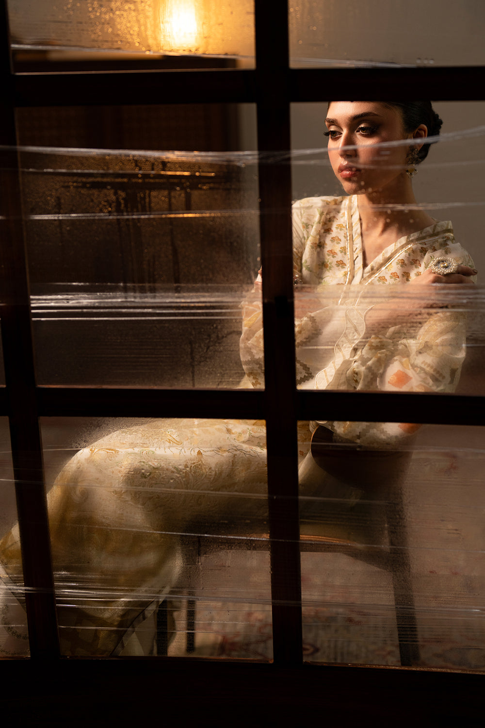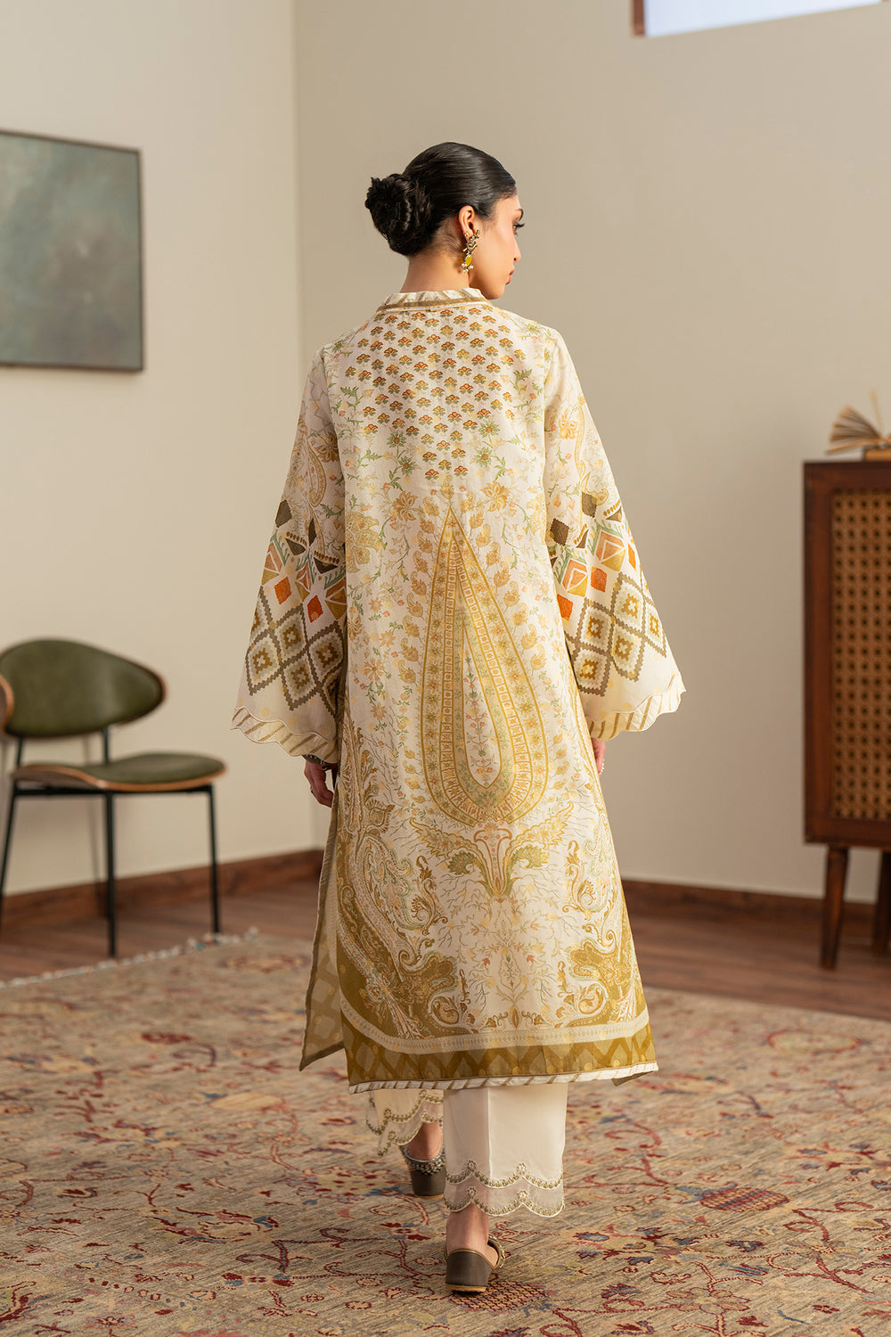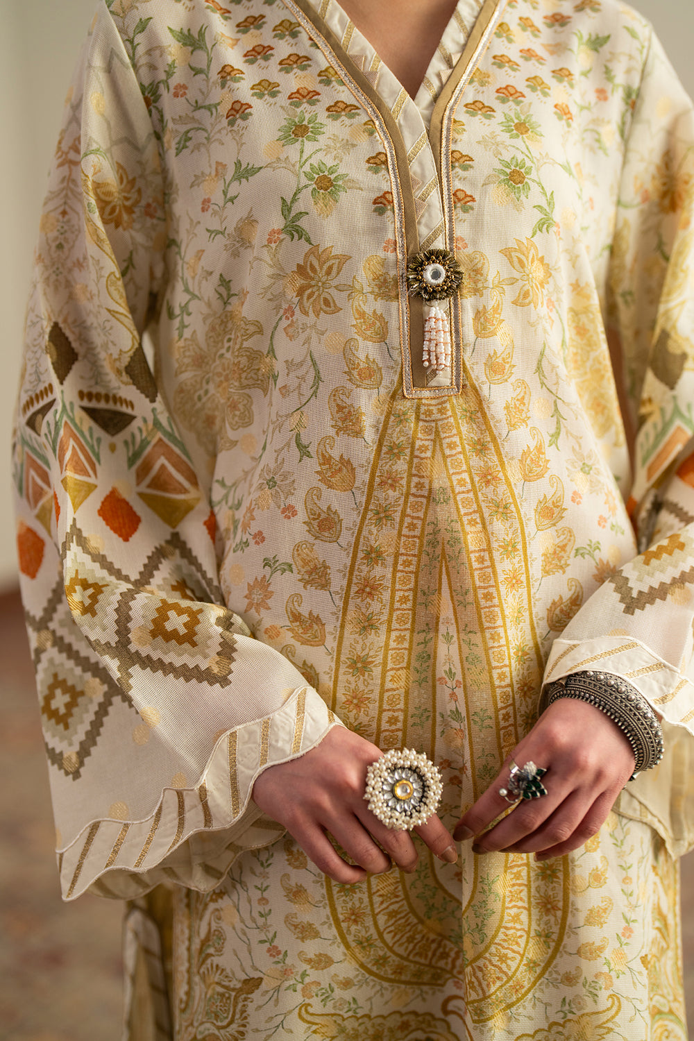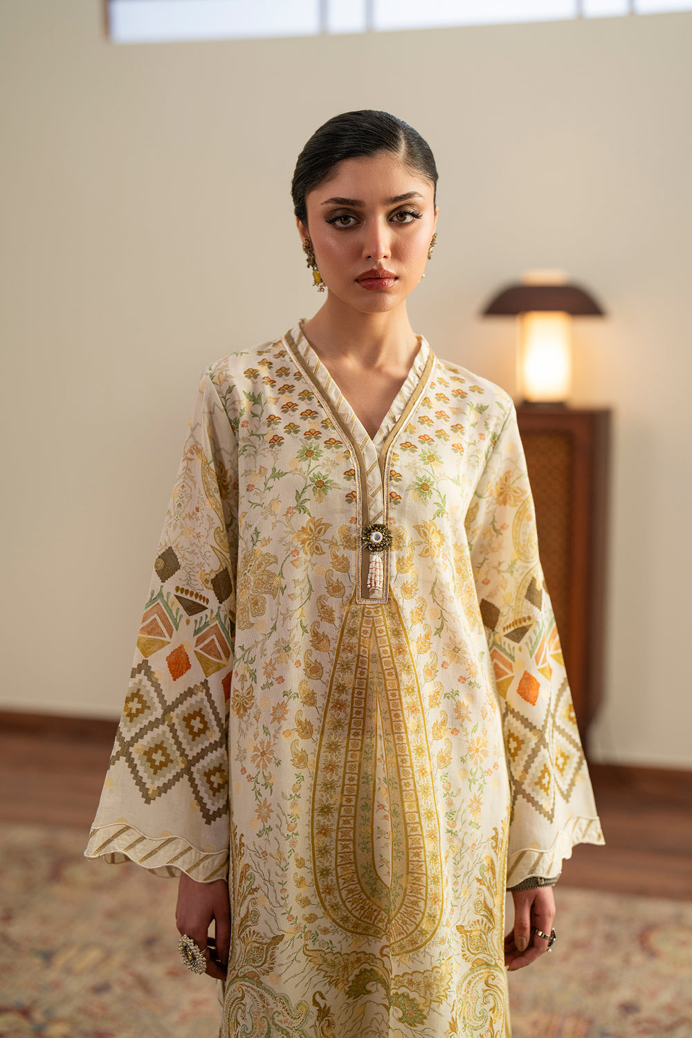 Radiating a warm, sun-kissed charm, this cream-based embroidered suit features a captivating blend of traditional and geometric artistry. The long-line shirt is detailed with a central paisley-inspired print and intricate threadwork along the V-neckline. Its standout flared sleeves showcase bold diamond motifs in earthy mustard and ochre tones. Paired with ivory trousers featuring a delicate, scalloped lace hem, this ensemble offers a graceful and polished aesthetic for any festive occasion.
