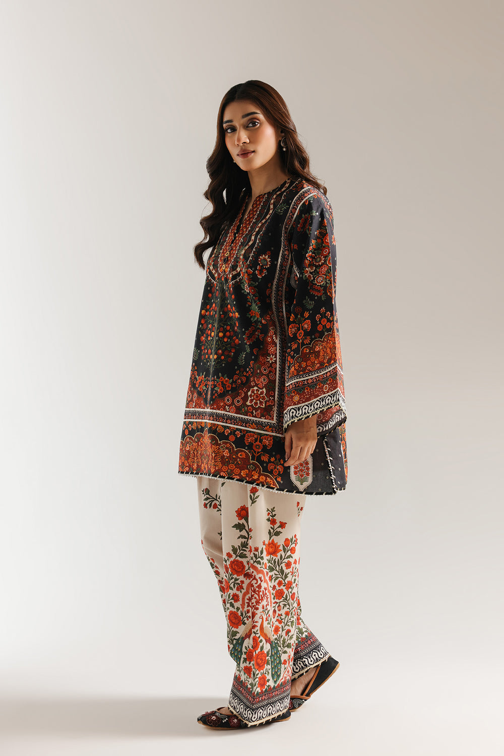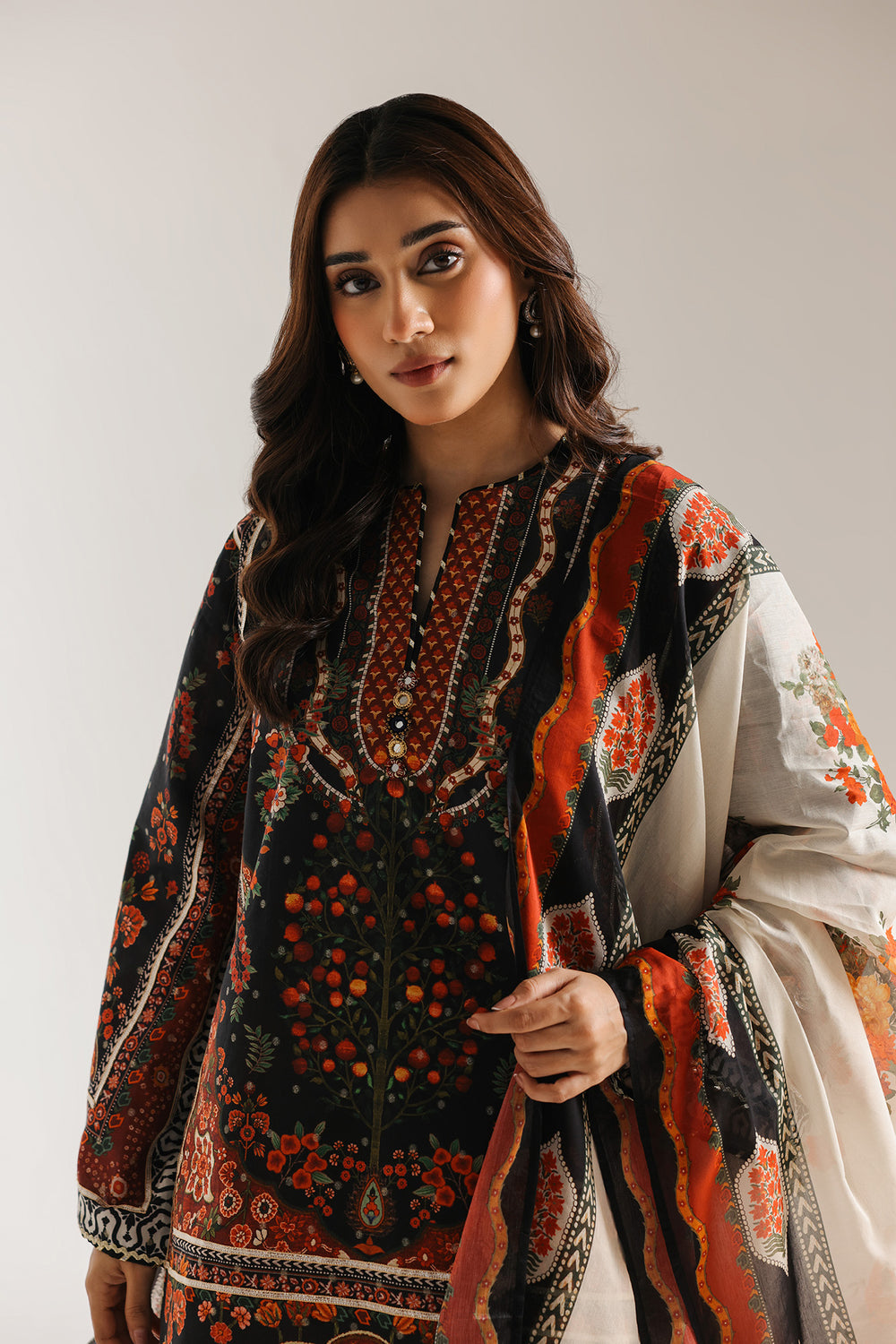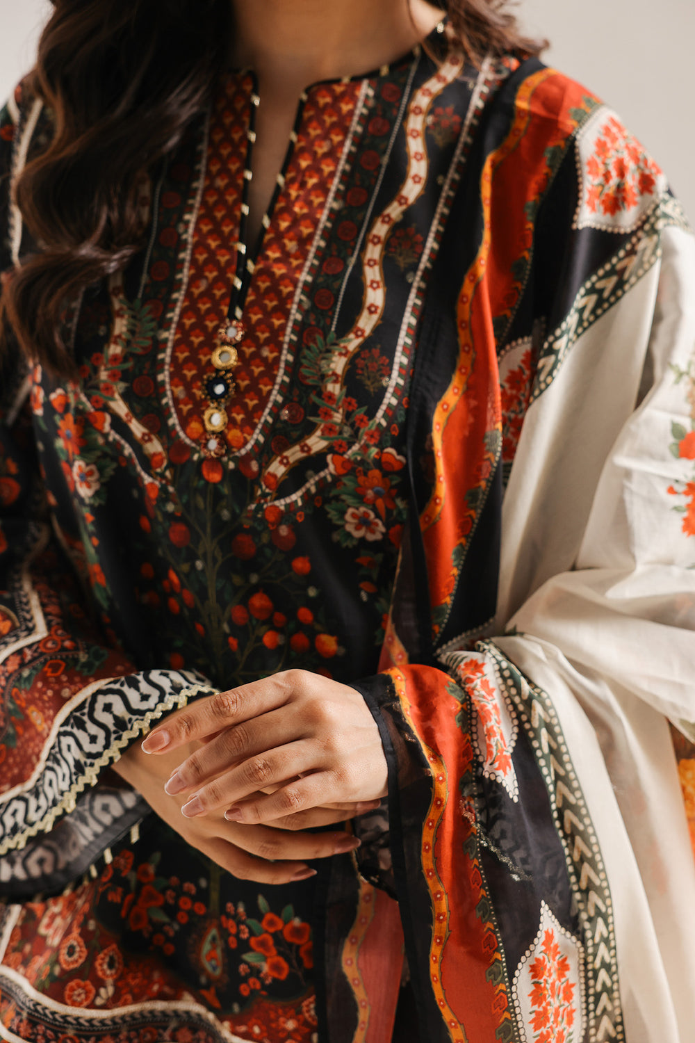 This embroidered suit is a high-contrast, three-piece ensemble that blends bold patterns with traditional craftsmanship. The set features a mid-length, long-sleeved shirt with a black base, heavily adorned with a vibrant floral and geometric print in shades of orange, red, and sage green. A structured V-neckline is highlighted with subtle mirror accents. To balance the dark bodice, the outfit is paired with cream-colored wide-leg shalwar featuring a lush, multi-colored floral print and a coordinating black border at the hem. A matching cream dupatta with a bold orange and black border completes the look, adding an airy layer to the sophisticated silhouette. This ensemble is a perfect choice for festive events, offering a modern take on classical floral motifs.