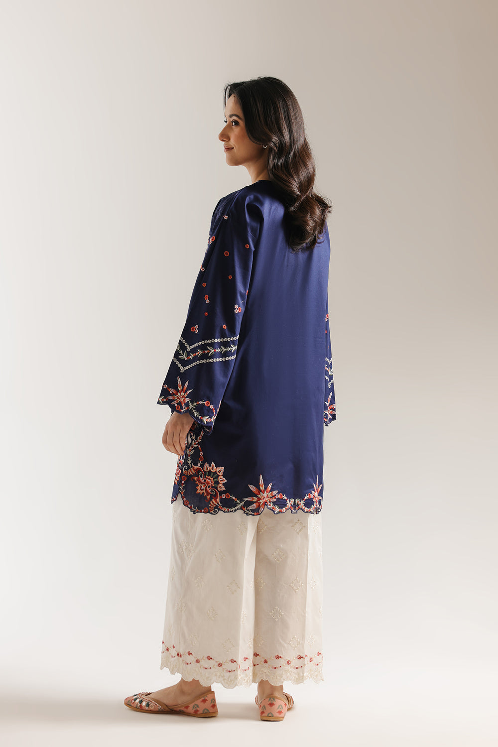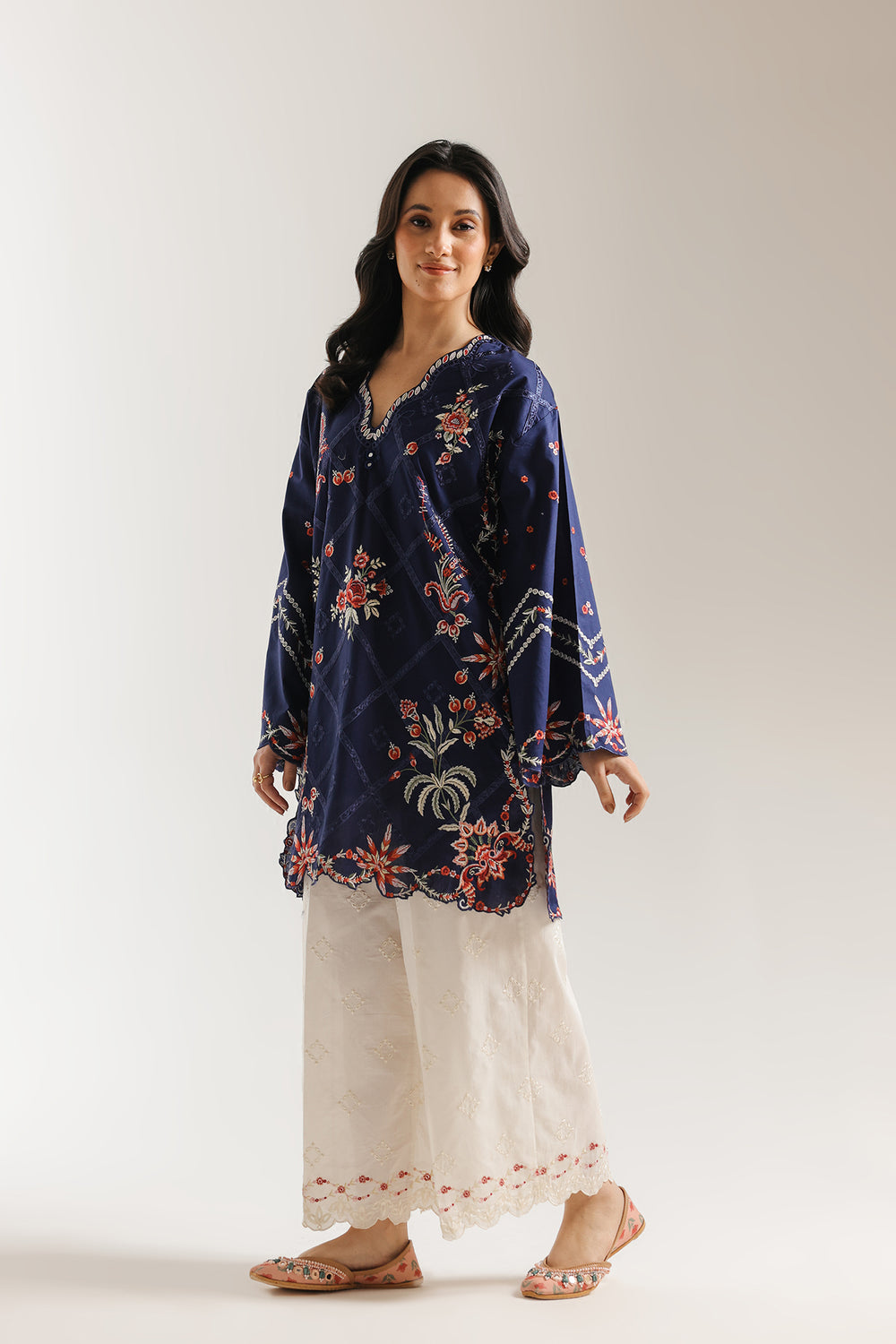 This striking embroidered suit presents a bold contrast of deep navy and pristine white with masterful artisanal detail. The navy kurta features a flattering V-neckline and scalloped hem, embellished with an intricate lattice pattern and vibrant floral embroidery in red, peach, and white tones. Bell-style sleeves showcase horizontal lace inserts with matching scalloped edges, creating a cohesive design narrative. The accompanying white wide-leg trousers are delicately finished with refined Chikankari or laser-cut embroidery at the hem, offering an airy counterpoint to the richly adorned top. This ensemble balances dramatic color contrast with sophisticated embroidery work, making it an exceptional choice for festive occasions and formal celebrations.
