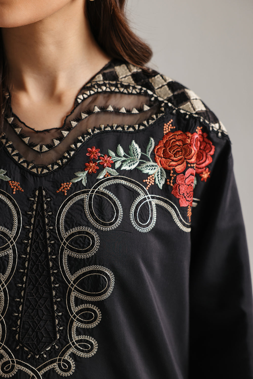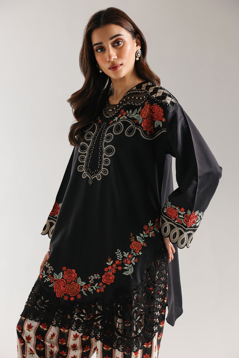 Make a bold and dramatic statement with this jet-black two-piece suit, featuring a longline shirt and contrasting patterned shalwar. The shirt is designed with a unique sheer V-neckline insert and features elaborate ivory scrollwork embroidery alongside vibrant red rose motifs blooming across the shoulders, cuffs, and hem. A heavy, wide laser-cut lace border adds a sophisticated, textured finish to the shirt’s hemline. The ensemble is paired with voluminous wide-leg shalwar trousers featuring a striking vertical striped and floral bud print in red, black, and ivory, offering a playful yet refined contrast to the structured top.