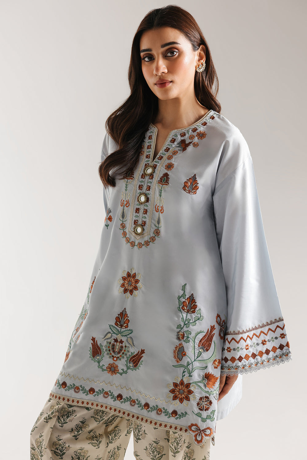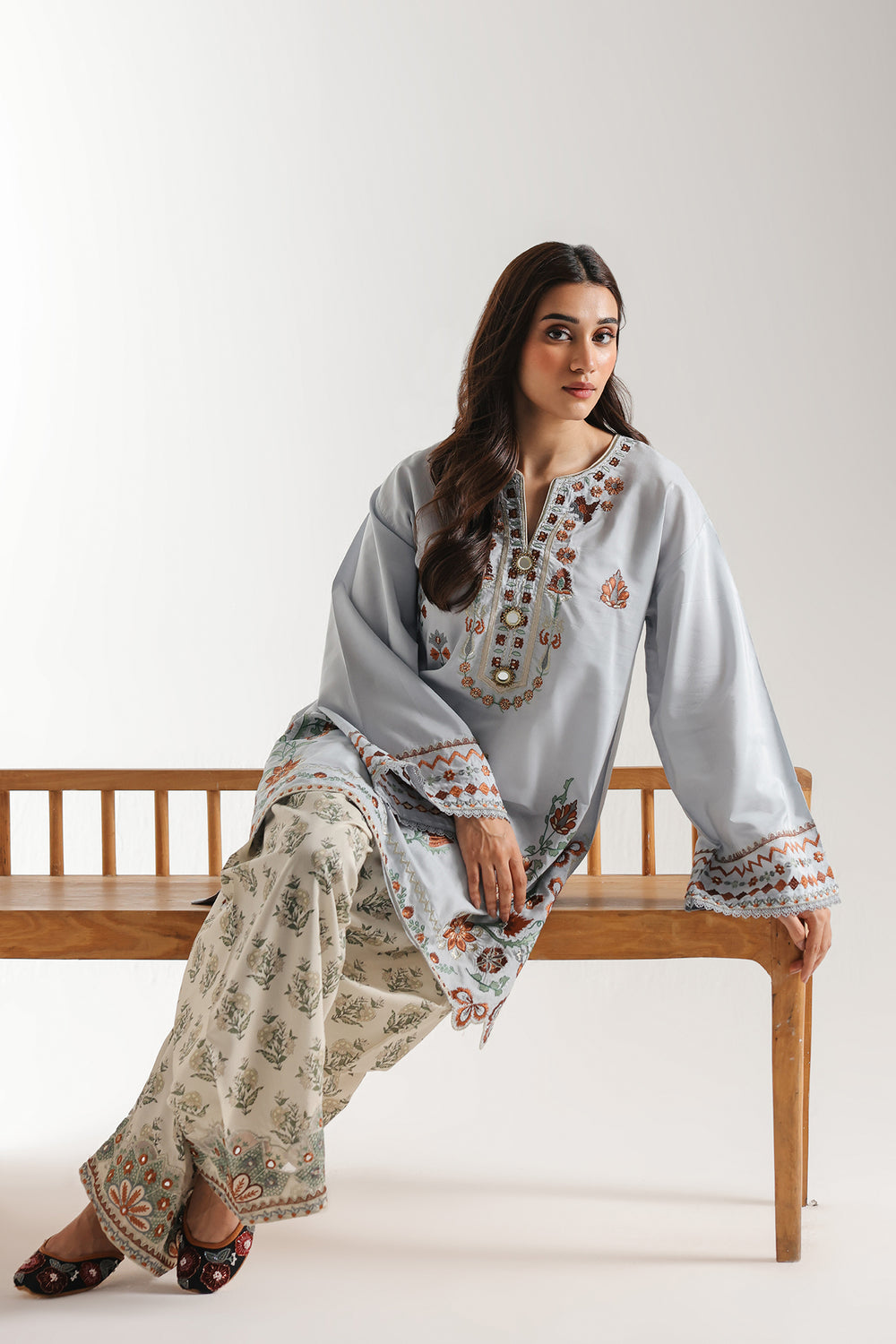 Step into a world of serene elegance with this sky-blue embroidered suit. The shirt features delicate earthy floral patterns and a beautifully detailed neckline, while the flared shalwar showcase a vintage-inspired block print. It’s a refreshing, ethereal look that blends traditional motifs with a breezy, contemporary silhouette for any occasion.