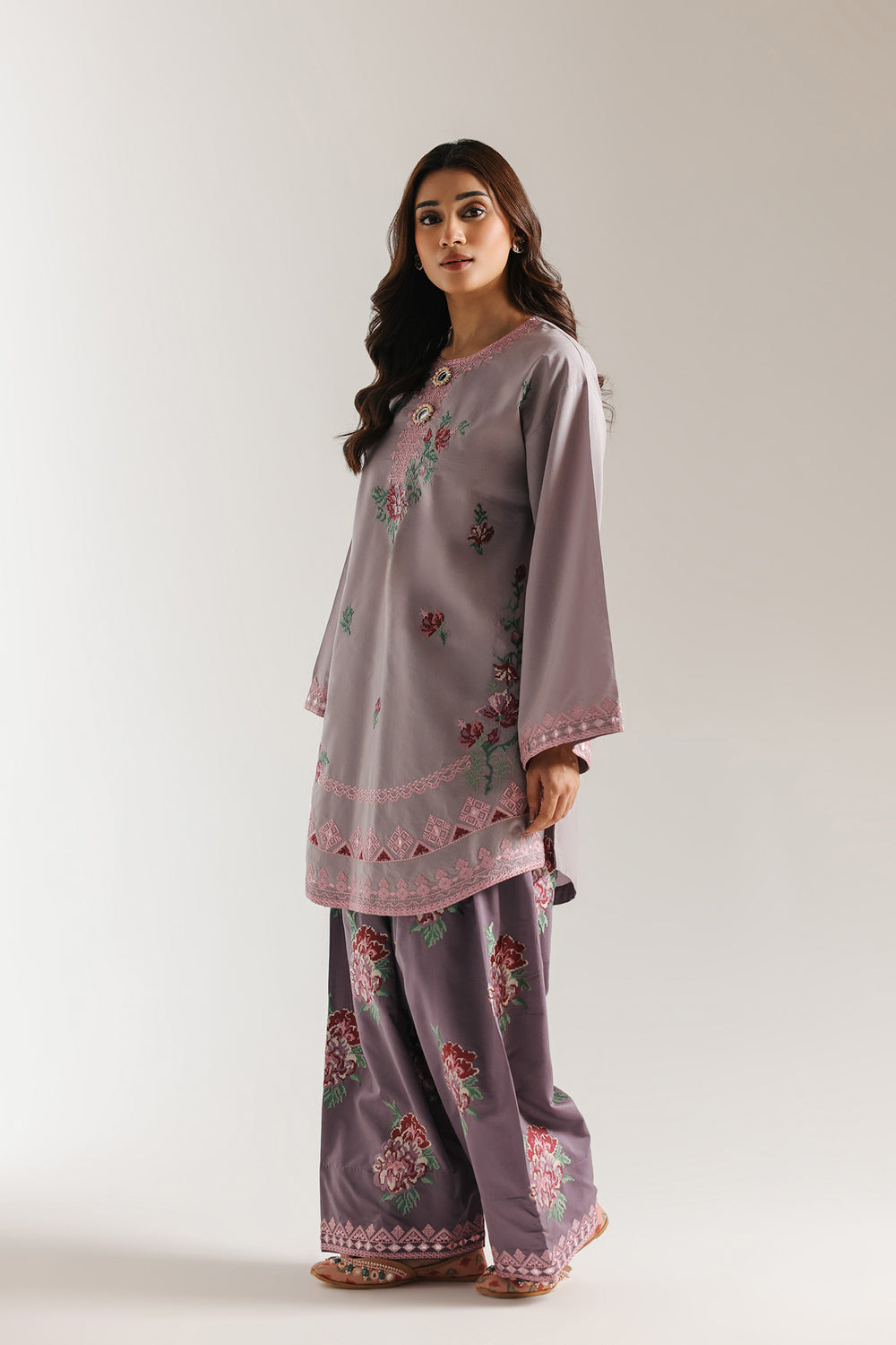 Step into a world of whimsical elegance with this enchanting mauve embroidered suit, a perfect harmony of playful design and sophisticated craftsmanship. The tunic features a soft, muted purple hue, detailed with vibrant floral embroidery and a unique curved hemline adorned with intricate lace patterns. This artistic flair extends to the voluminous wide-leg shalwar, which showcase bold, oversized floral motifs that create a stunning visual impact with every step. Complete with a delicate pink border and thoughtful accents, this ensemble is an ideal choice for those seeking a fresh, feminine look for festive daytime gatherings and social soirées.