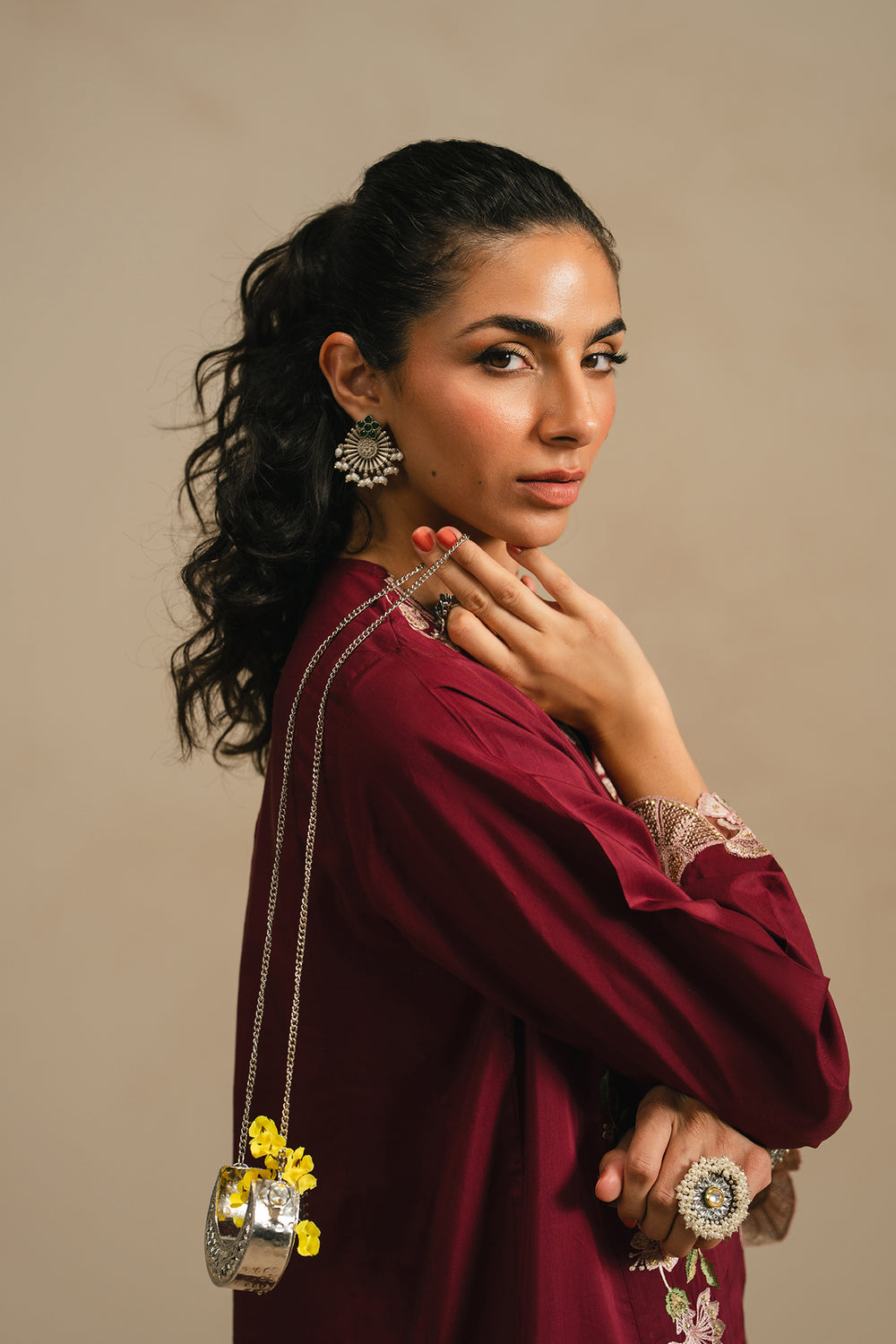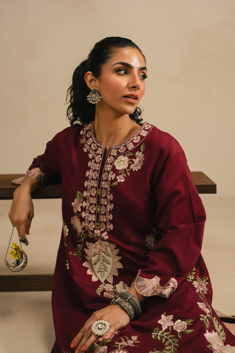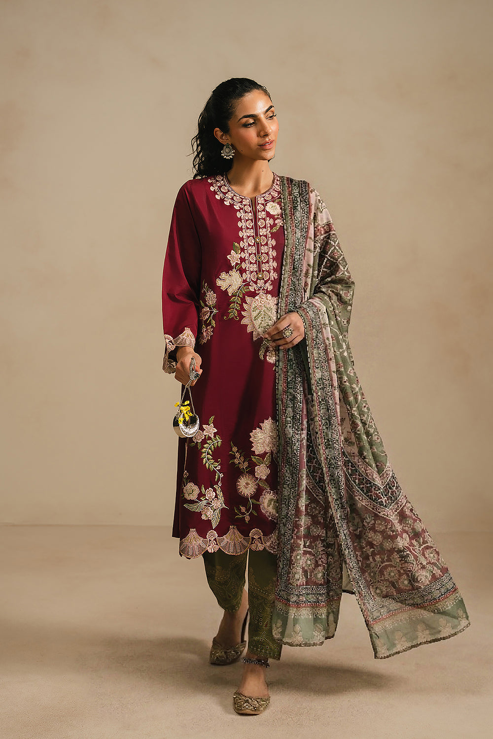 Exude sophisticated charm in this rich burgundy embroidered suit. The knee-length tunic is adorned with ivory floral threadwork and ornate traditional motifs, featuring an exquisite laser-cut scalloped hem and cuffs. Paired with olive green trouser and a dupatta, this ensemble offers a striking and refined look for any formal celebration.