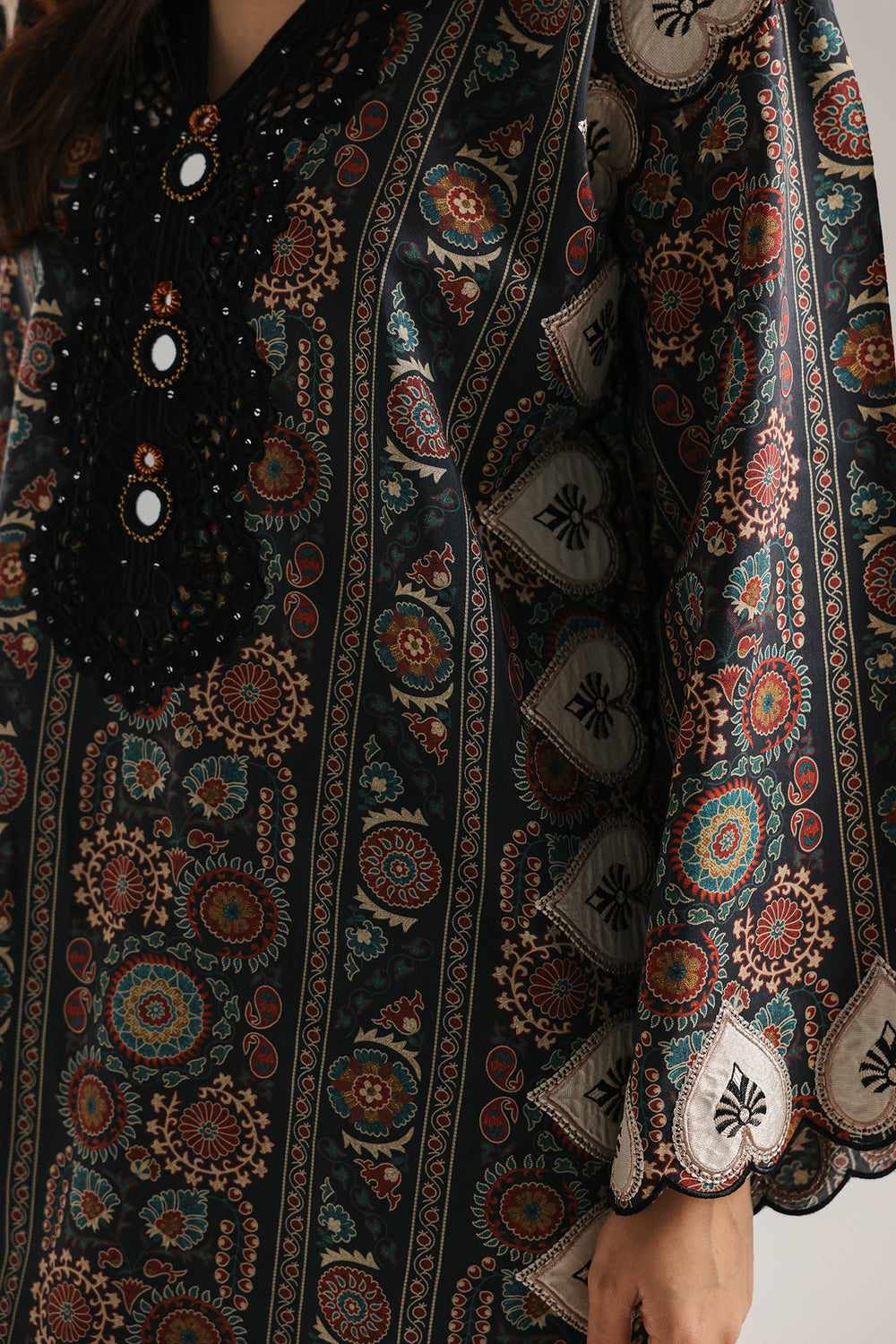 Unveil a world of dark enchantment with this stunning black suit, boasting a rich, tapestry-like floral print. The neckline is anchored by bold, obsidian-toned embroidery, while the scalloped hemline adds a touch of whimsical flair. Paired with deep maroon trouser, it’s a masterclass in moody elegance and heritage charm.