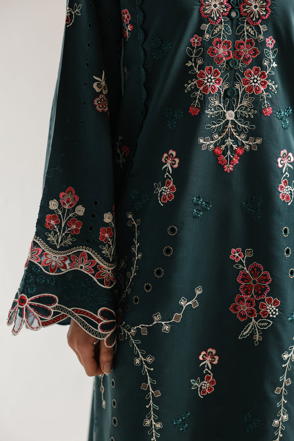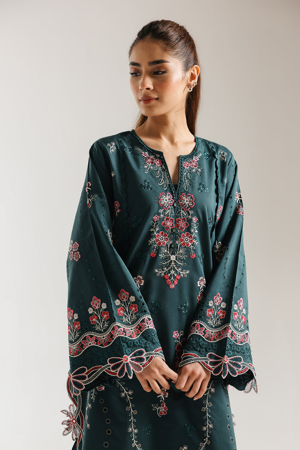 Exude an air of sophisticated grace in this deep teal two-piece embroidered suit. The long-line shirt is beautifully detailed with a split neckline and intricate floral embroidery in shades of rose and cream that trail down the front and along the wide, flared sleeves. Delicately finished with ornate scalloped laser-cut borders on the hem and cuffs, and paired with matching culotte trouser, this ensemble is a perfect fusion of traditional artistry and modern elegance.