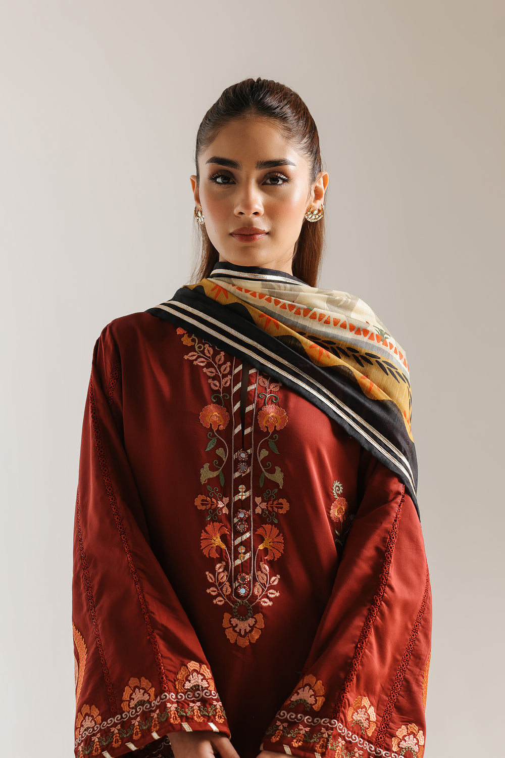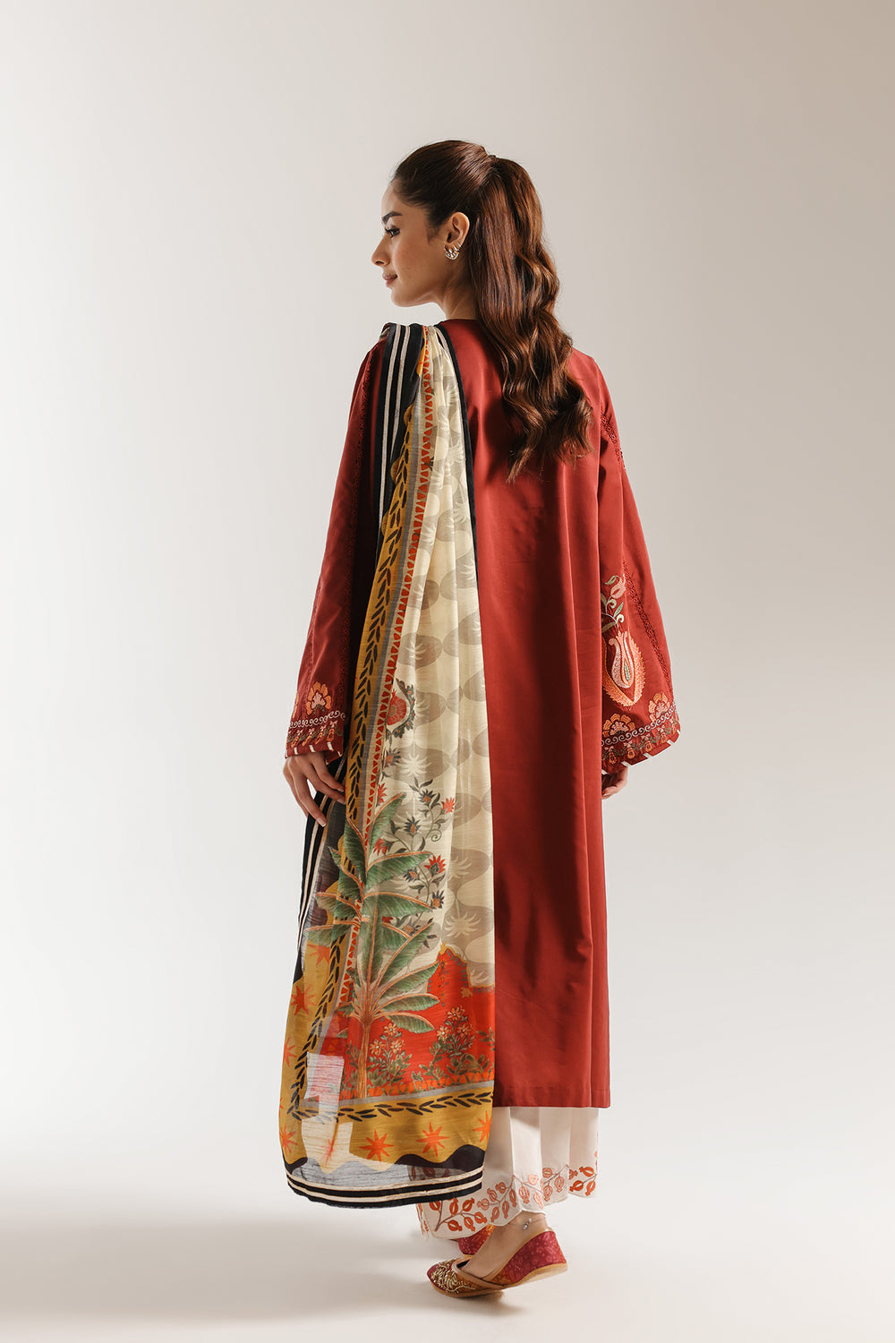 This timeless embroidered suit epitomizes graceful sophistication through its thoughtfully proportioned silhouette. The classic A-line kurta features relaxed, generously cut sleeves that prioritize comfort without sacrificing formal elegance. Heavy floral embroidery in silk thread or zari adorns both the neckline and hemline, showcasing traditional artisanal excellence. The coordinating cropped culottes or wide-leg trousers are finished with a matching embroidered scalloped border that echoes the kurta's detailing. The accompanying printed silk or chiffon dupatta introduces vibrant multi-colored patterns, providing visual contrast and dimension to the ensemble.