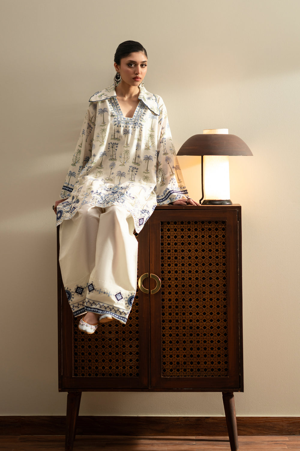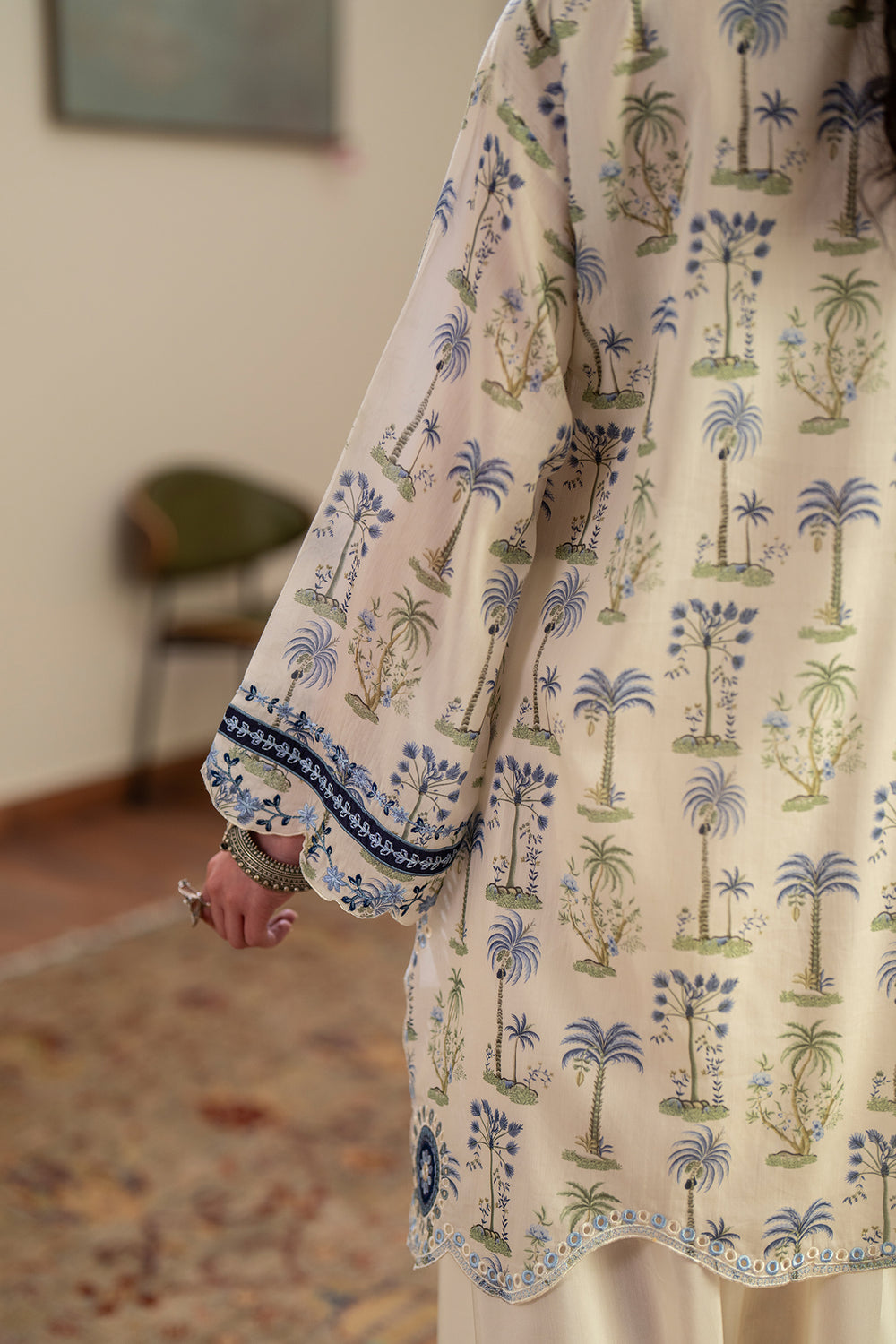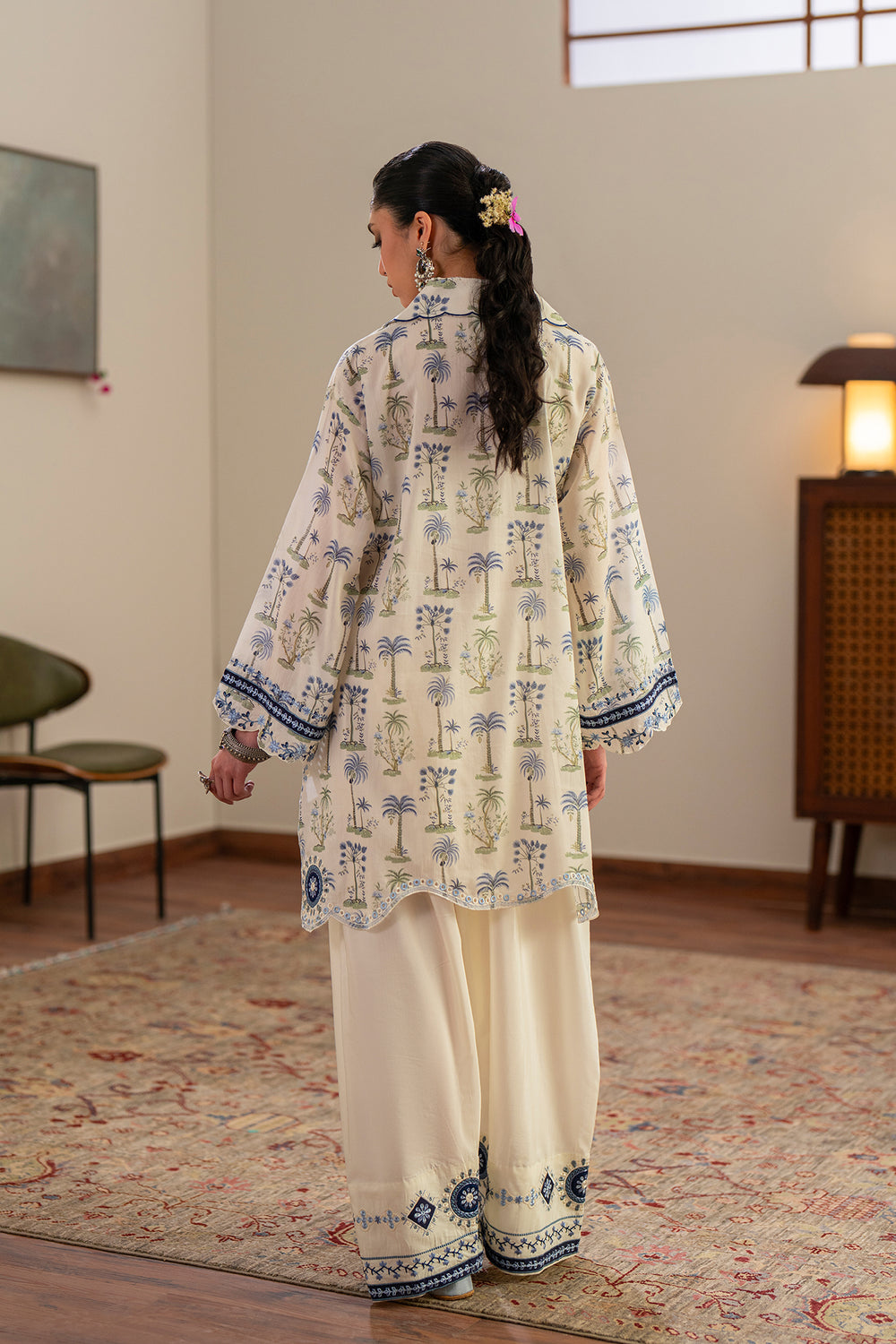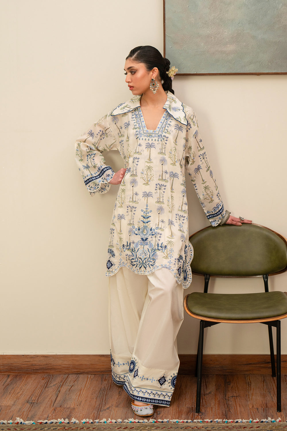 This elegant ivory embroidered suit features a refreshing botanical print inspired by serene landscapes. The shirt is detailed with intricate blue and green threadwork along the open collar, complemented by a scalloped hem and matching sleeve borders. Paired with off-white wide-leg farshi shalwar that showcase a geometric embroidered base, this ensemble offers a sophisticated, breezy look perfect for transitional seasons.
