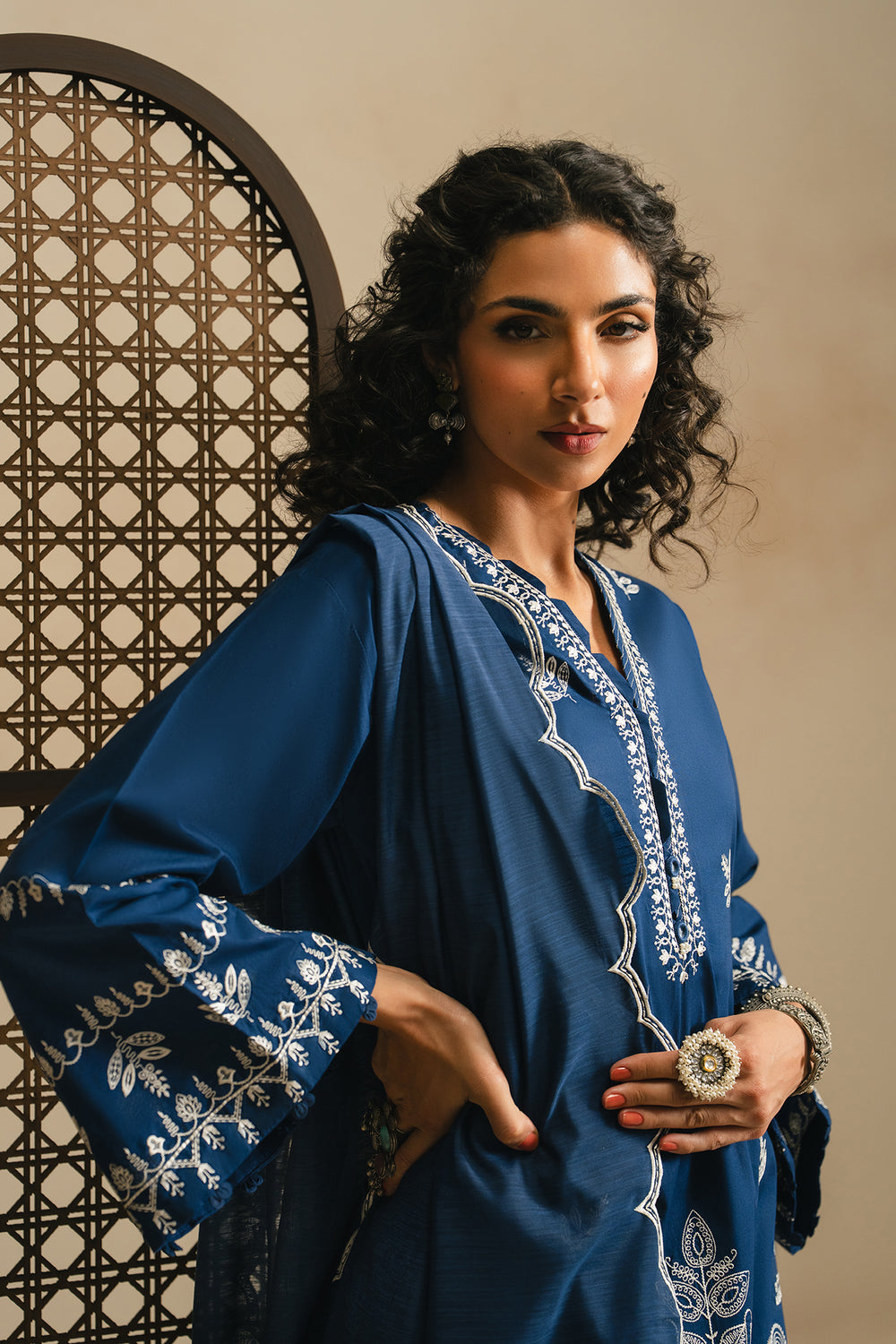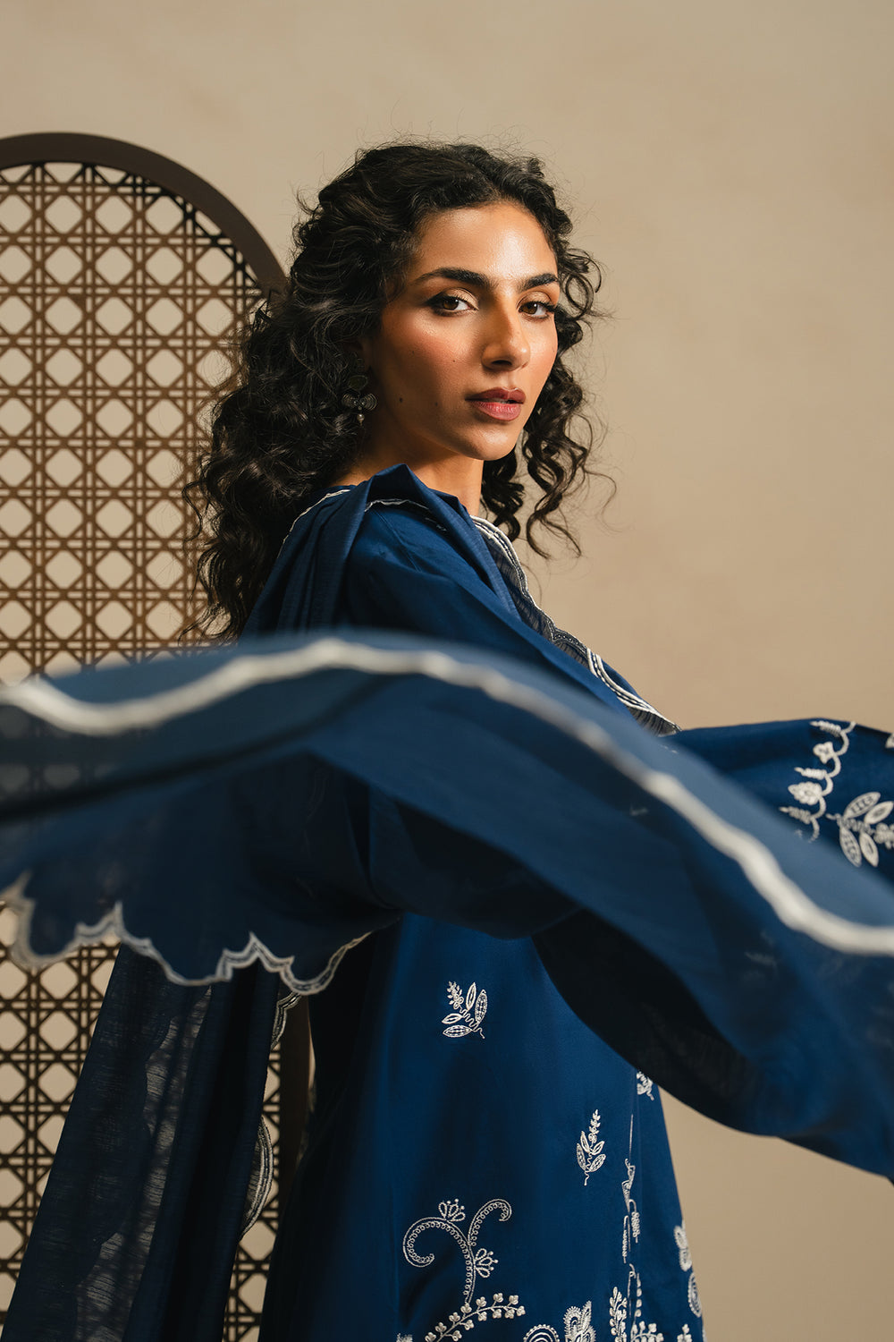 Immerse yourself in a vision of tranquil elegance with this deep navy blue embroidered suit. The tunic is meticulously detailed with delicate ivory threadwork, featuring graceful botanical motifs and a refined neckline. Accompanied by a matching dupatta with an exquisite scalloped border and coordinating voluminous shalwar with embroidered hems, this ensemble offers a sophisticated and cohesive look for any festive occasion.