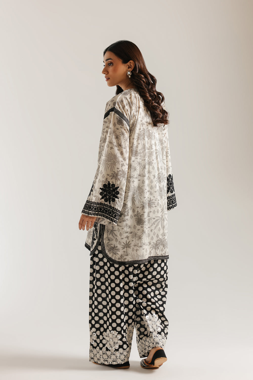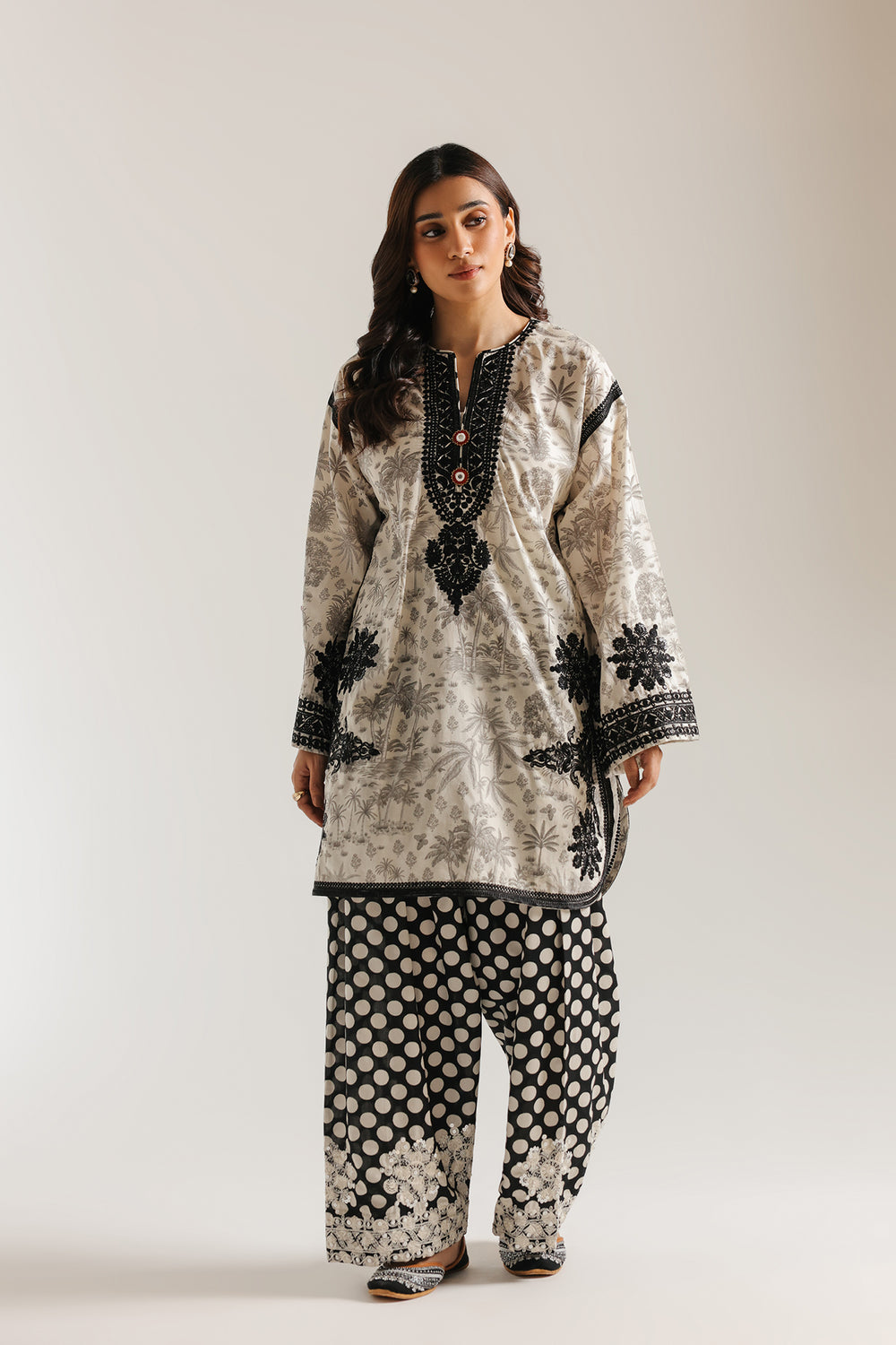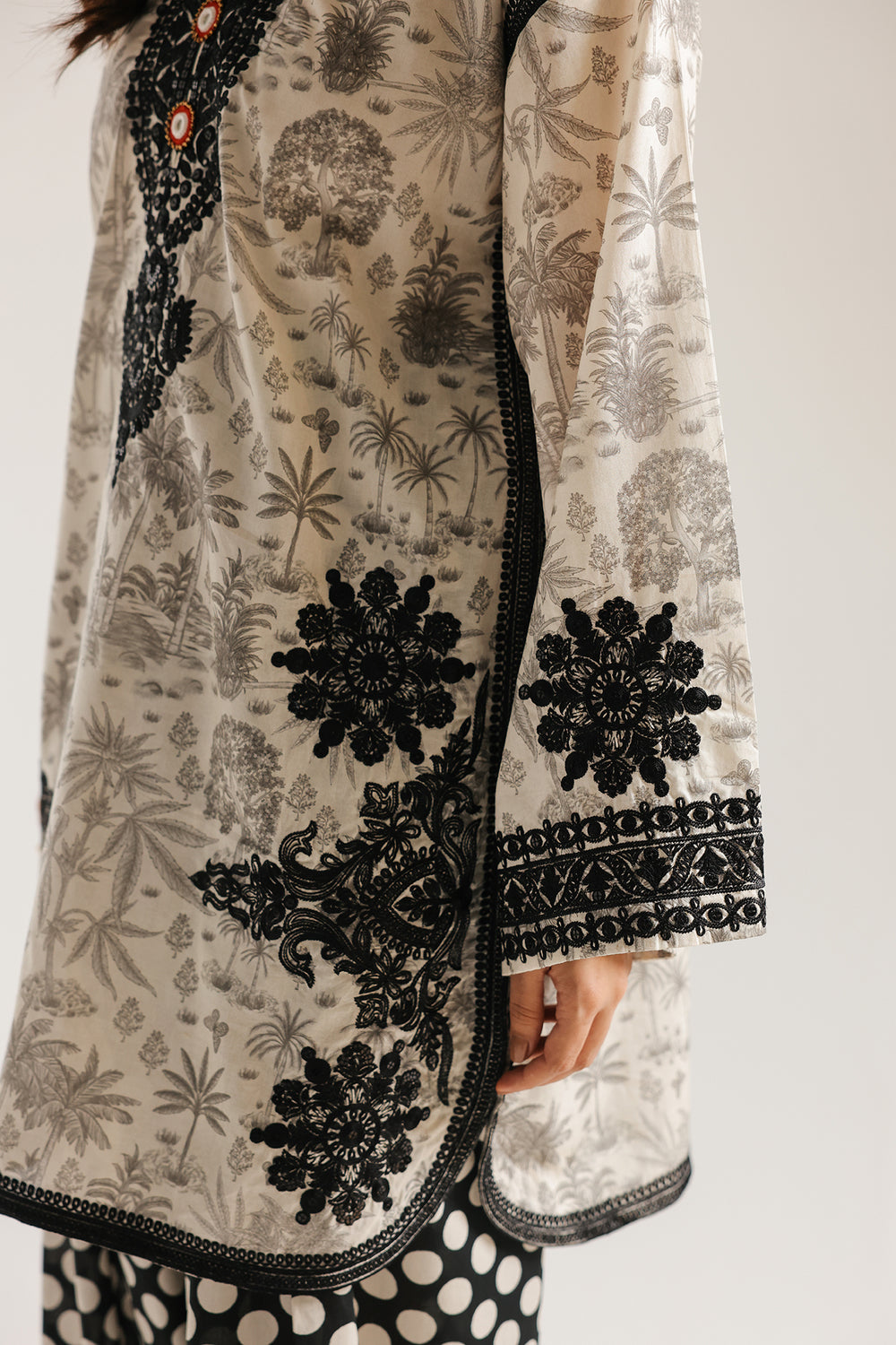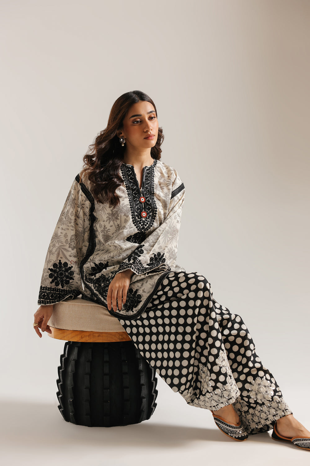 Make a sophisticated statement with this monochrome embroidered suit. The off white tunic features an intricate black neckline with contrasting button details and bold floral embroidery at the hem and sleeves. It is paired with striking black-and-white polka dot shalwar that feature a coordinated floral border, offering a playful yet refined fusion of patterns. This ensemble is the perfect choice for a contemporary and artistic formal look.