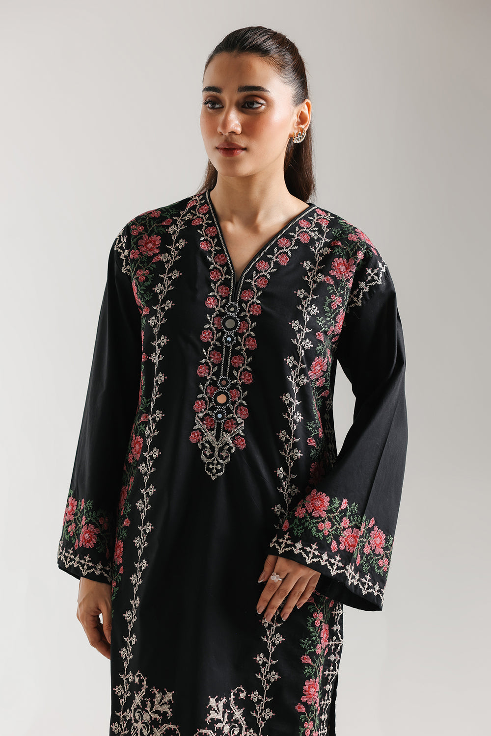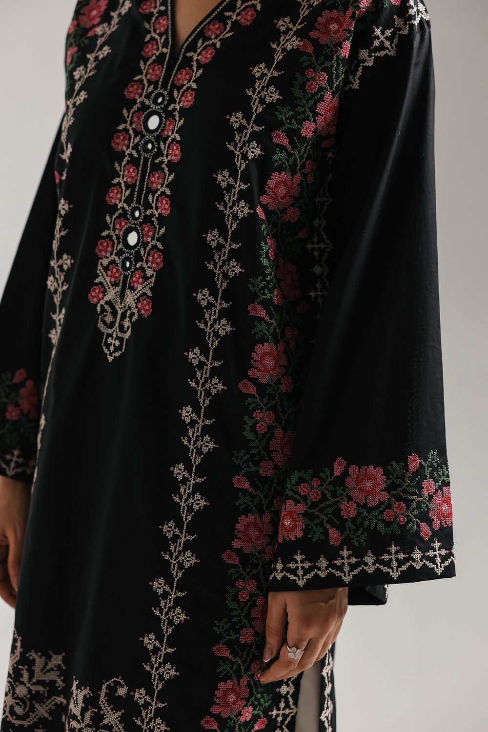 This sophisticated embroidered suit masterfully balances dramatic contrast with harmonious design. The long, straight-cut black kameez showcases exquisite floral resham embroidery in pink, red, and sage green, creating a jewel-like richness against the dark base. A flattering V-neckline and graceful bell sleeves infuse contemporary elegance into the traditional silhouette. The coordinating cream-colored wide-leg culottes provide a luminous counterpoint, anchored by a matching floral border at the hem that echoes the kameez's embroidery and establishes visual unity.