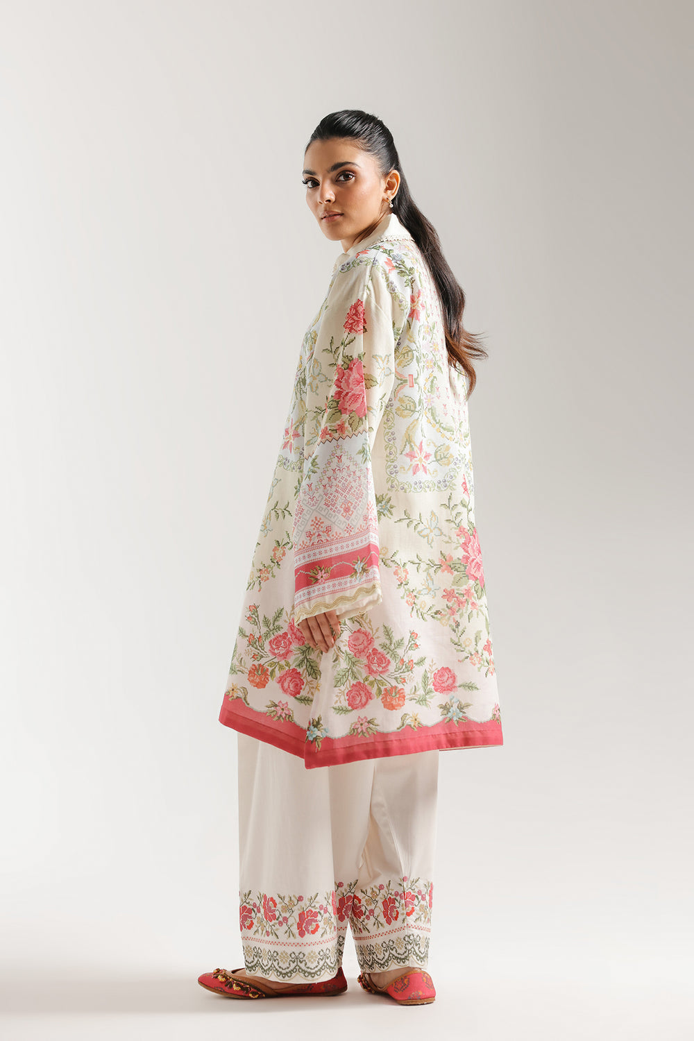 Step into refined elegance with this two-piece printed and embroidered suit, a sophisticated take on traditional ethnic wear. The off-white tunic features an all-over navy blue fan motif and a striking, architecturally-inspired embroidered bib. The navy threadwork creates a bold central focus, complemented by delicate embroidery on the sleeve cuffs. The set is uniquely paired with voluminous, oversized shalwar trousers in a contrasting navy print, featuring intricate leaf patterns that add a bohemian flair to the ensemble. Finished with a neat band collar and tailored sleeves, this look is designed for the modern woman who values both intricate detail and comfortable, high-fashion silhouettes.