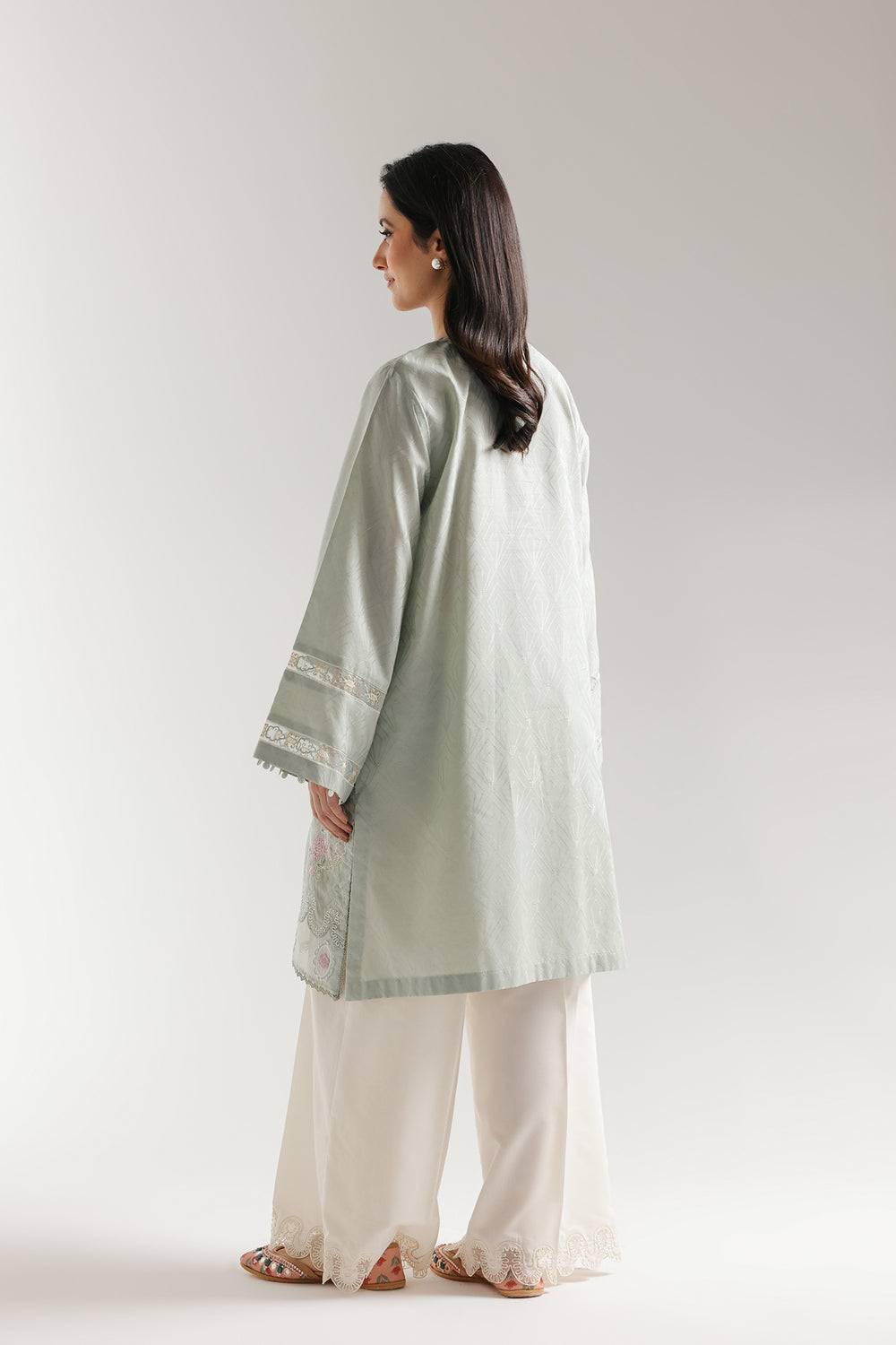 This sophisticated two-piece embroidered suit offers a serene and refreshing aesthetic in a soft sage green palette. The long-sleeved tunic is elegantly detailed with delicate floral embroidery in shades of pink and green, concentrated along the lower front and hemline for a graceful finish. A unique tassel-tie neckline adds a touch of bohemian charm, while the wide sleeves are finished with intricate lace borders and scalloped edges. The ensemble is perfectly balanced with coordinating off-white wide-leg trouser. This trouser feature a stunning, oversized laser-cut border at the hem, mirroring the intricate detailing of the tunic. Designed for the modern woman who values both comfort and artisanal detail, this outfit is an ideal choice for elegant daytime events or festive gatherings.
