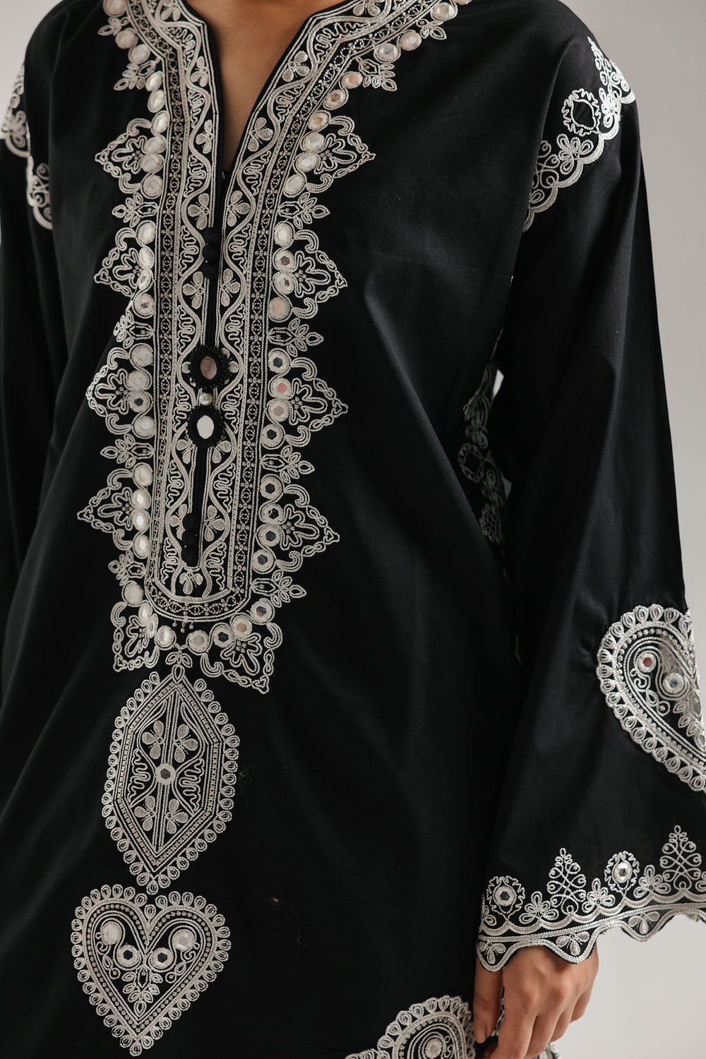 Elegant two-piece ensemble featuring a jet-black kameez in premium blend with intricate ivory embroidery. The traditional split V-neckline is adorned with bold medallion and heart motifs, extending across the chest, wide sleeve cuffs, and scalloped hemline. Paired with modern wide-leg culottes finished with matching embroidered ankle borders and delicate lace detailing. Perfect for formal occasions and celebrations.