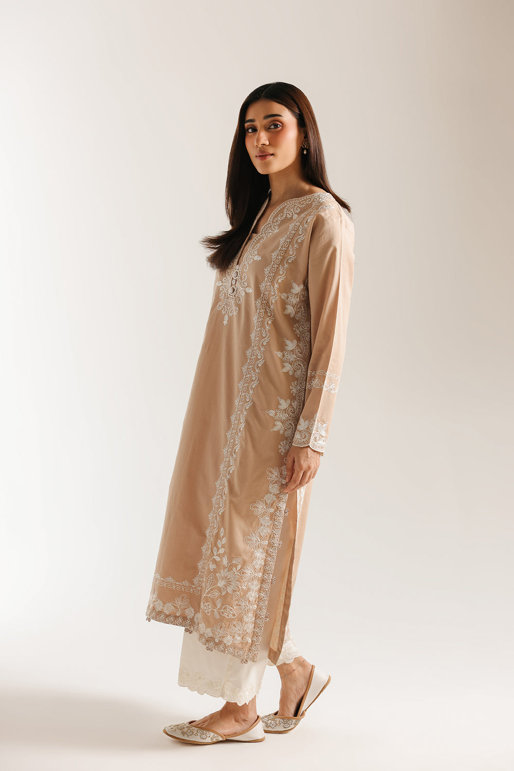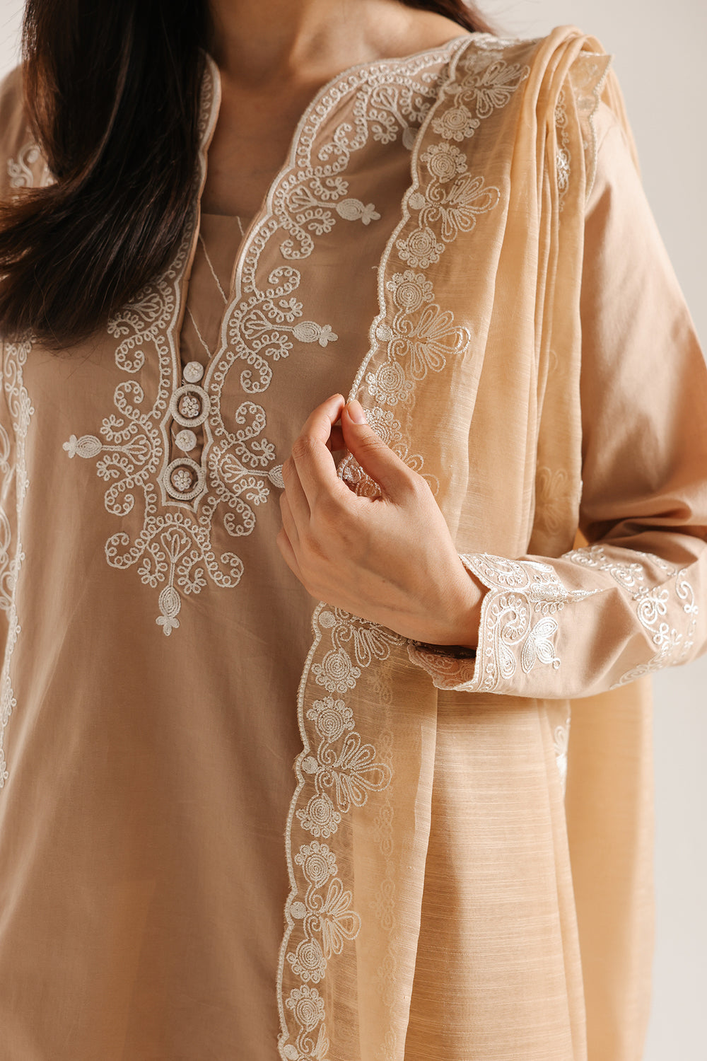 Radiate understated luxury in this elegant beige embroidered suit. The long-line shirt is beautifully detailed with delicate white threadwork tracing the neckline and vertical borders, creating a tall, graceful silhouette. Complete with a sheer, scalloped dupatta and crisp white wide-leg trouser, this ensemble is the epitome of refined, airy sophistication.