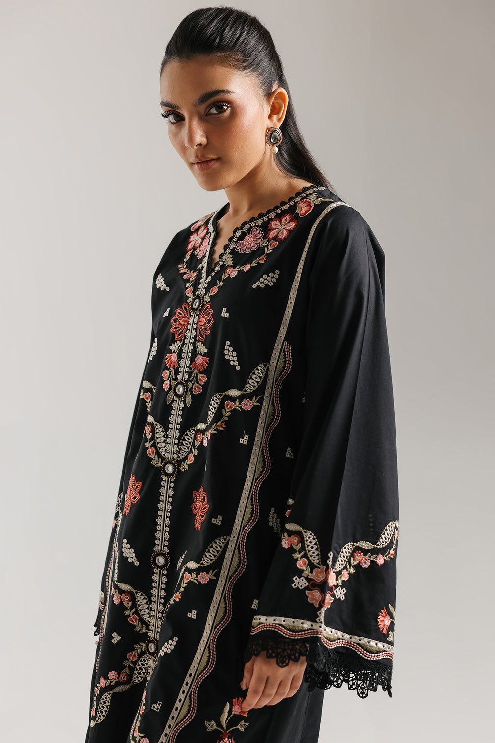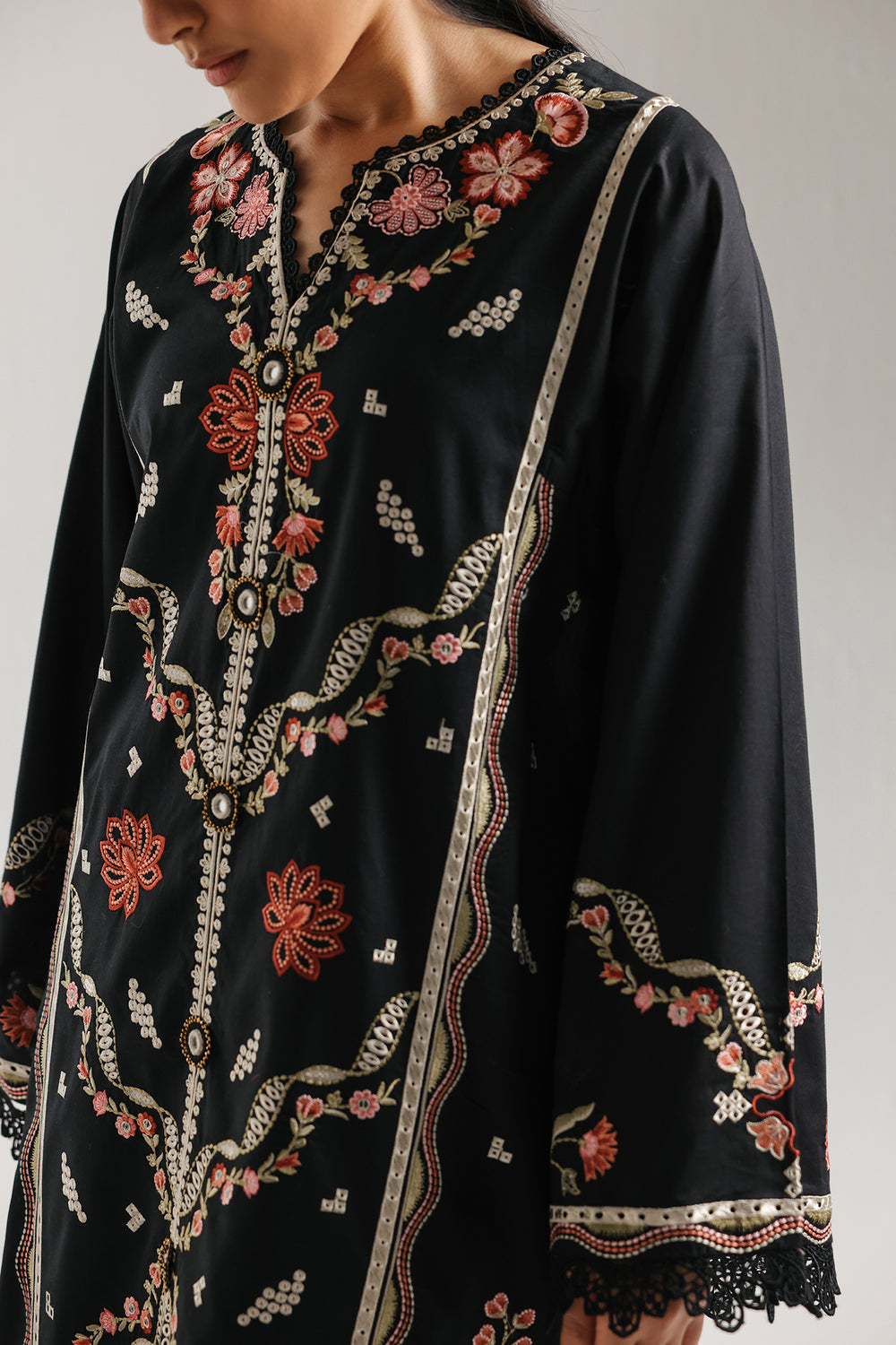 Exude effortless grace in this sophisticated two-piece jet black embroidered ensemble. The long-line tunic features intricate floral and vine embroidery in muted rose and ivory tones, meticulously arranged in a vertical symmetric layout to elongate the silhouette. Decorative button detailing accents the center front, while the wide, flared sleeves are finished with a delicate black lace trim for a touch of classic femininity. The look is completed with matching straight-fit trousers, elevated by a sheer organza panel and scalloped embroidery at the hem. Perfect for evening gatherings, this set blends traditional craftsmanship with a refined, modern aesthetic.