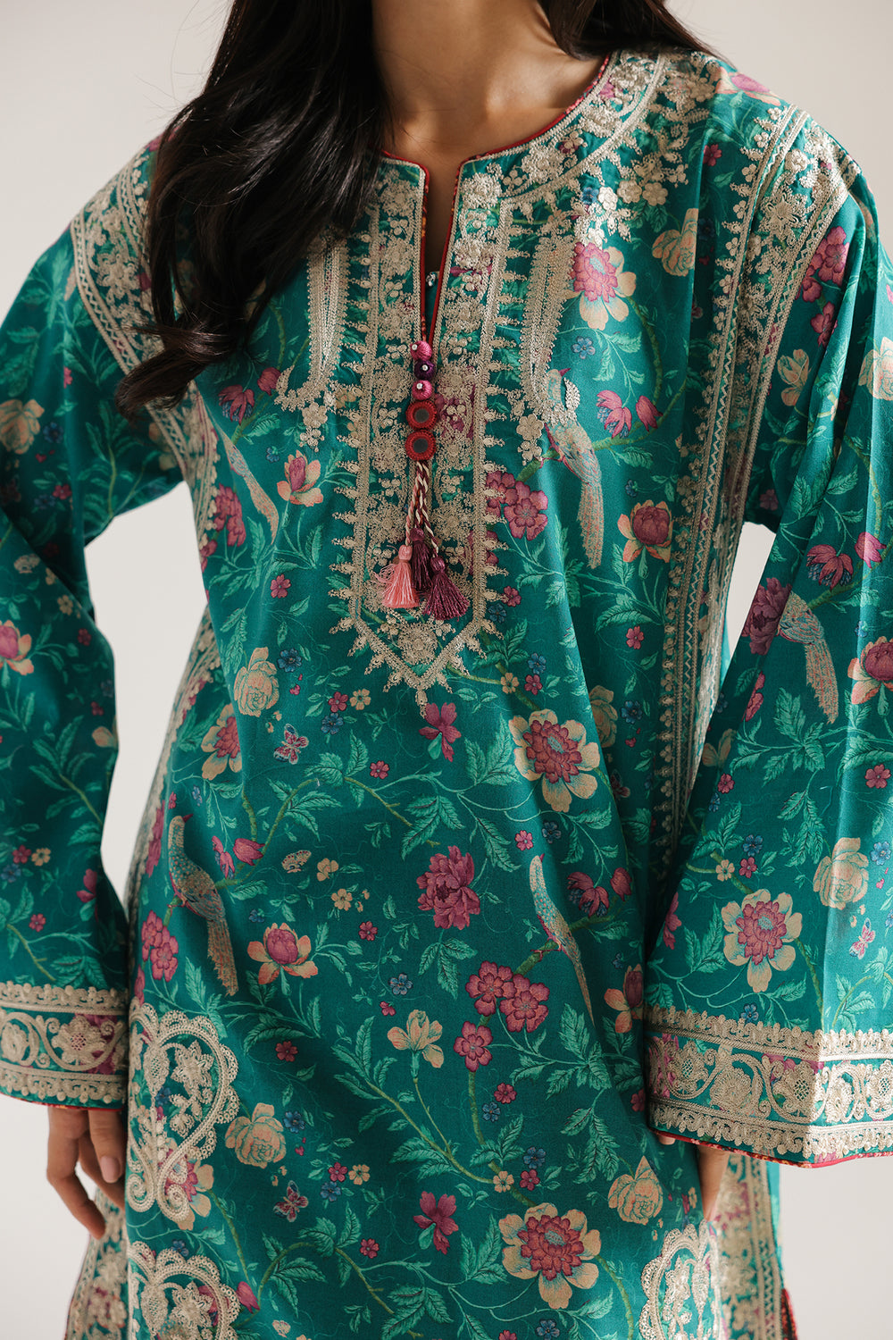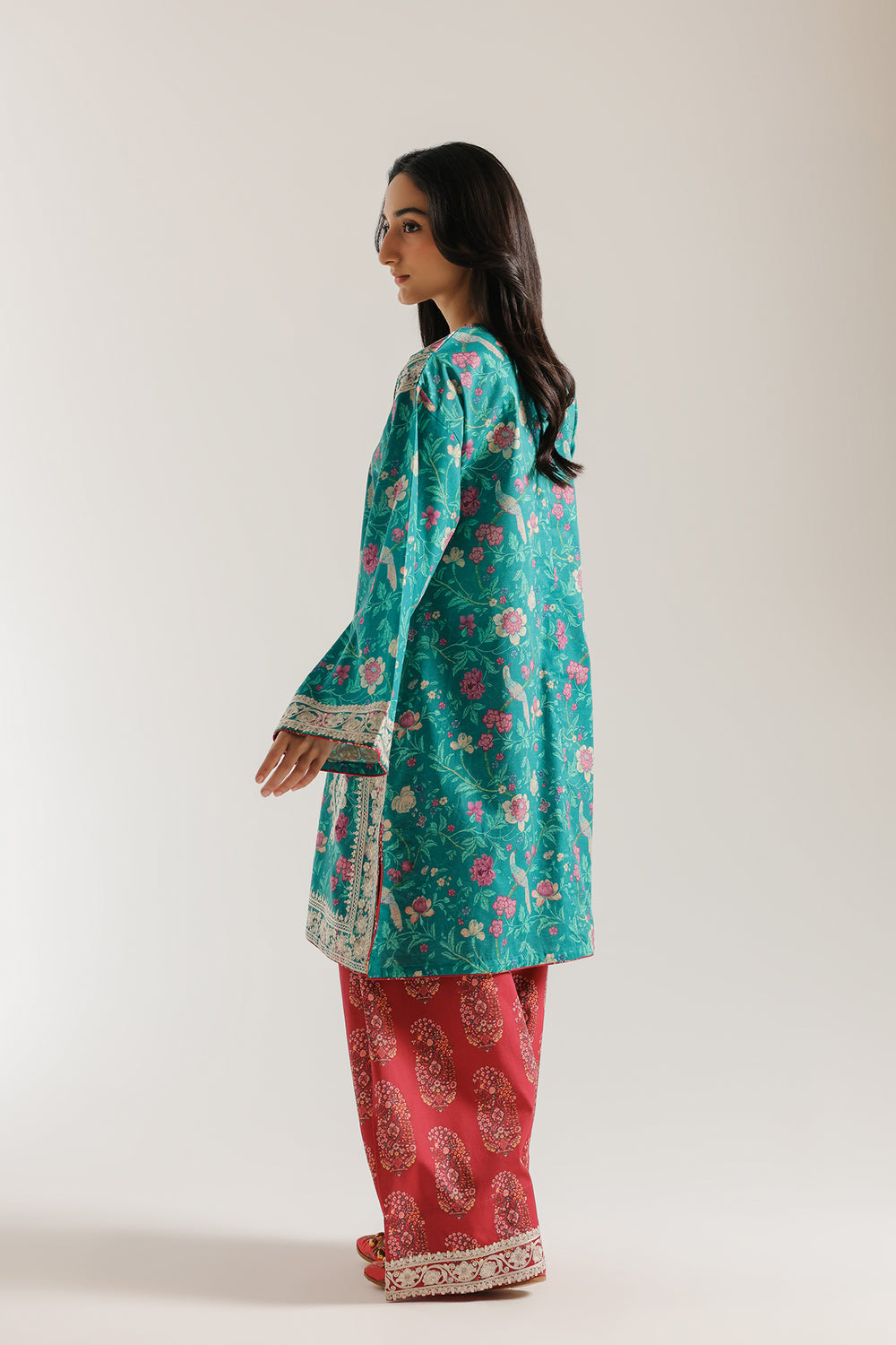 Step into a vibrant celebration of heritage with this stunning embroidered ensemble. The rich teal tunic features intricate floral motifs and delicate border detailing, paired perfectly with contrasting crimson patterned farshi shalwar. Expertly crafted for elegance and comfort, this striking suit is a timeless addition to any sophisticated wardrobe.
