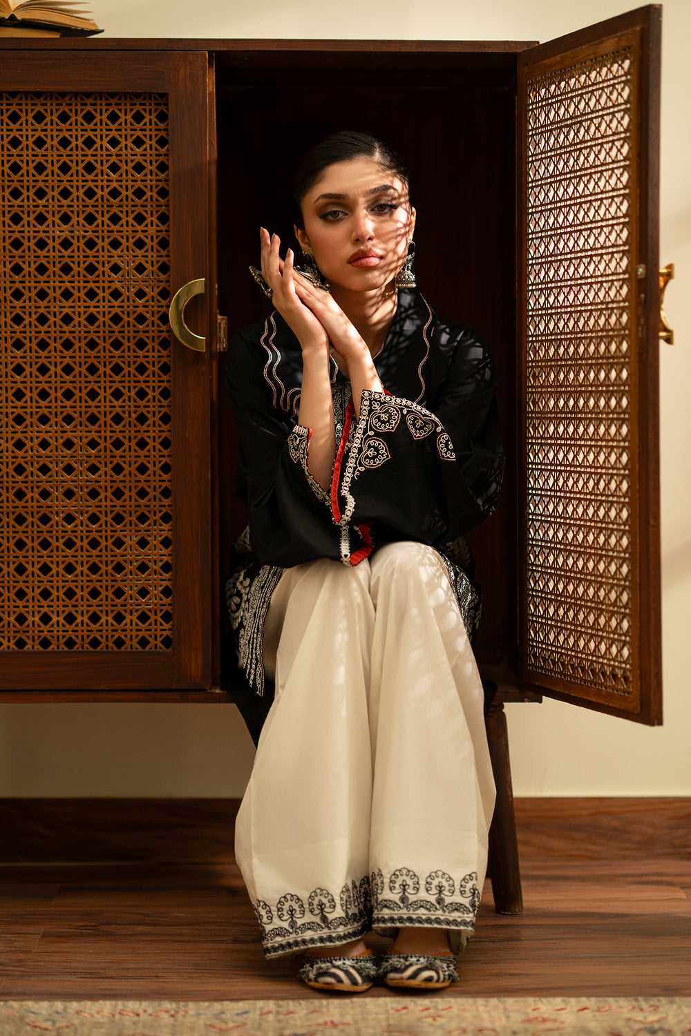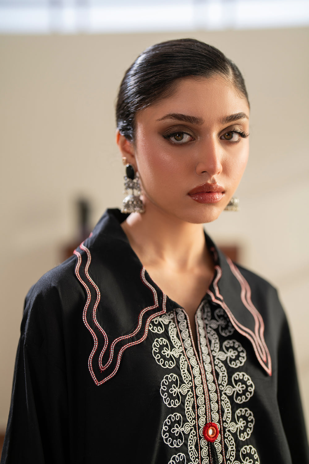 This striking black embroidered suit is a perfect fusion of bold contrast and intricate artistry. The shirt features an elaborate ivory embroidered front slit and hemline, highlighted by vibrant red button accents that add a pop of color. The oversized collar and flared sleeves are detailed with delicate threadwork, creating a strong, contemporary silhouette. Complemented by cream-colored wide-leg farshi shalwar with a matching embroidered border, this ensemble offers a sophisticated look with an artisanal edge.