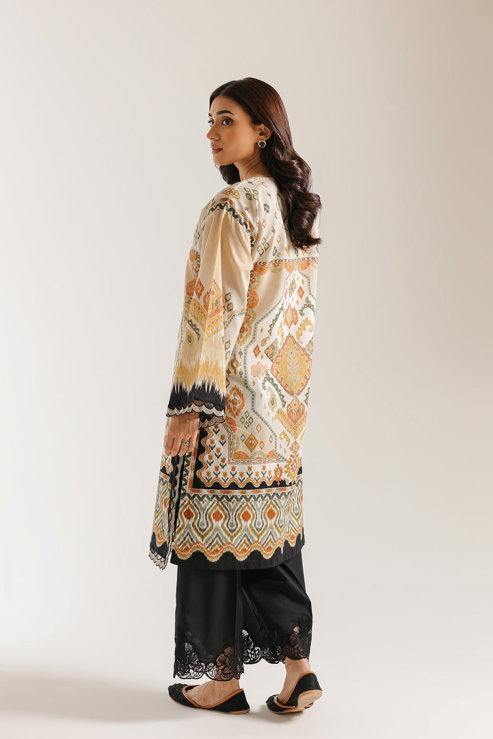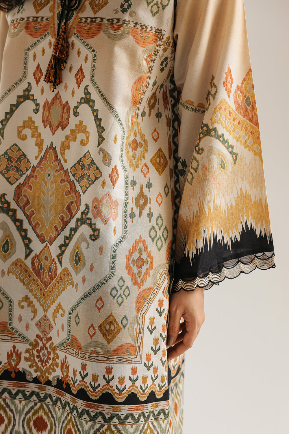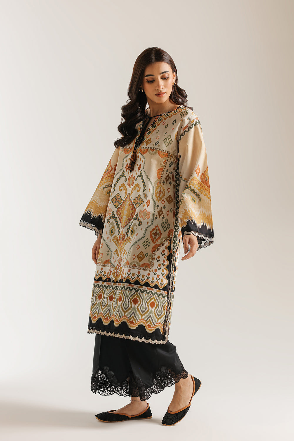 Embrace artistic flair with this beige embroidered suit, featuring a captivating blend of geometric and tribal-inspired prints in warm earth tones. The tunic is detailed with a delicate tassel at the neckline and intricate scalloped borders, while the black wide-leg trousers stand out with bold, laser-cut floral embroidery. This ensemble offers a perfect balance of contemporary style and traditional craftsmanship for a standout look.