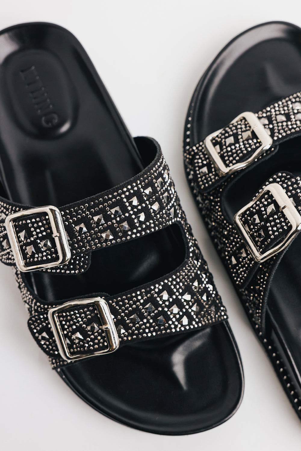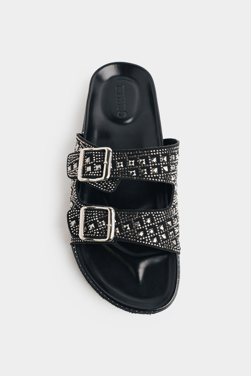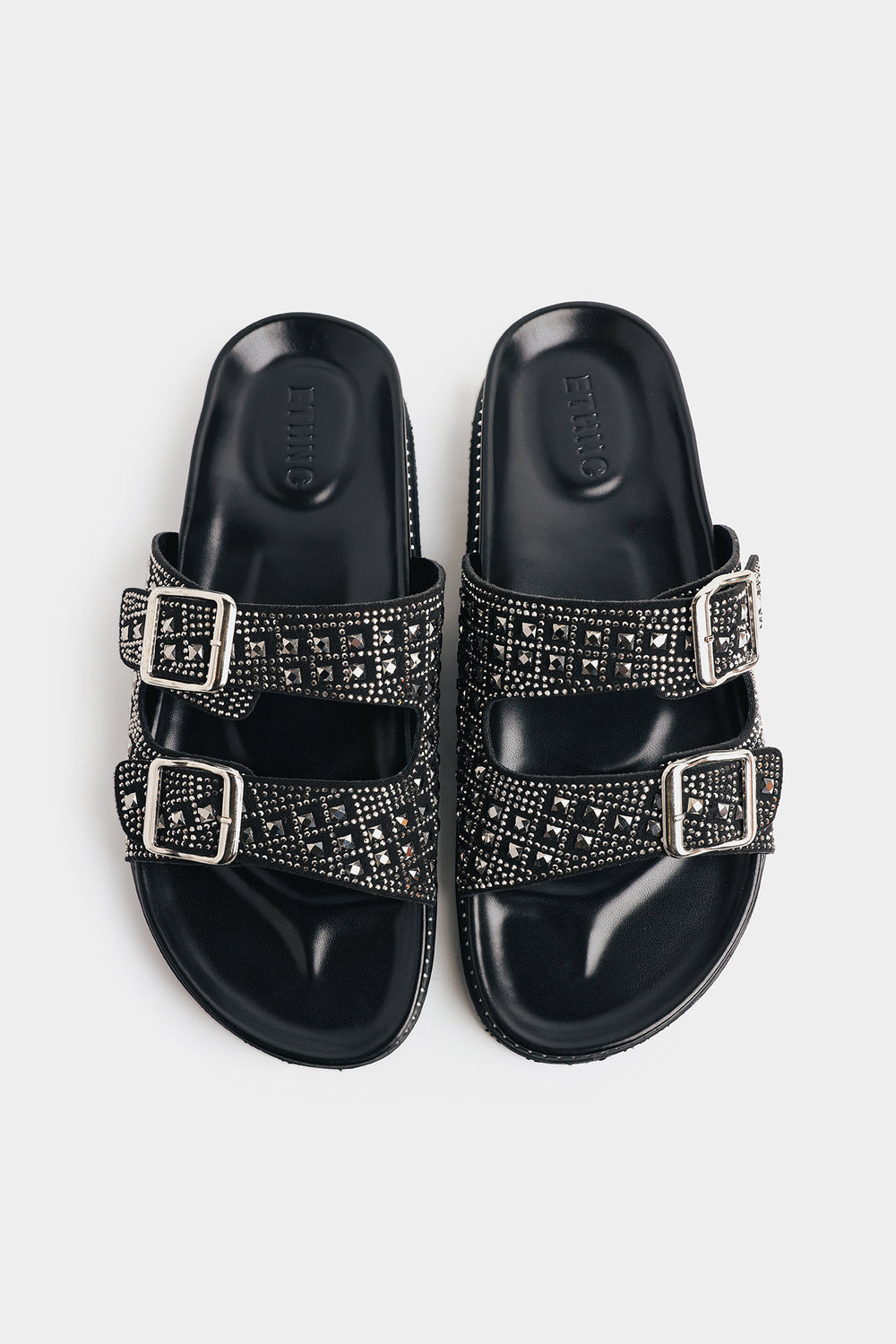 Elevate your everyday style with these stunning embellished mule slides. Featuring a chunky silhouette with a molded footbed that provides ergonomic support for all-day comfort, these shoes blend fashion with function. Two wide adjustable straps adorned with polished silver-toned buckles cross the foot, while intricate rhinestone and crystal studding in a geometric grid pattern creates a dazzling high-shine finish. Perfect for adding glamorous flair to casual or dressy occasions.