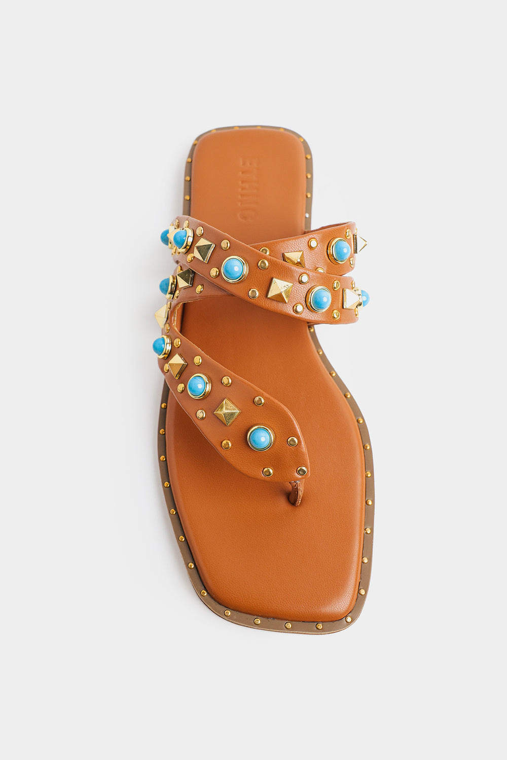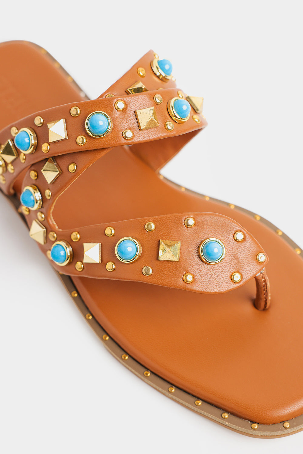 Step into effortless style with these chic tan flat sandals, designed to add a subtle statement to your everyday look. Crafted with a sleek square toe silhouette, the sandals feature a stylish double-strap upper adorned with turquoise-toned stones and metallic stud embellishments. The intricately detailed toe loop enhances both comfort and design, while the cushioned footbed ensures ease with every step. Perfect for pairing with casual outfits or summer ensembles, these sandals bring together elegance and modern flair.