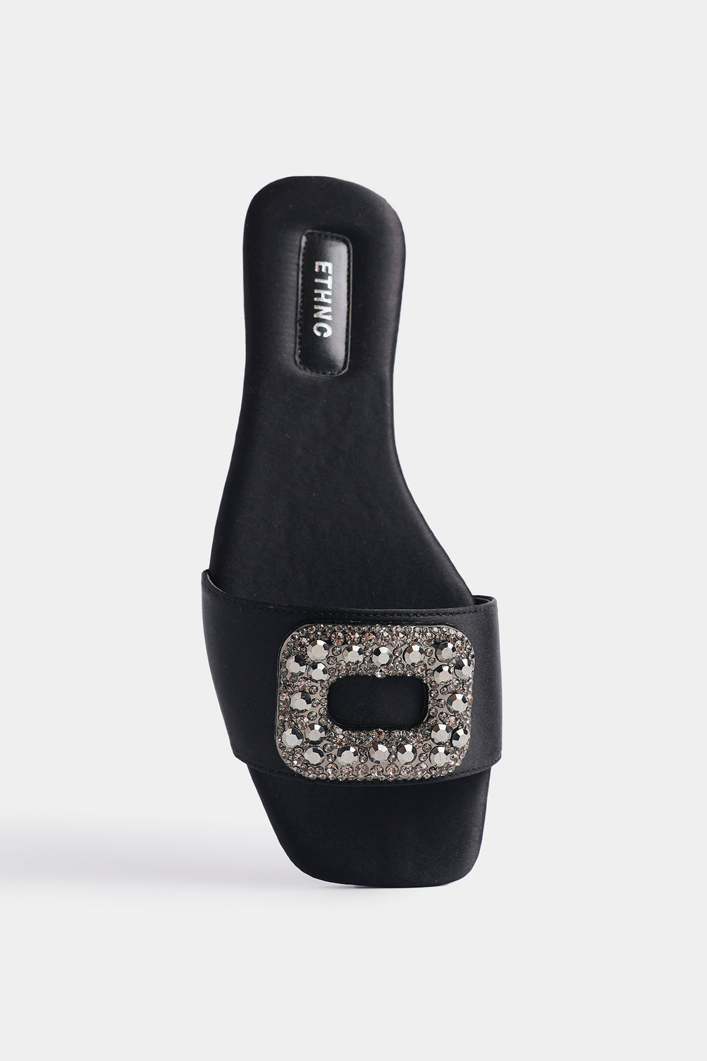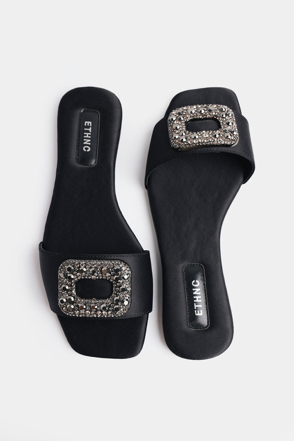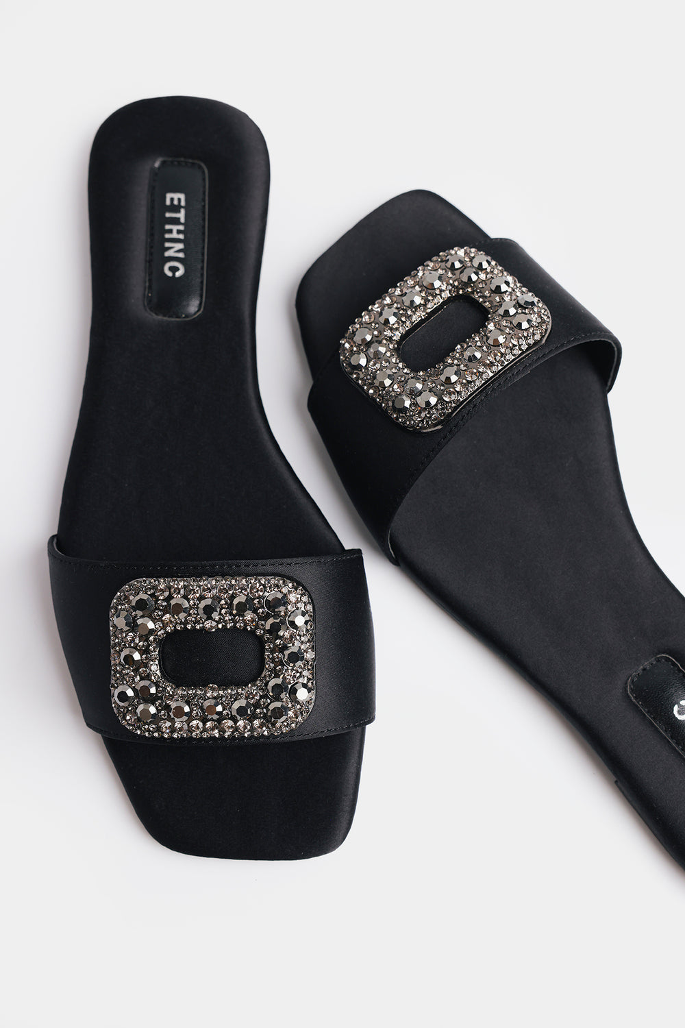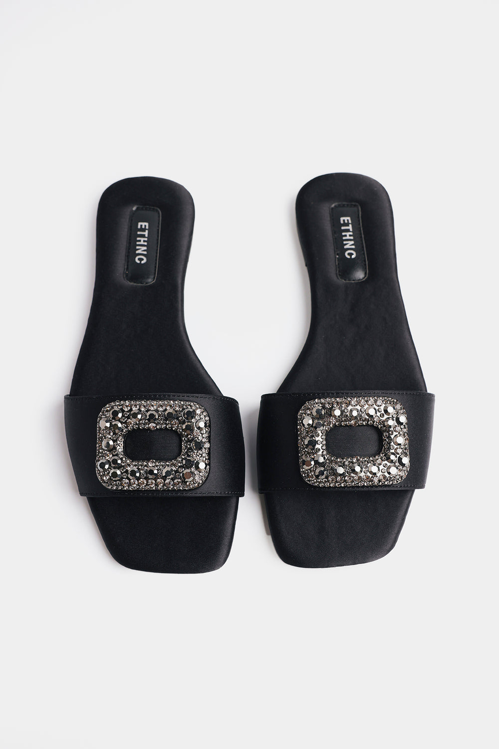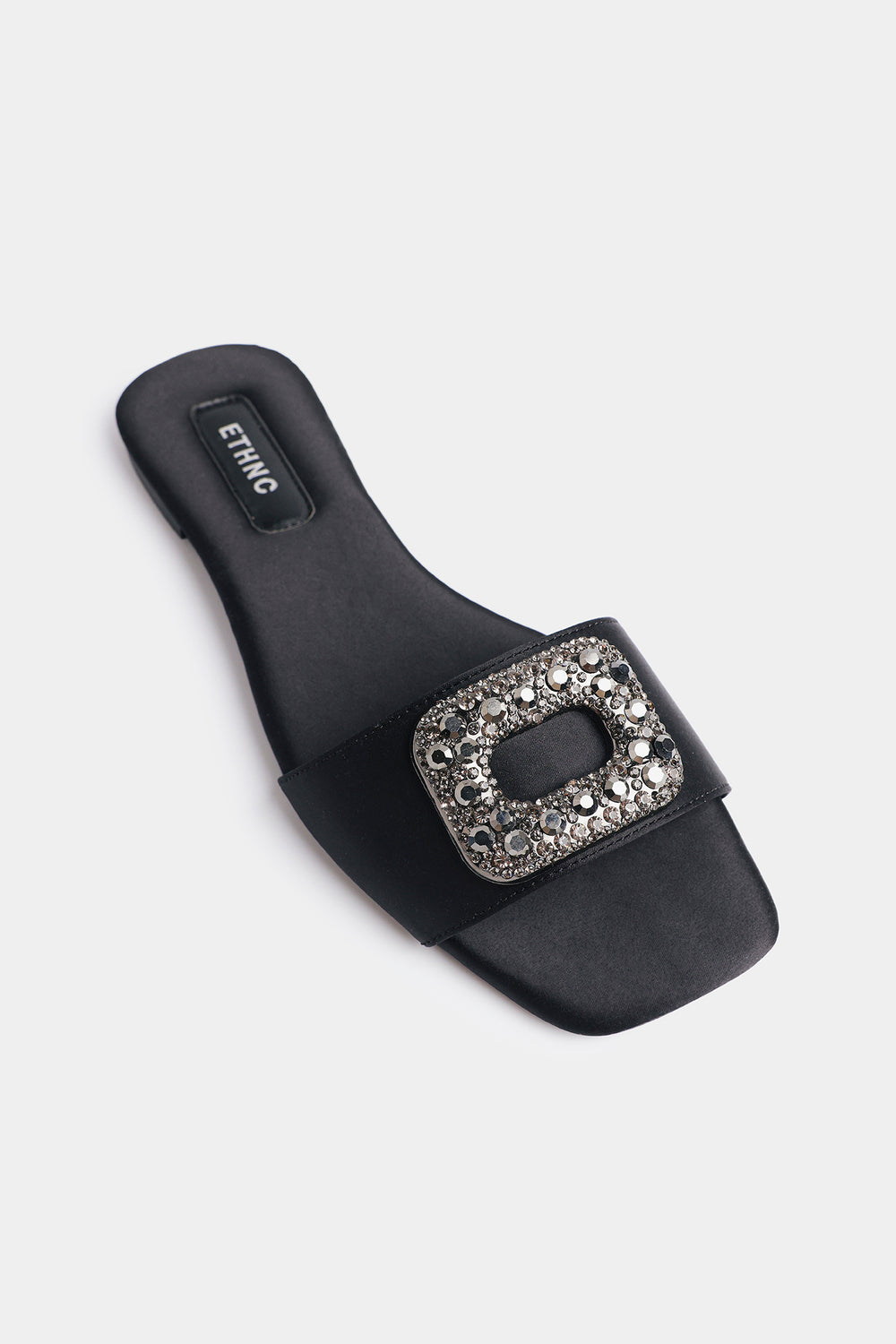 Add a touch of sophisticated glamour to your ensemble with these sleek black slide sandals, featuring a minimalist single-strap design. The broad front strap is crafted from a smooth, matte material and serves as a base for a striking, oversized rectangular buckle. This statement buckle is densely encrusted with shimmering charcoal and silver-toned crystals, offering a refined sparkle that elevates the footwear. Designed with a comfortable flat sole and a cushioned insole featuring subtle branding, these sandals perfectly balance style and ease. They are a versatile choice that can seamlessly transition from a polished daytime look to a more formal evening outfit.