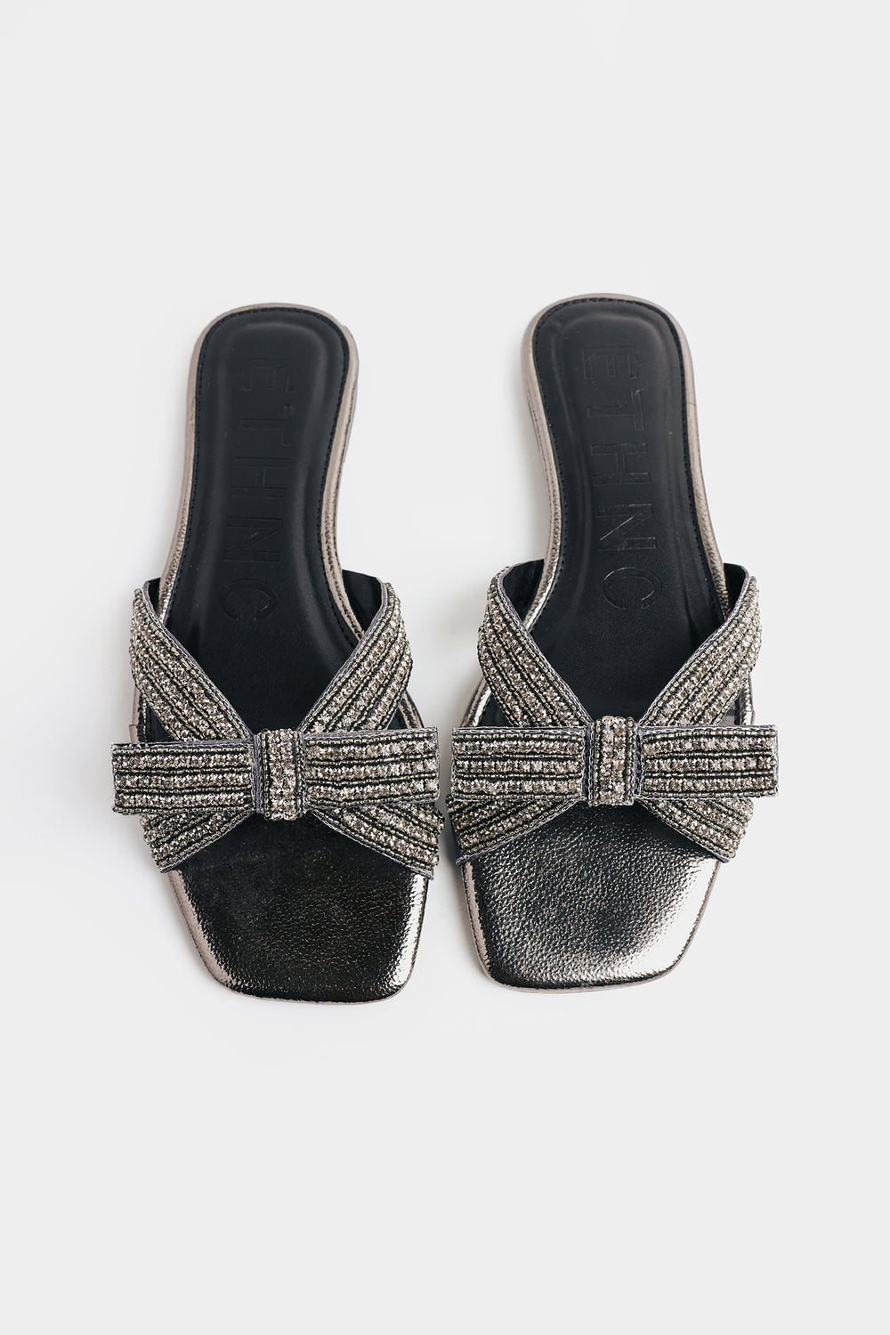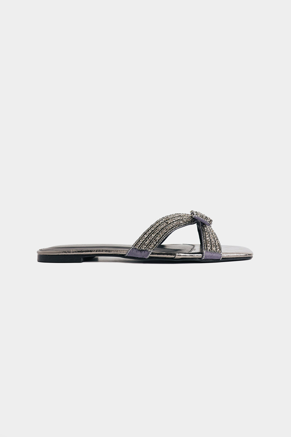 Step into shimmer and sass with these show-stopping slides! Featuring a sleek metallic pewter finish with a textured cracked-leather footbed, they're anything but ordinary—a jaw-dropping multi-layered bow adorned with densely packed shimmering crystals that catch light from every angle. The modern square-toe silhouette keeps things contemporary and cool, while the padded black footbed ensures all-day comfort. Perfect for elevating your casual looks with a touch of sparkle and personality.