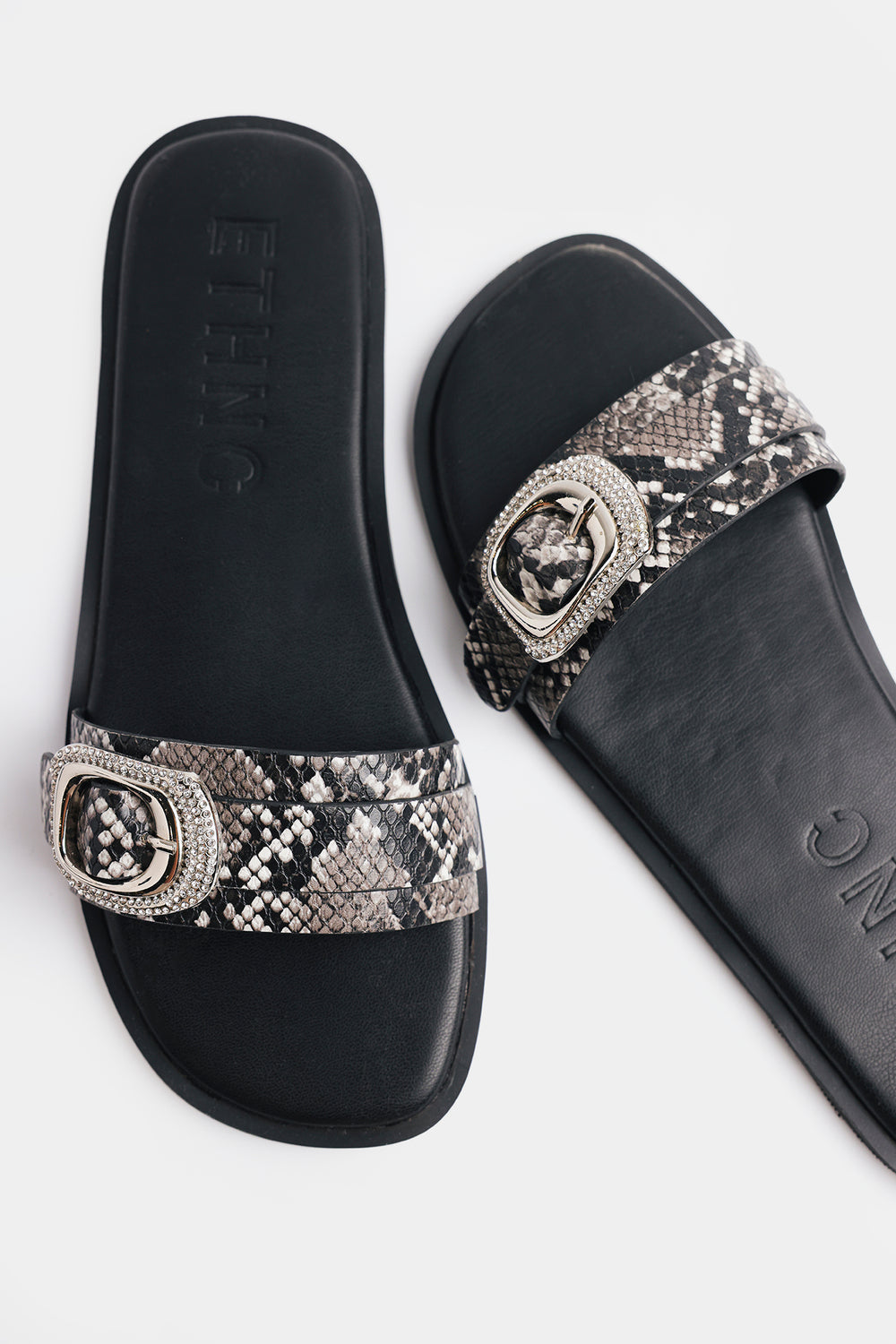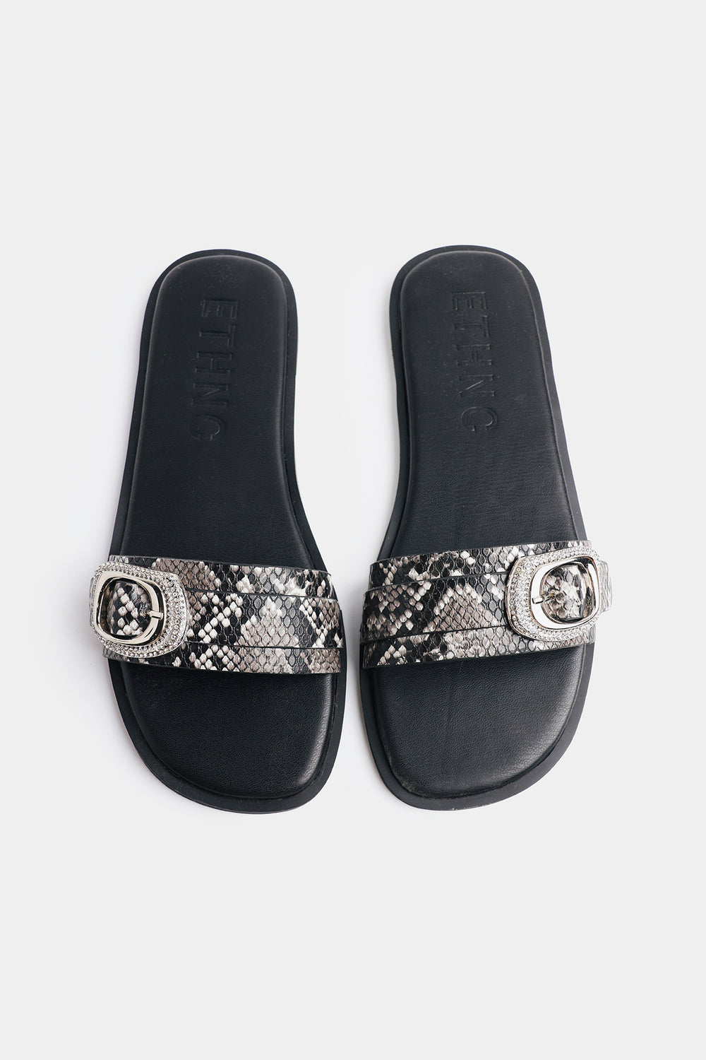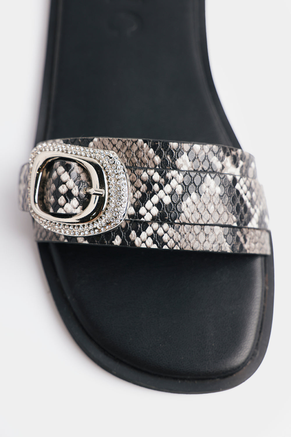 The straps feature a classic animal print in neutral tones of black, grey, and off-white. Each strap is anchored by a large, ornate silver buckle with textured detailing, adding a touch of western-chic. Crafted for both comfort and style, these sandals offer the perfect balance of modern aesthetics and refined elegance.