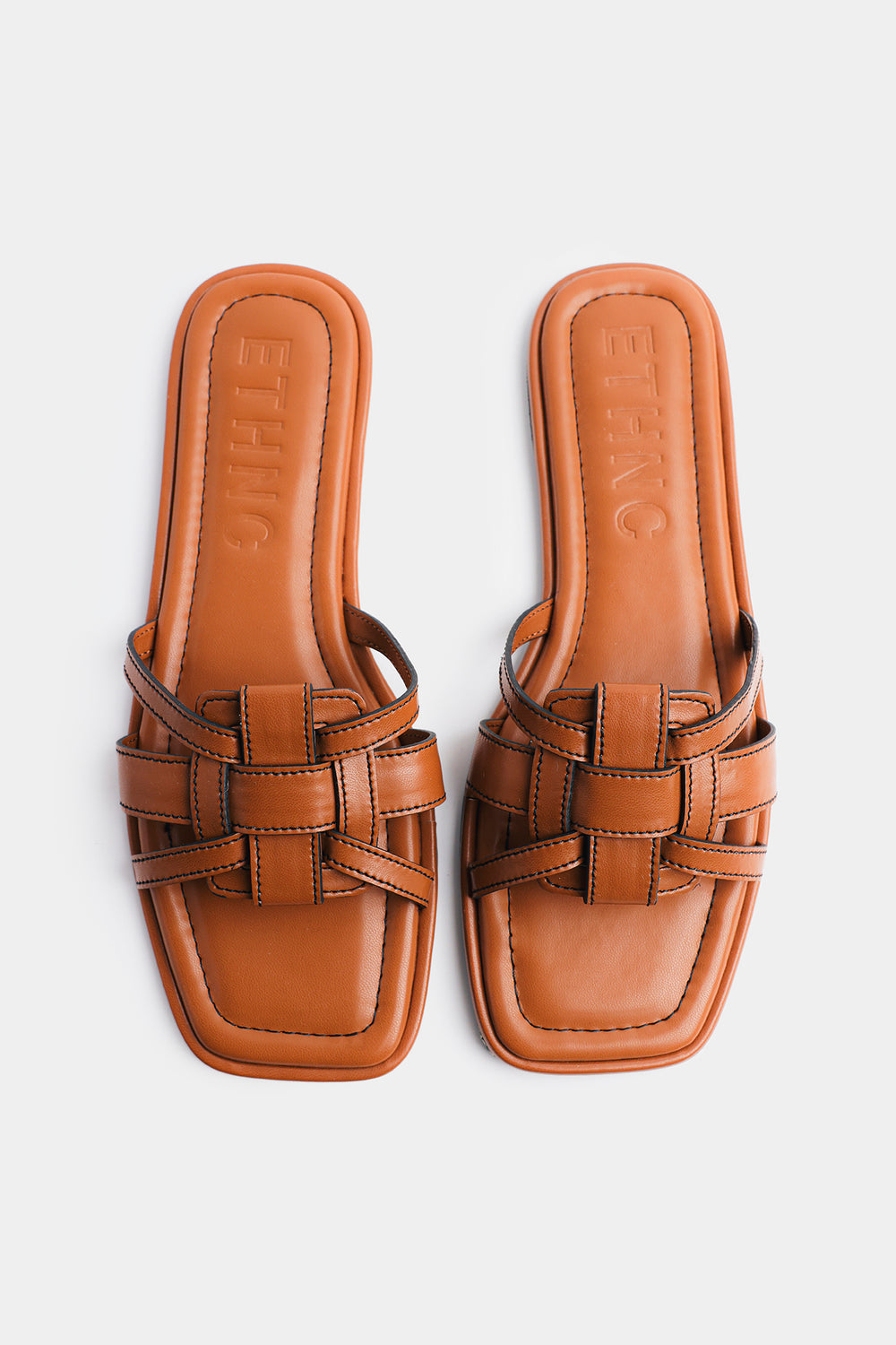 Add a touch of timeless, artisanal flair to your footwear collection with these tan color slides, featuring an intricate woven cage design. The front of the sandal is defined by multiple interlacing straps with contrasting dark-toned stitching that creates a textured, handcrafted aesthetic. The square-toe silhouette offers a contemporary edge, while the flat, cushioned footbed is designed for lasting comfort. These versatile sandals are an excellent choice for pairing with a printed kurti or casual denim to elevate your everyday daytime look.