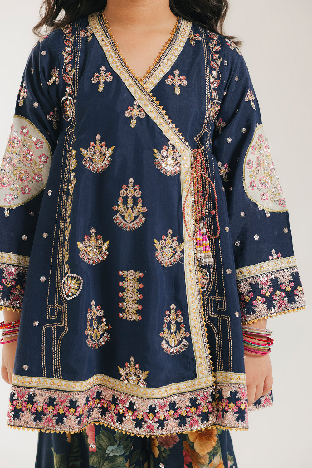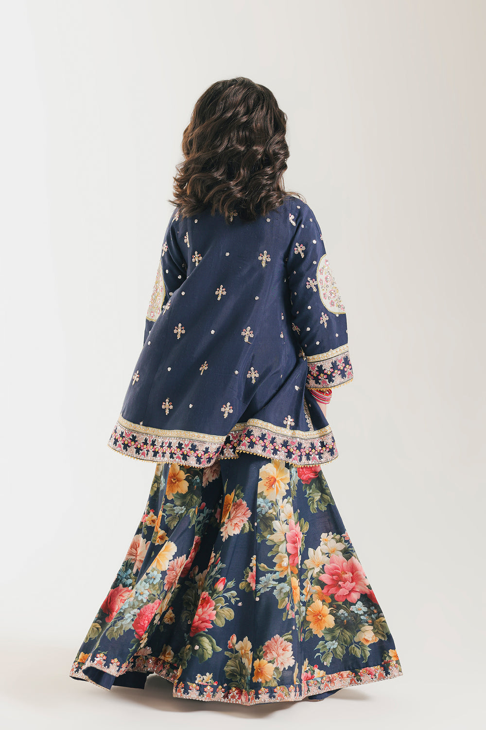 Capture attention with this richly detailed navy blue embroidered suit. This festive ensemble features a short angrakha-style shirt in deep navy blue, beautifully adorned with elaborate gold and pink embroidery along the neckline, body, and cuffs. The top's overlap V-neck design is accented with shiny trims and hints of sequin work. It is perfectly complemented by a voluminous sharara crafted from a matching navy blue fabric, featuring a bold all-over floral print with roses in warm red and pink tones. This striking mix of luxurious embroidery and vibrant print makes this suit a perfect statement piece for special occasions.
