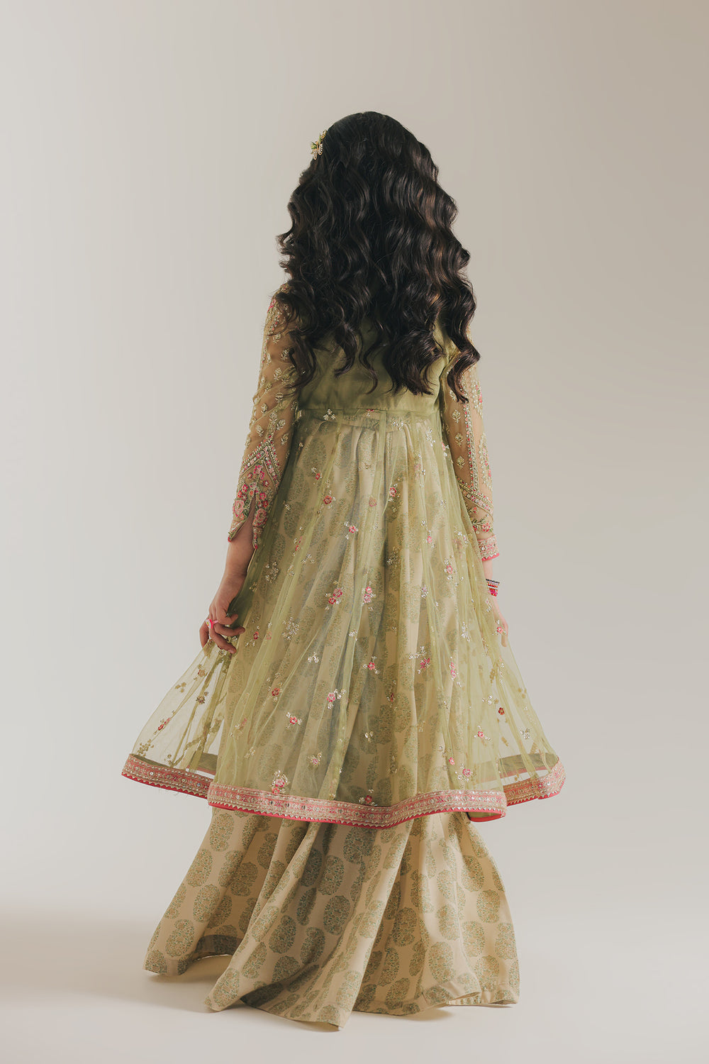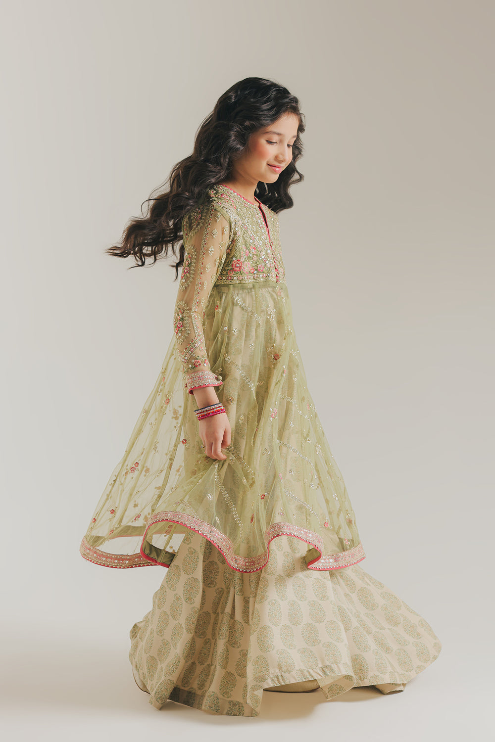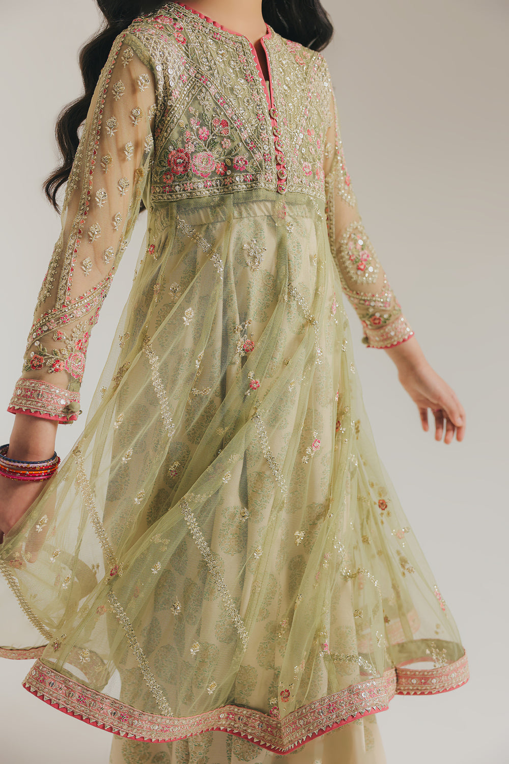Unleash enchanting elegance with this exquisite embroidered suit. Perfect for a young fashion enthusiast, this majestic outfit features a full-sleeved anarkali-style with a voluminous, flowing skirt. The frock is crafted from a delicate, sheer light sage green net fabric that is lavishly embellished with all-over gold sequin and small embroidered pink florals. The yoke is heavily embroidered in pink and gold, creating a rich bodice that contrasts beautifully with the layered skirt. The outfit is completed with complementing flared lehnga in a soft beige base fabric featuring a subtle all-over print. The entire ensemble, including the hem of the frock and the cuffs of the sleeves, is finished with a striking deep pink border.