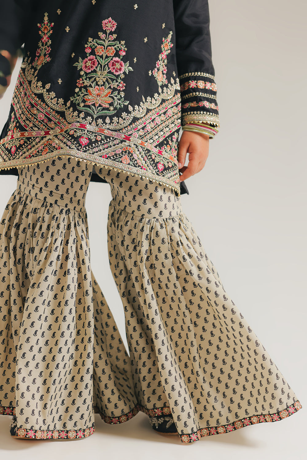 This exquisite embroidered suit combines timeless elegance with contemporary styling. The black kurti showcases intricate Resham and Zari embroidery adorning the neckline, sleeve cuffs, and hemline, with delicate scattered motifs across the chest that catch the light beautifully. Paired with cream and beige gharara trousers featuring a striking geometric block-print pattern, the ensemble creates a sophisticated contrast. The gharara's signature gathered knee design delivers the dramatic flare characteristic of this traditional silhouette, making it an ideal choice for festive occasions.