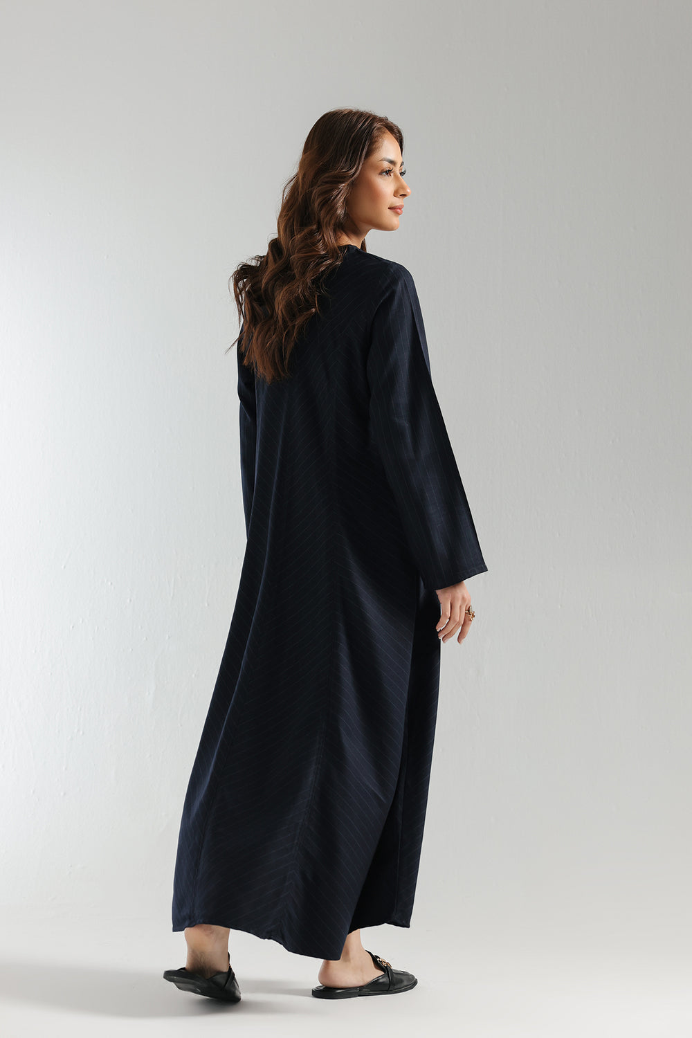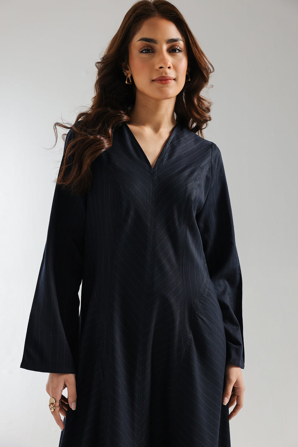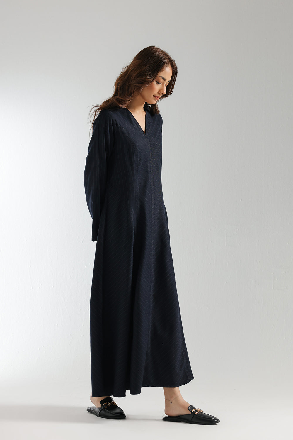 Make a style statement without the effort in this elegant, navy blue dress. With its perfectly crafted silhouette with a V neck, this graceful striped dress illustrates a sleek look perfect for evening soirees. Crafted to perfection and embracing a flowy design, you can't go wrong with this charming outfit.