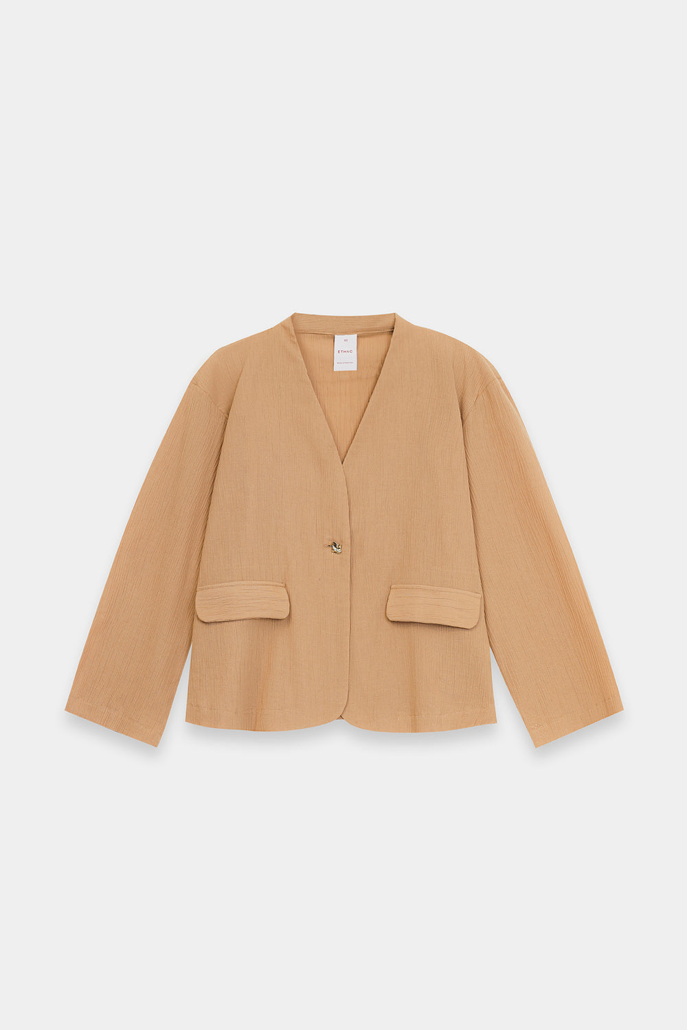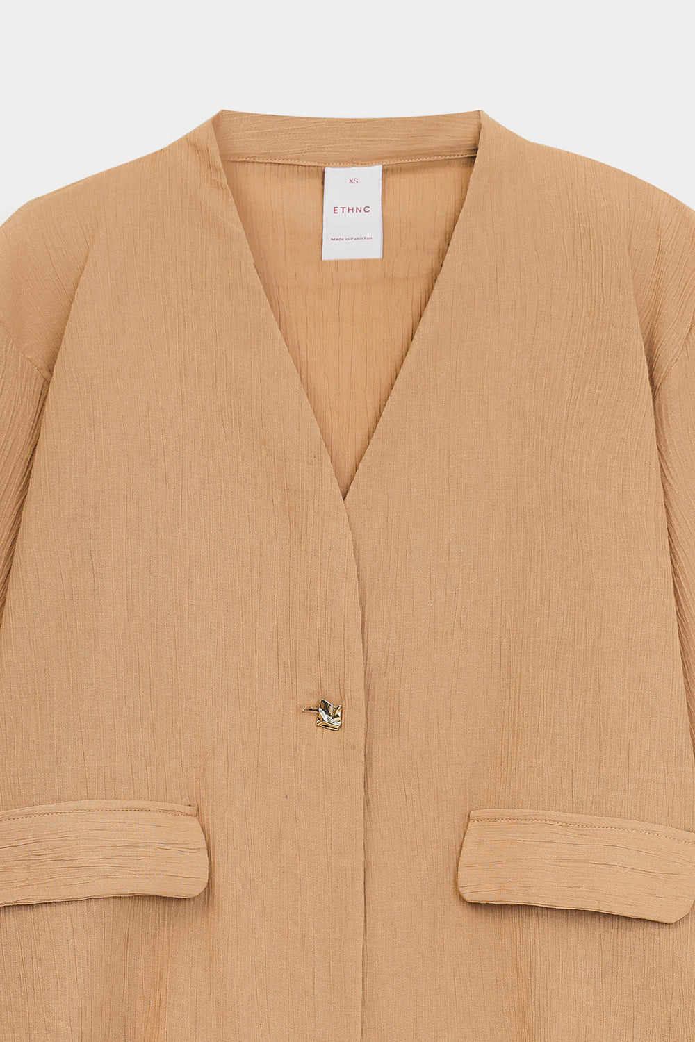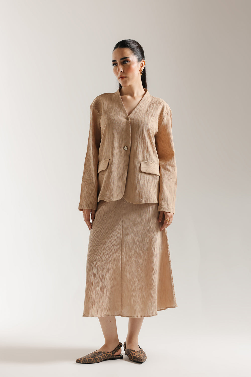 This versatile skirt is a chic and comfortable addition to any wardrobe. The long, flowing A-line silhouette in a soft beige color creates an effortless look. With its stylish utility pockets, this skirt is a perfect piece for both a relaxed and polished style, layered on this elegant blazer rendered in a mesmerizing shade. Crafted in a classy silhouette with a button closure at the front and adorned with flap pockets, this style statement blazer is a must-have to be the epitome of perfection this season.