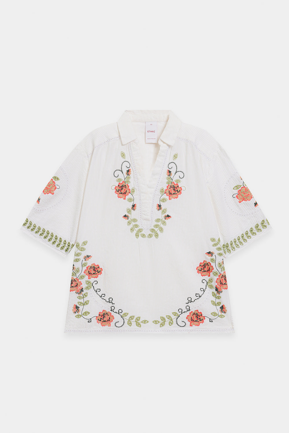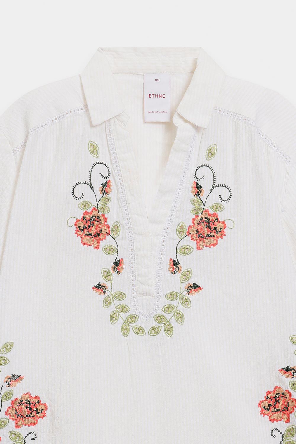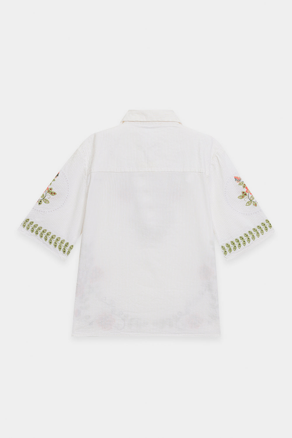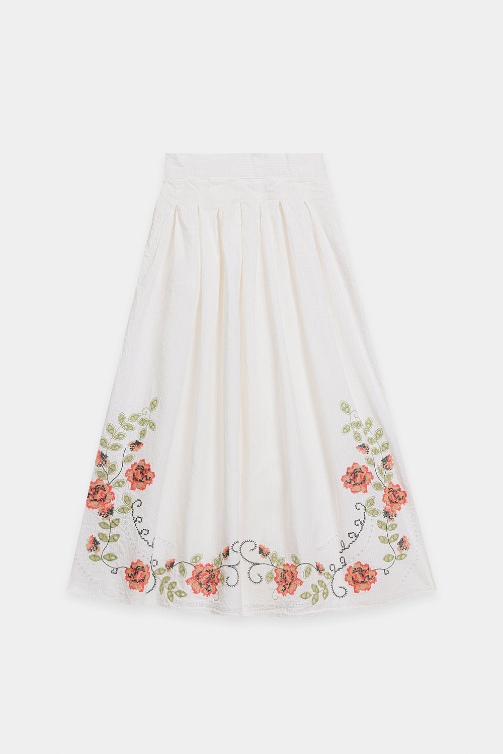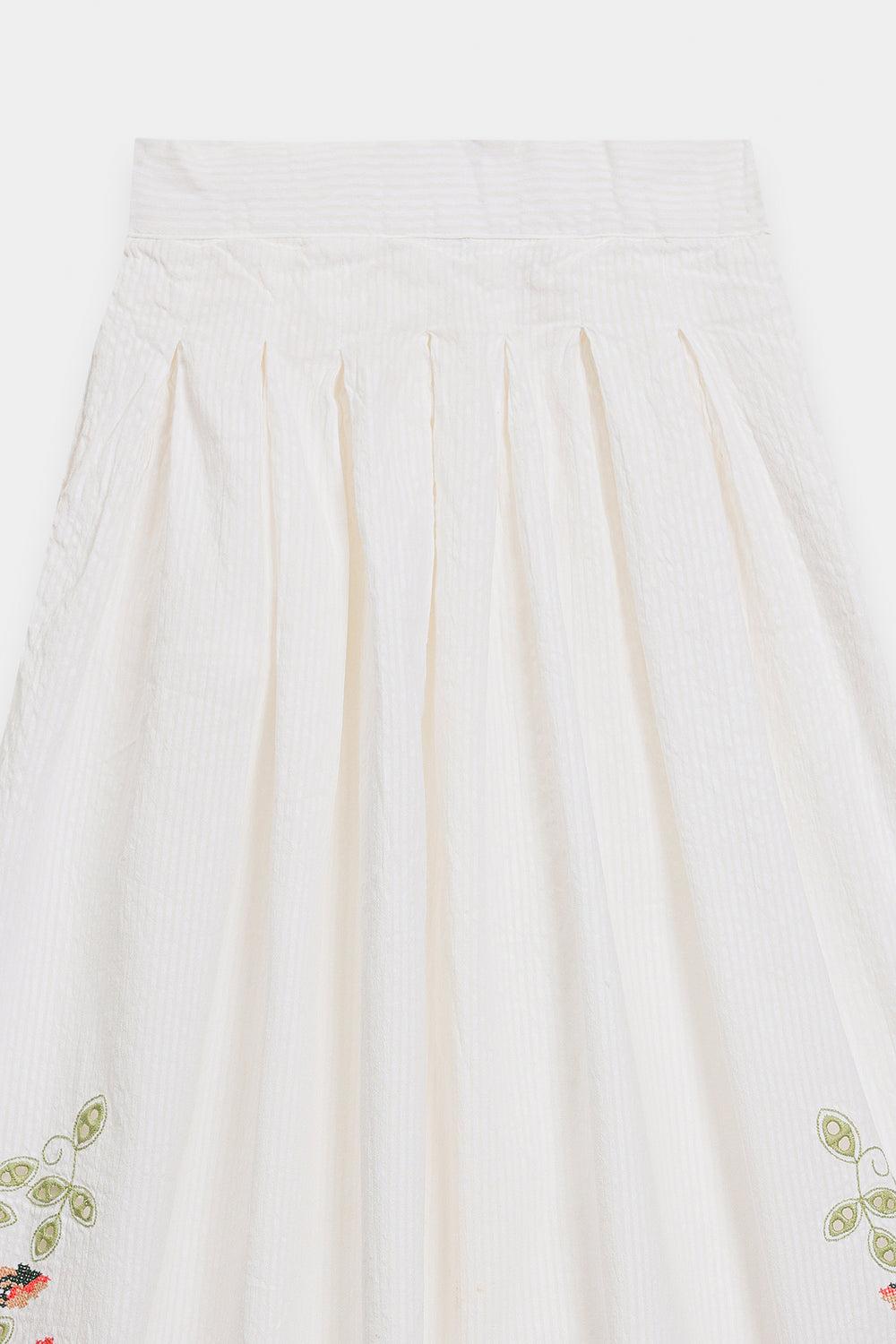 Step into refined summer elegance with this enchanting embroidered set. The crisp white, textured fabric offers a breezy, comfortable fit in both the top and the skirt. The short, straight-cut shirt features a V-neckline and is beautifully adorned with delicate floral embroidery in soft shades of orange and green around the neck and hem. The ensemble is completed with a long, flowing, A-line skirt that mirrors the shirt's artistry, showcasing large, graceful floral and vine embroidery patterns around the lower border. This set is a stunning blend of understated charm and artistic detail.