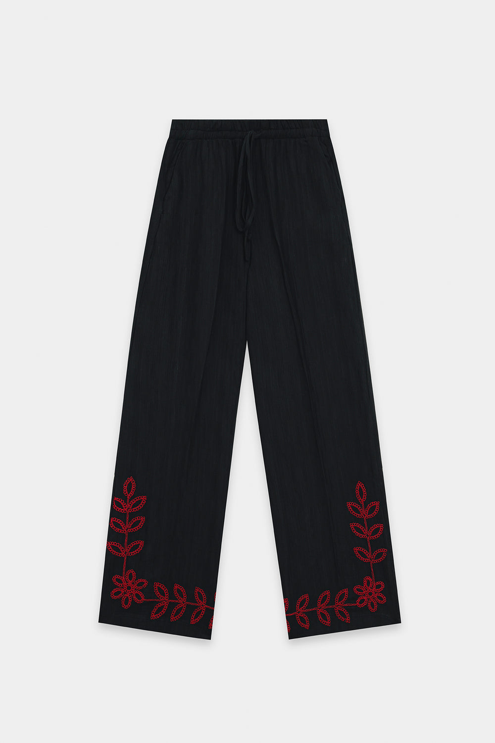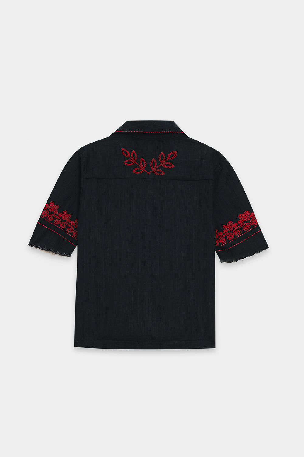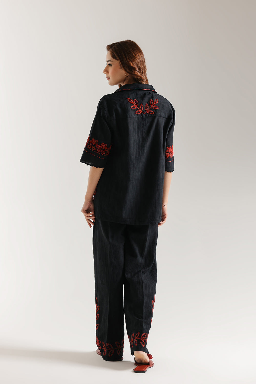 Discover refined elegance with this striking deep black ensemble that seamlessly merges contemporary design with traditional craftsmanship. The black canvas foundation provides a sophisticated backdrop for exquisite red floral embroidery adorning the shirt's front, back and sleeves. A relaxed, straight collared shirt paired with flared-cut trousers creates a modern silhouette that flatters effortlessly. Delicate embroidered detailing at the hem elevates the ensemble with understated luxury. Perfect for those who appreciate timeless style infused with artisanal detail, this suit transitions seamlessly from formal occasions to elevated everyday wear.