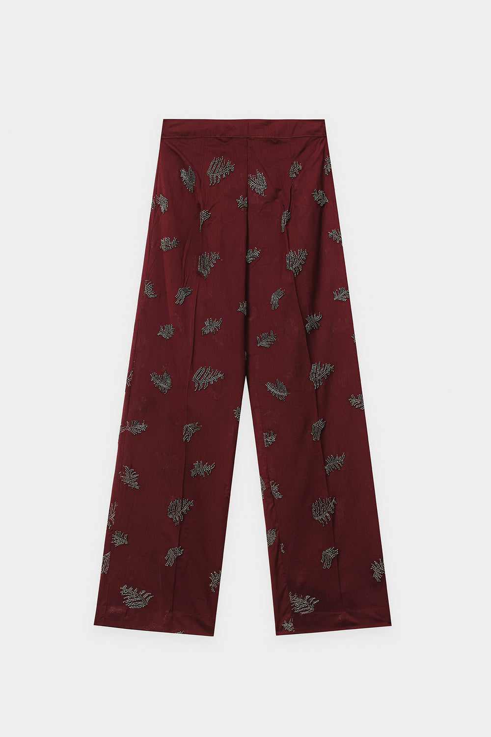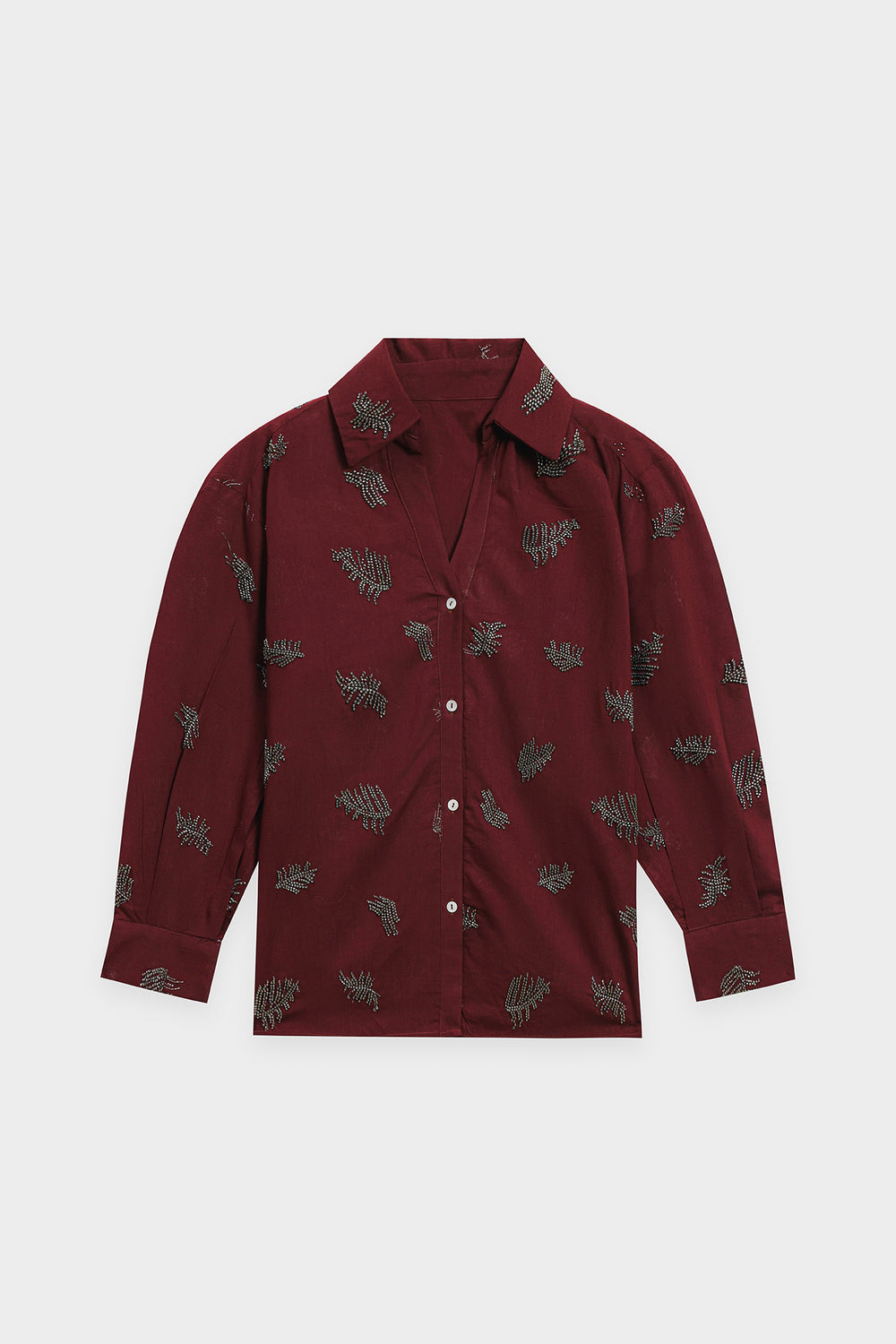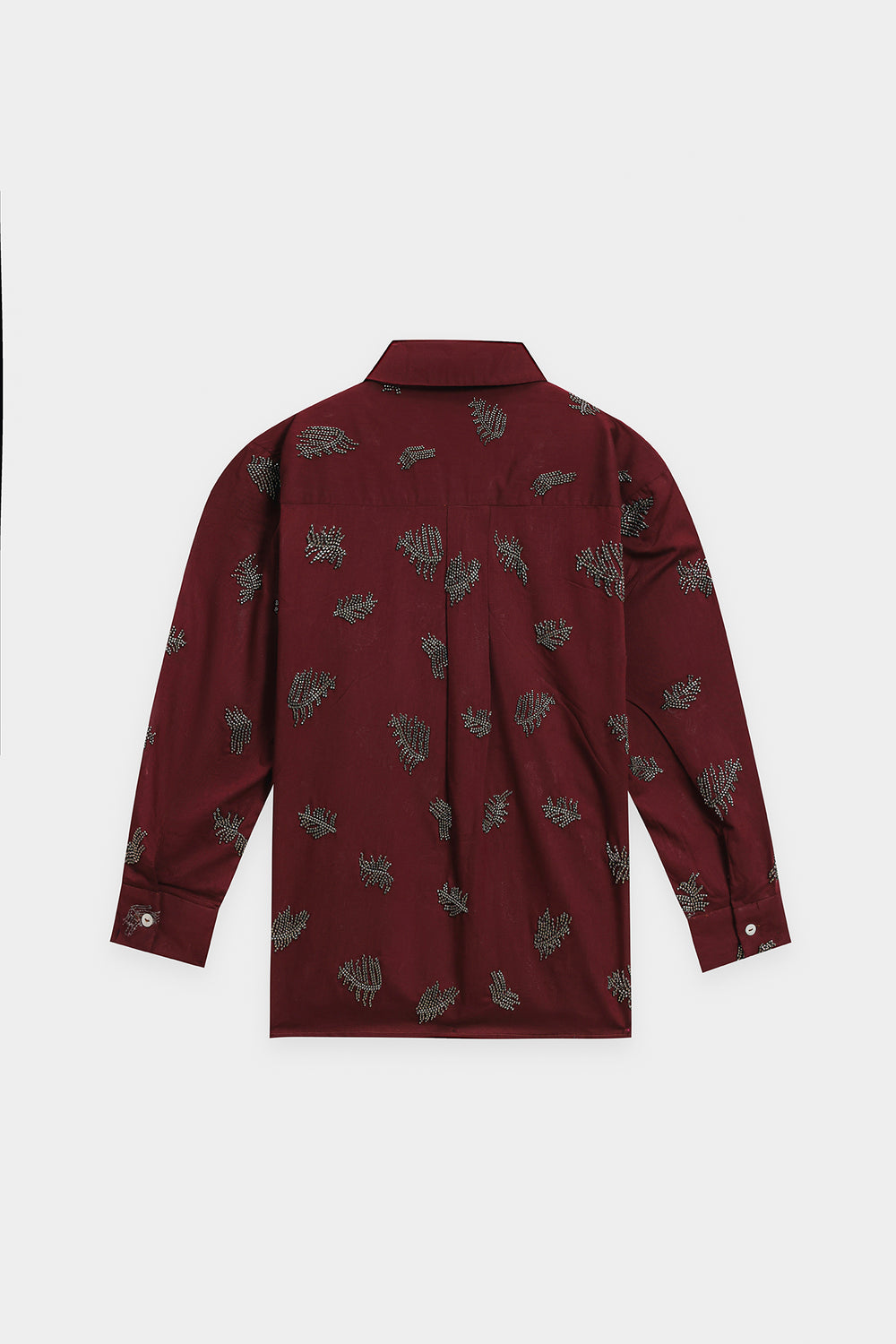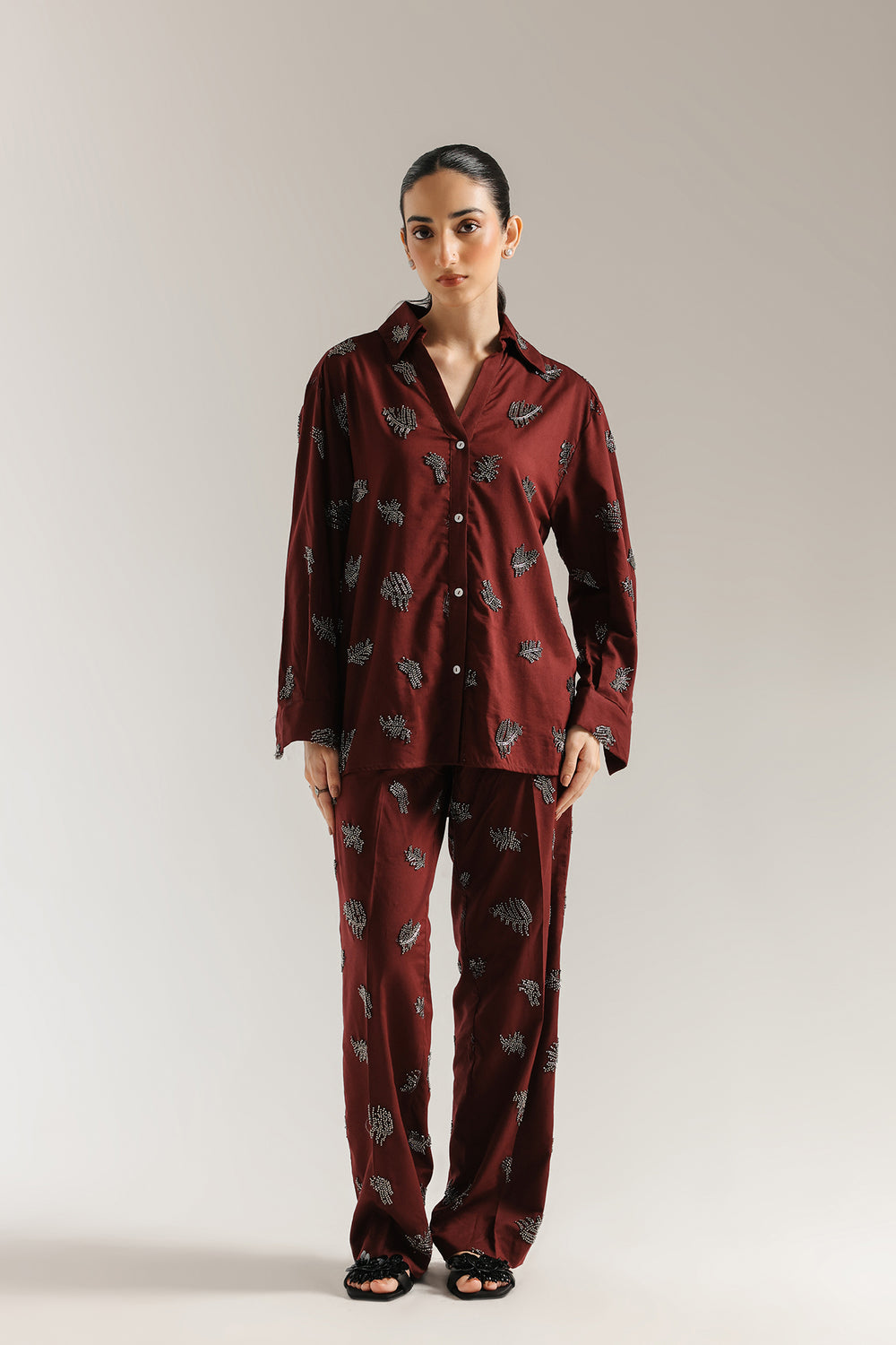 Explore the depths of modern elegance. This luxurious co-ord set features a rich, deep maroon fabric beautifully adorned with intricate abstract leaf embellishment in a contrasting light grey or silver hue. The relaxed-fit collared shirt and straight-leg trousers create a cohesive and sophisticated look. This ensemble is a perfect blend of rich color and modern artistry, ideal for making a bold and stylish statement.