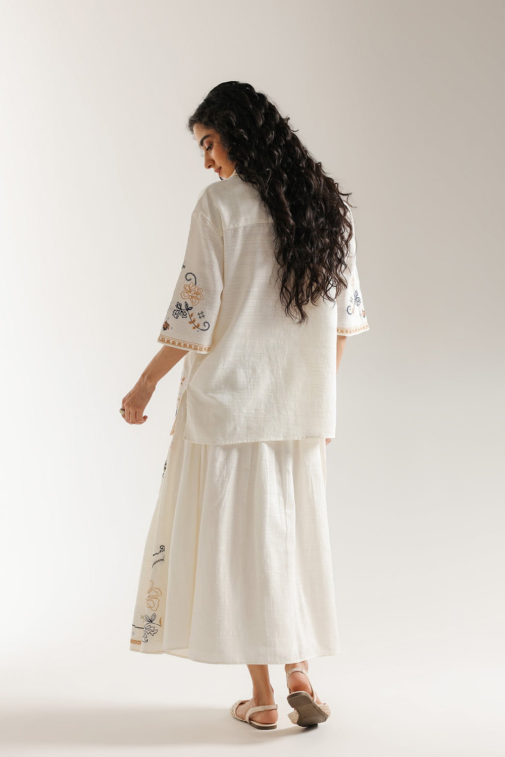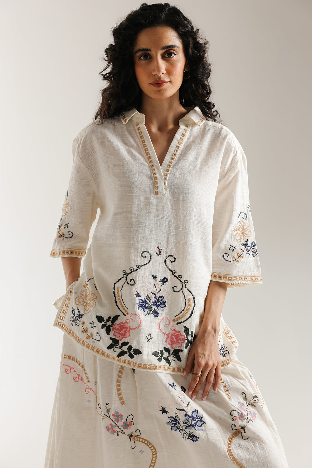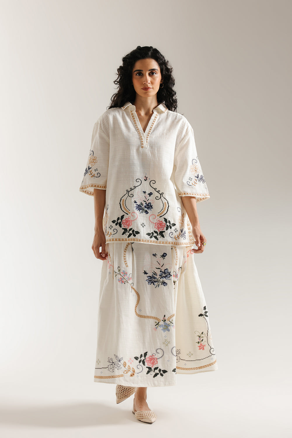 This ensemble exudes timeless grace with its ivory base adorned in intricate floral embroidery. The relaxed kurta features delicate threadwork along the neckline and sleeves, beautifully complemented by a matching flowy skirt showcasing detailed motifs in soft pastel shades. The look captures refined elegance with a modern, effortless charm perfect for festive and daytime sophistication.