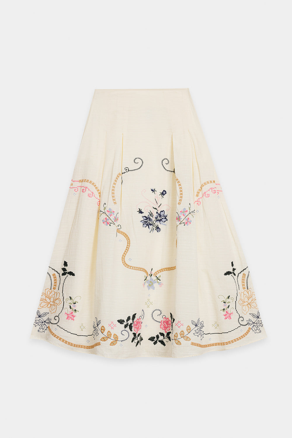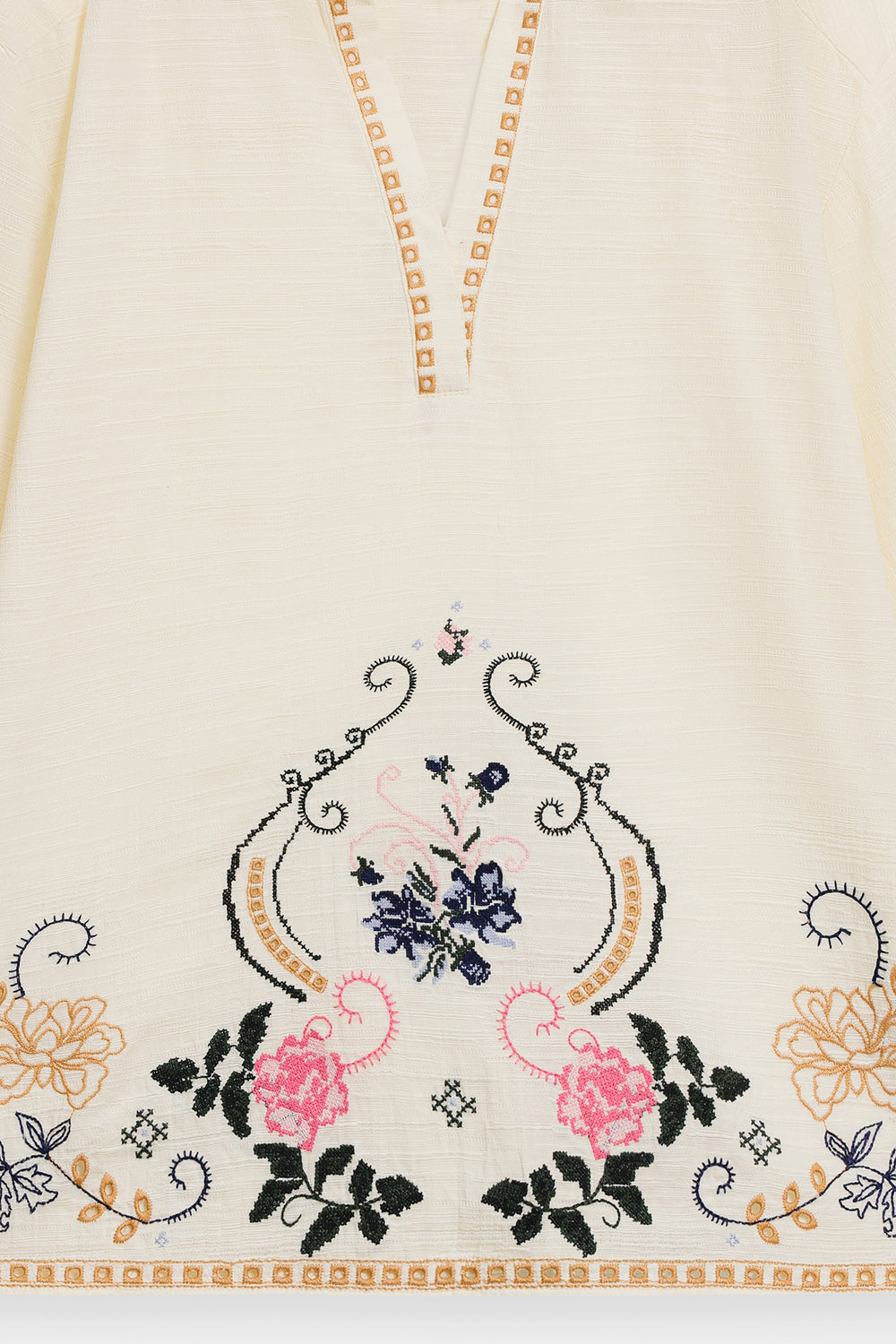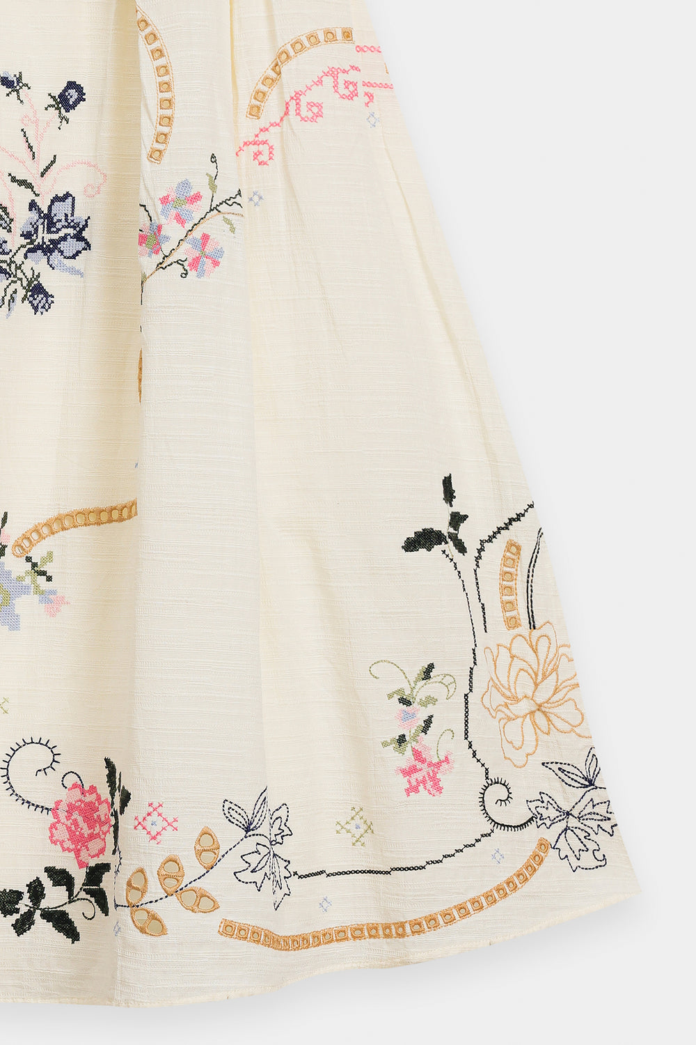 This ensemble exudes timeless grace with its ivory base adorned in intricate floral embroidery. The relaxed kurta features delicate threadwork along the neckline and sleeves, beautifully complemented by a matching flowy skirt showcasing detailed motifs in soft pastel shades. The look captures refined elegance with a modern, effortless charm perfect for festive and daytime sophistication.