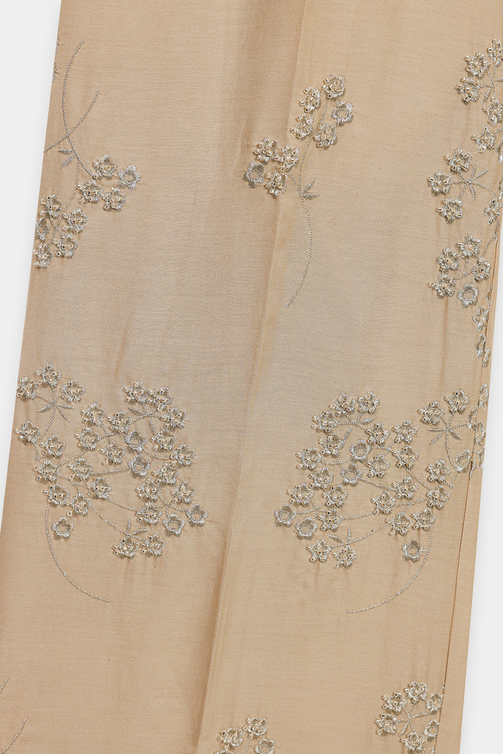 Experience the perfect fusion of tradition and modern elegance. This stylish suit features a soft, earthy beige fabric adorned with intricate, embroidery in a beautifully stylized pattern on the shirt. The delicate details are continued on the wide sleeves and the matching trousers, creating a cohesive and sophisticated look. This ensemble is a testament to subtle artistry and refined style, ideal for a graceful and understated look.