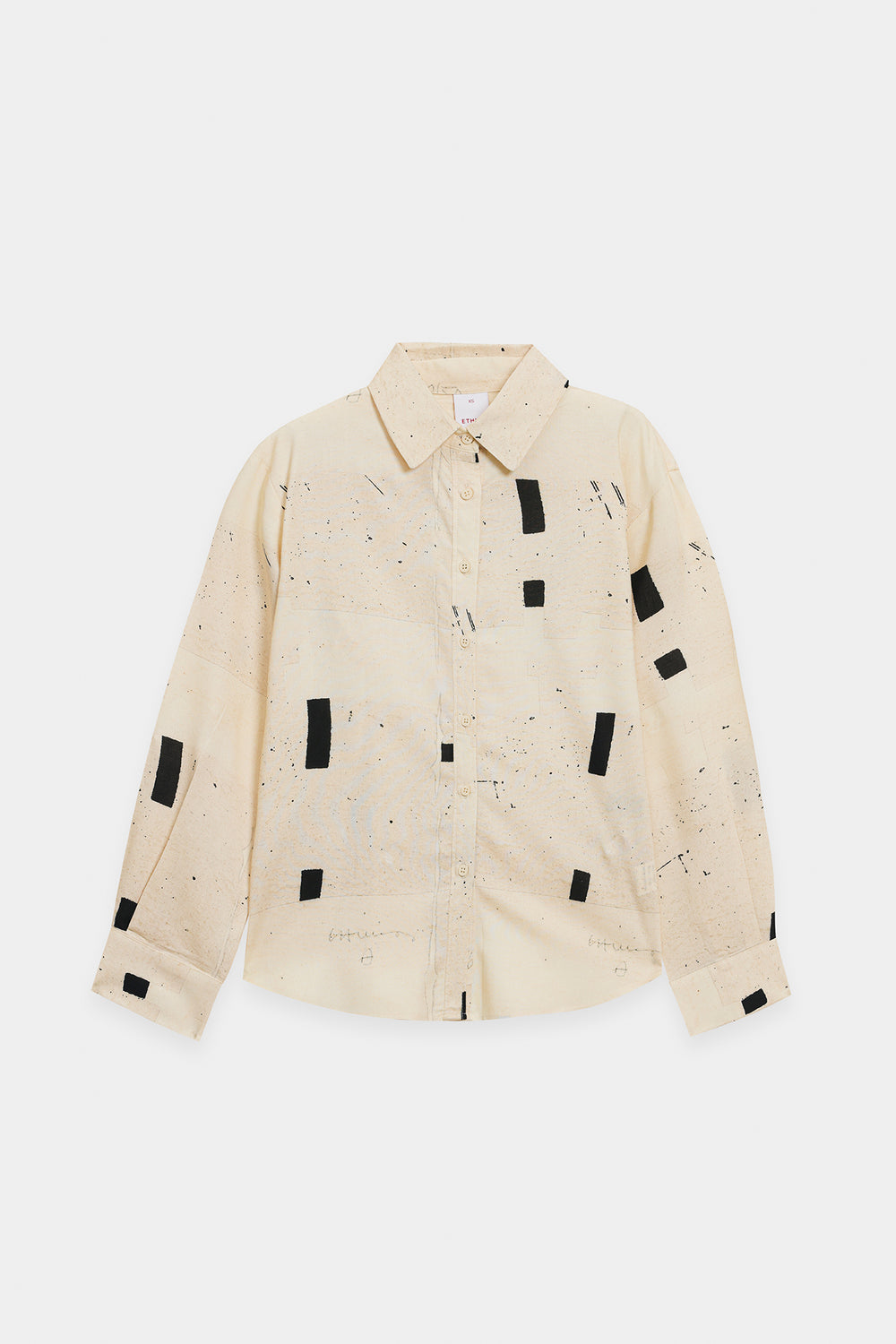 Step into contemporary style with this chic solid suit. This sophisticated co-ord set features a button-down shirt and matching wide-leg trouser, both crafted in a light, off-white fabric. The ensemble is elevated by a modern, abstract print of scattered black lines and rectangular blocks across both the shirt and the trouser. The shirt offers a relaxed, fit with a classic collar. Paired with the dramatic wide leg trouser, this set creates an effortless, artistic, and fashion-forward monochrome look.
