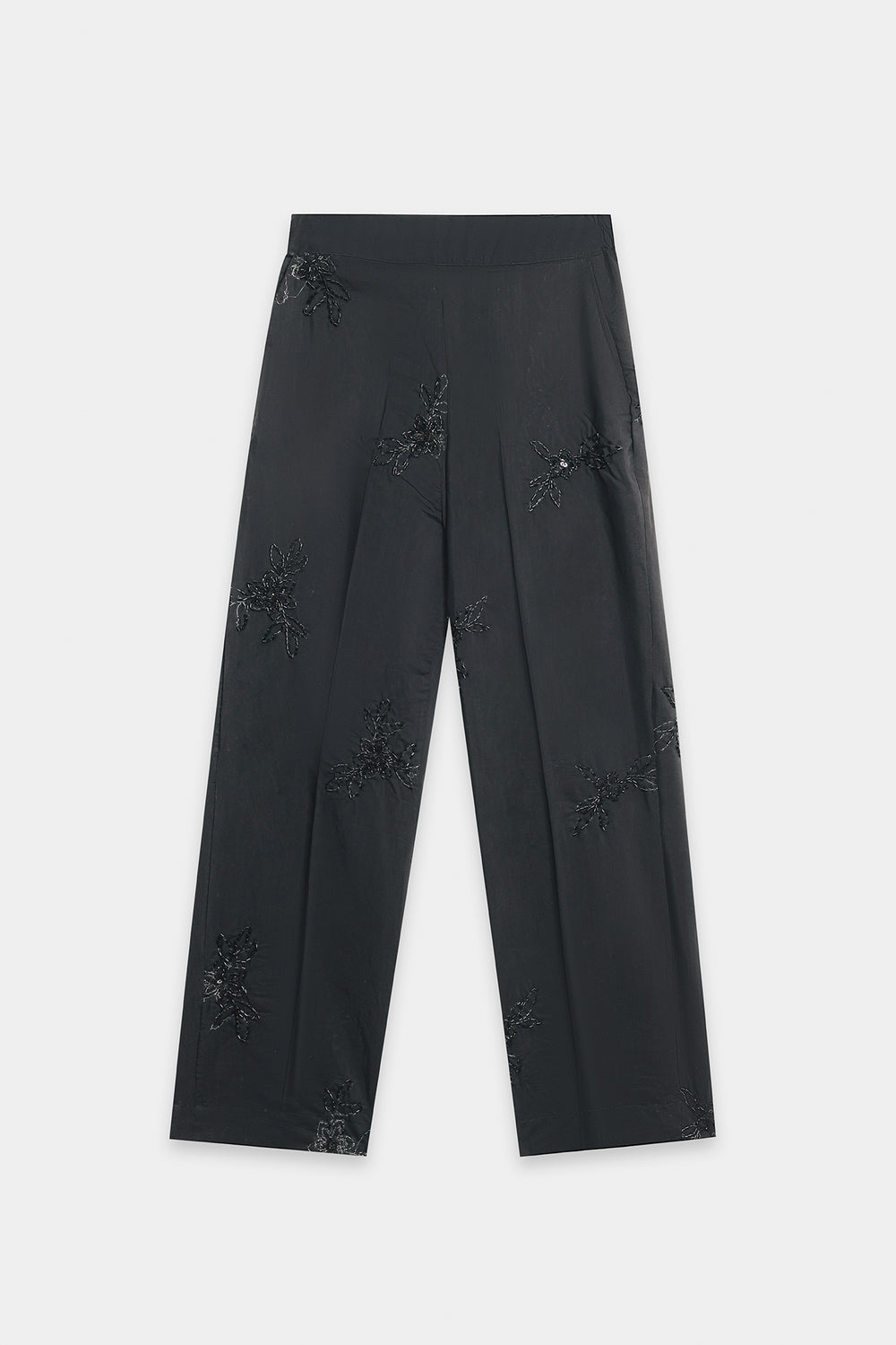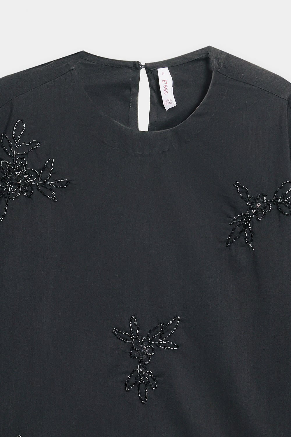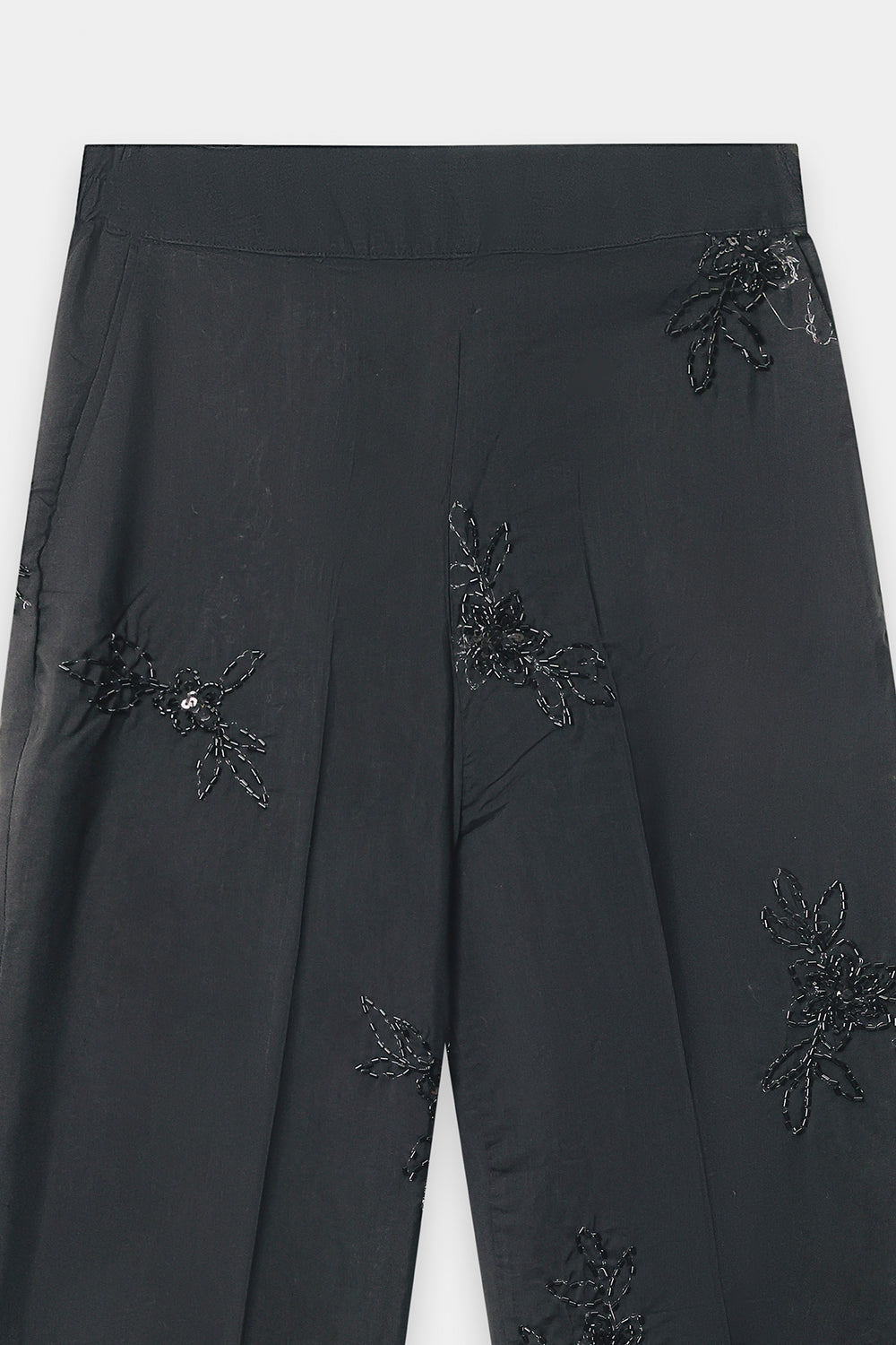 A sophisticated black garment showcasing meticulously placed beaded embellishments that create delicate botanical-inspired designs across the chest. The intricate beadwork on the shirt as well as on the trousers introduces subtle dimensionality and luminosity to the piece. This refined composition balances understated elegance with textural interest, making it an excellent selection for elevated casual or formal occasions