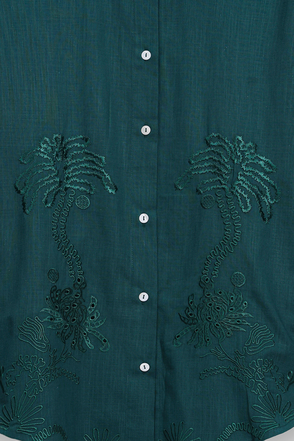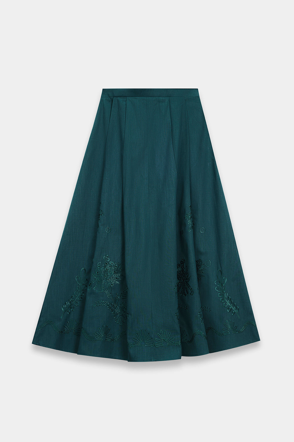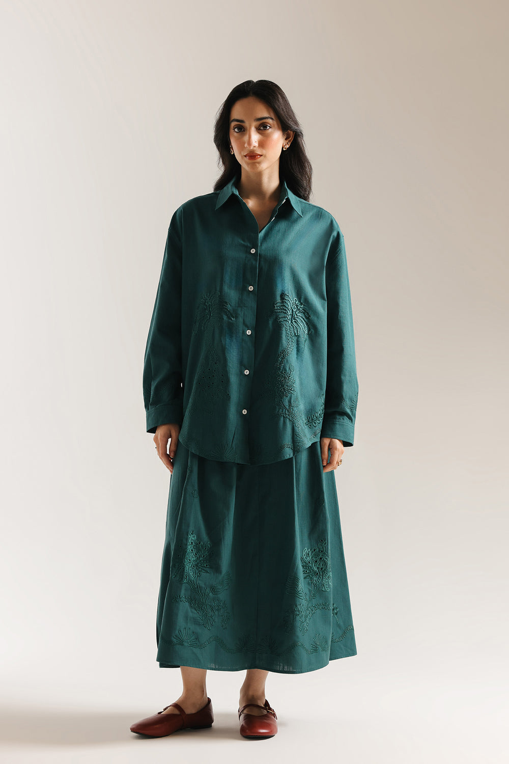 This contemporary two-piece ensemble combines refined tailoring with understated elegance. The collared button-down shirt features a relaxed, slightly oversized silhouette with long sleeves and subtle tone-on-tone embroidery detailing across the front panels. Paired with a coordinating midi A-line skirt adorned with matching textured embellishments at the hem and center front, this set delivers sophisticated versatility. Perfect for elevated casual occasions, professional settings, or smart casual styling, the coordinated design ensures effortless sophistication while maintaining a modest, polished aesthetic.
