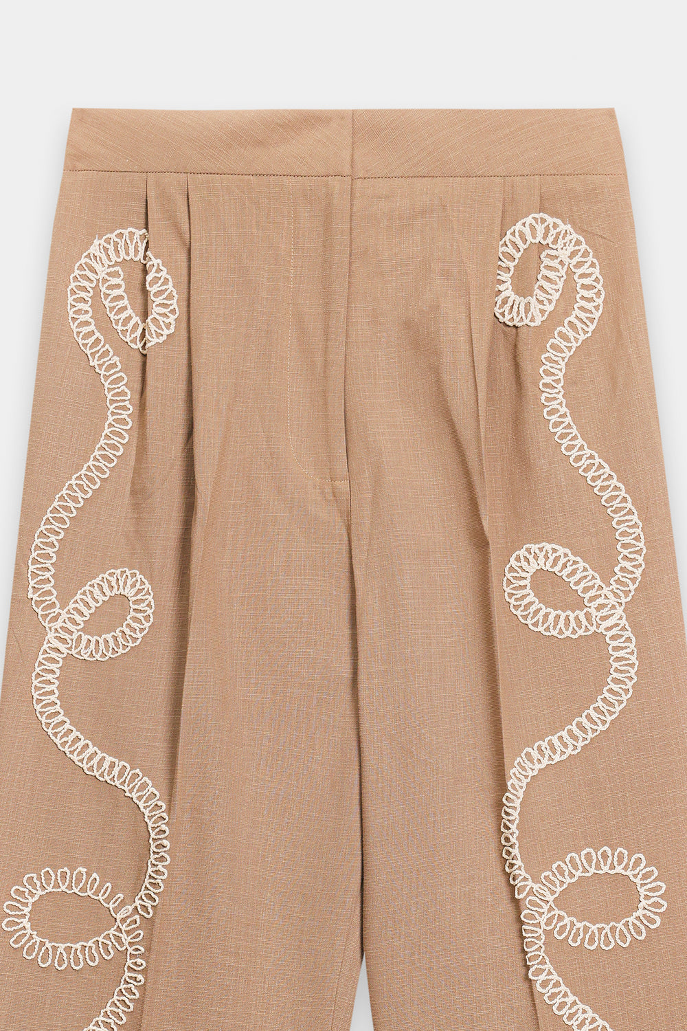 This outfit features a coordinated two-piece set in a warm beige tone, styled with a relaxed, comfortable silhouette. The button-down shirt has a classic collar and long sleeves, adorned with intricate white embroidered motifs that create a soft, elegant contrast. The matching straight-cut trousers carry the same embroidery along the front, giving the ensemble a cohesive and refined look.