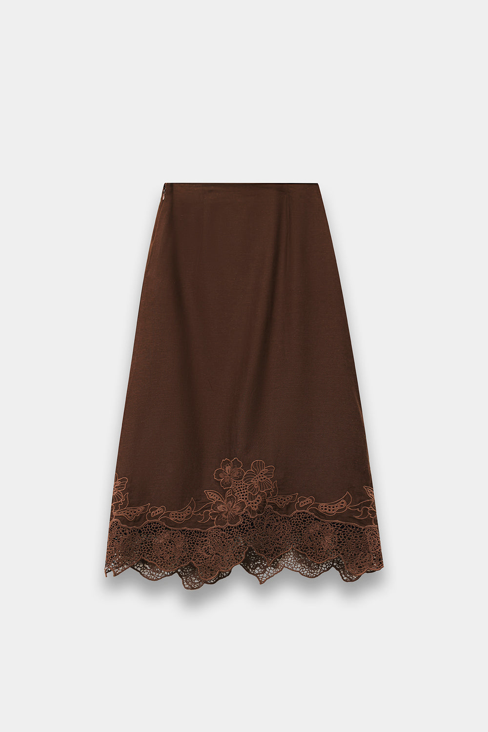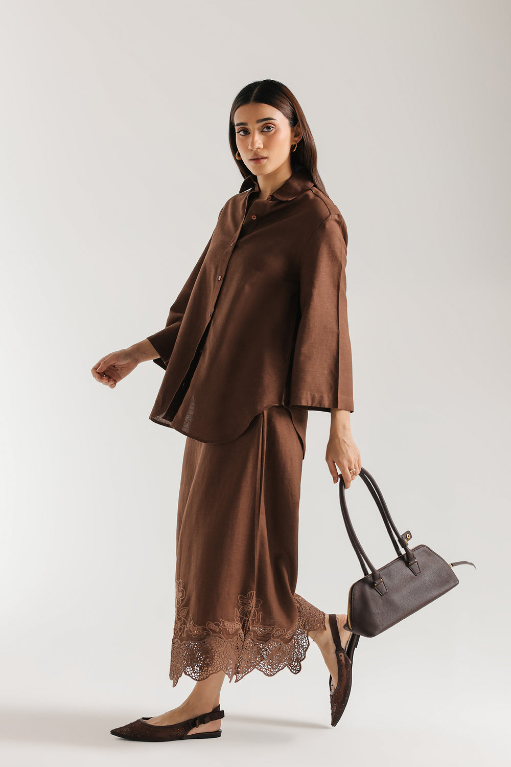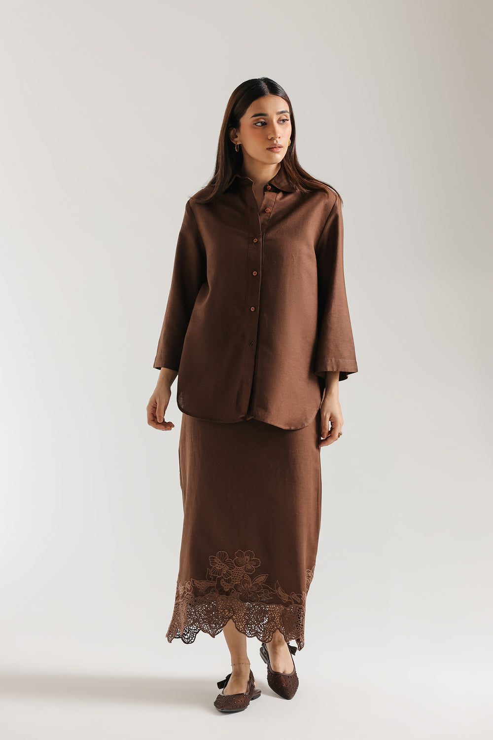 A structured, button-down tunic with a soft collar and three-quarter sleeves. The curved hemline adds a modern, casual touch to the traditional shirt silhouette. The Skirt: A matching midi/maxi skirt featuring a scalloped lace hem. The tonal embroidery and laser-cut lace provide texture, preventing the solid brown color from looking flat.