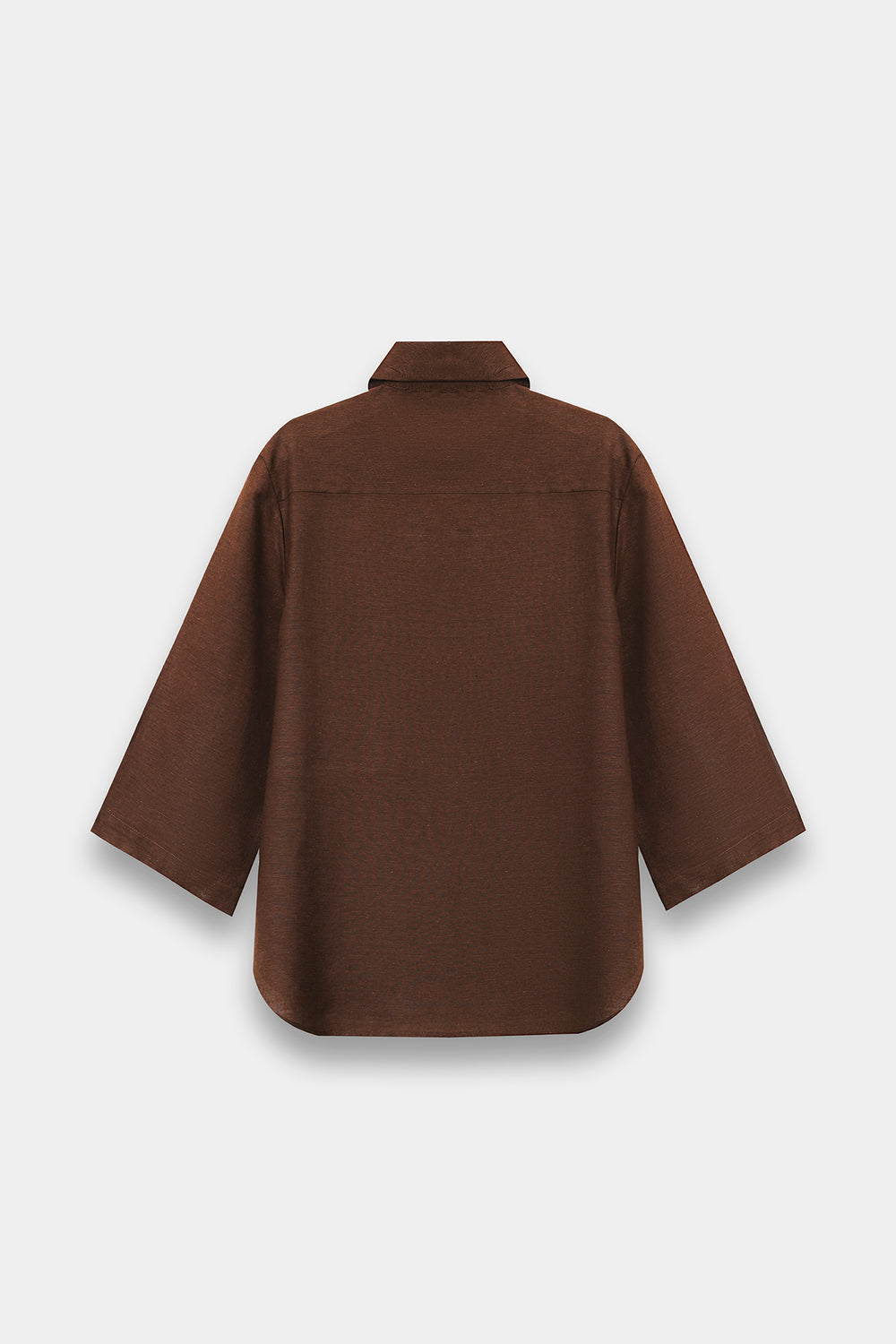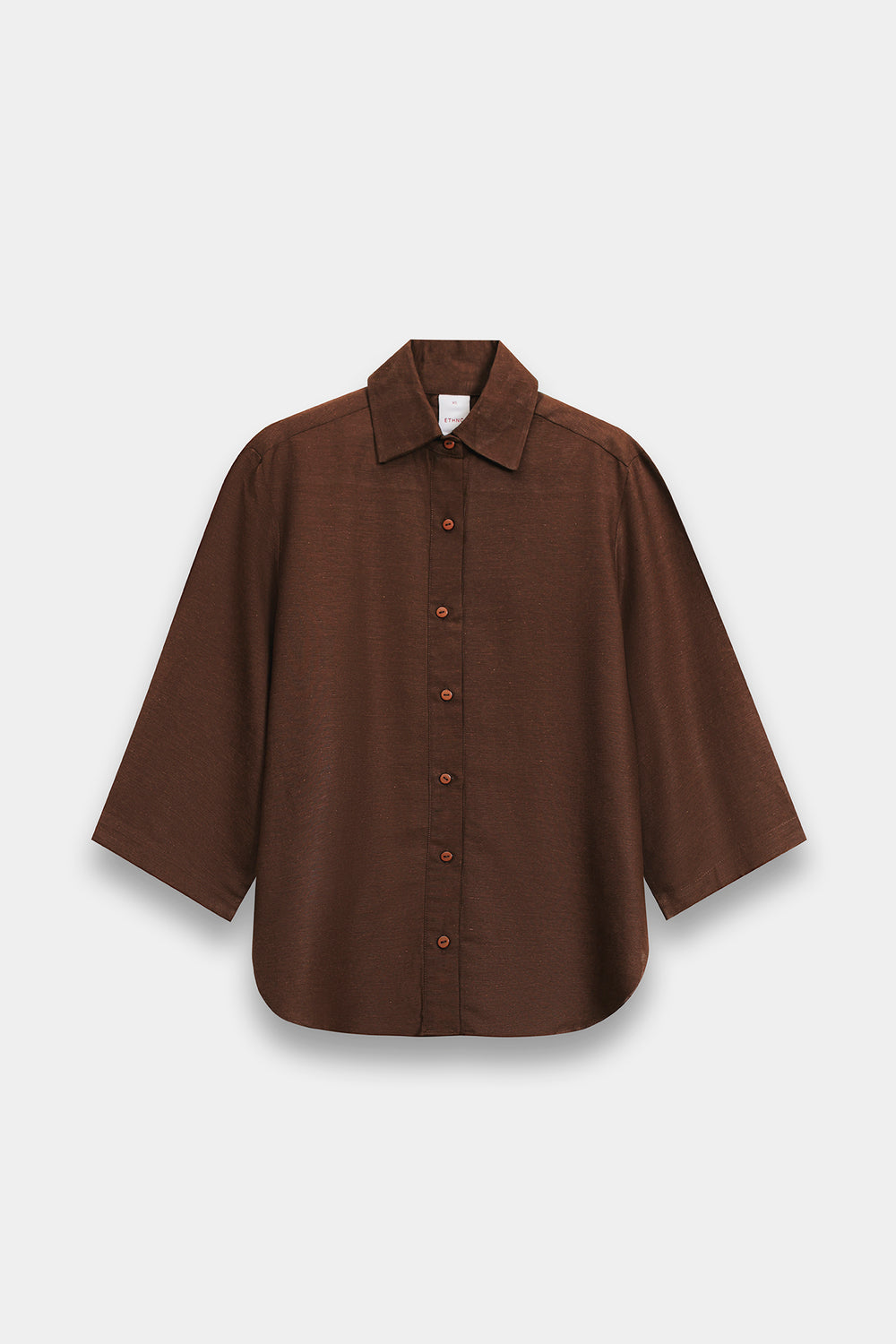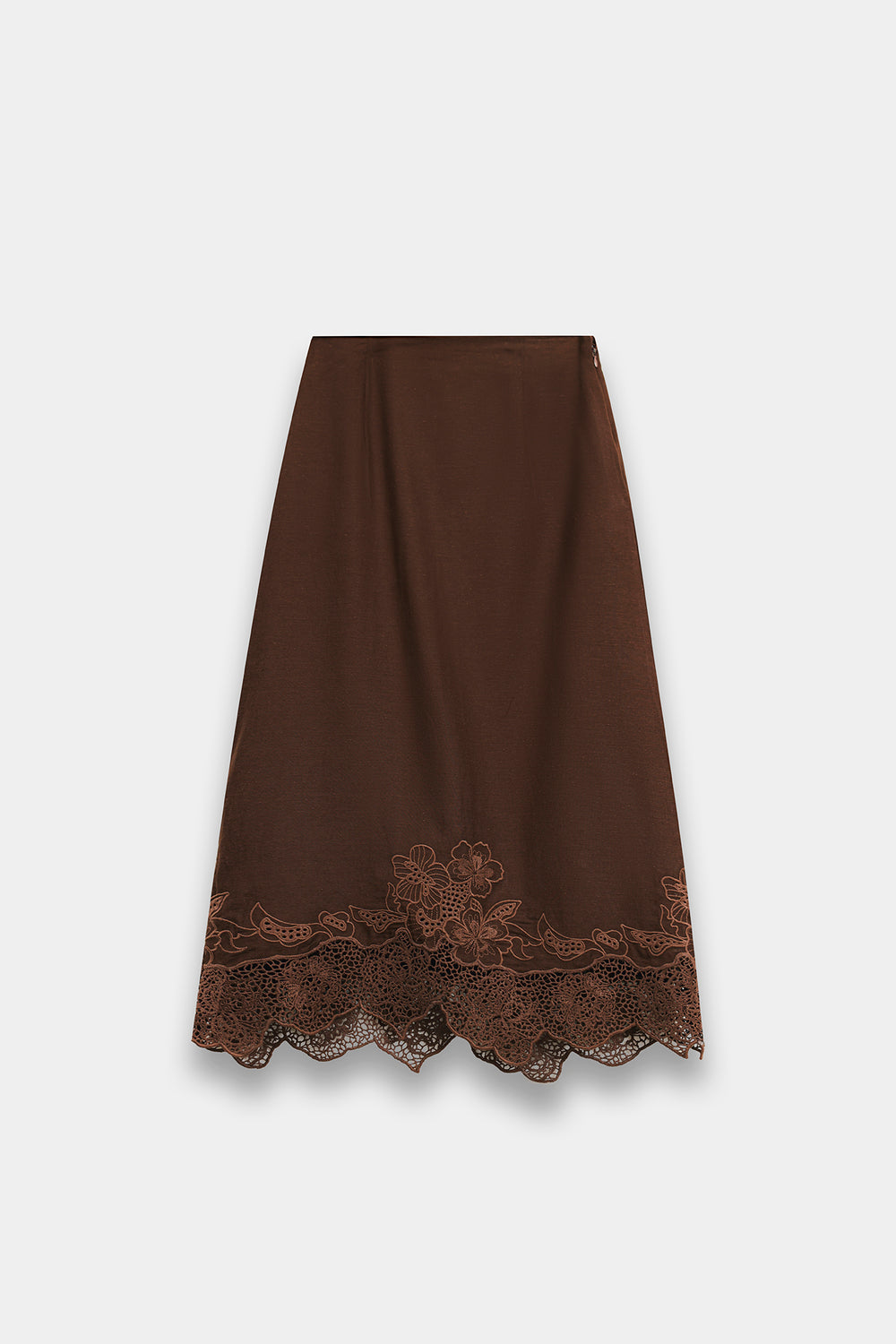 A structured, button-down tunic with a soft collar and three-quarter sleeves. The curved hemline adds a modern, casual touch to the traditional shirt silhouette. The Skirt: A matching midi/maxi skirt featuring a scalloped lace hem. The tonal embroidery and laser-cut lace provide texture, preventing the solid brown color from looking flat.