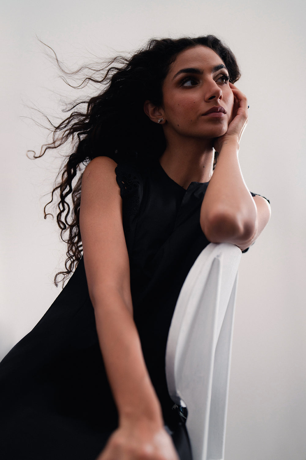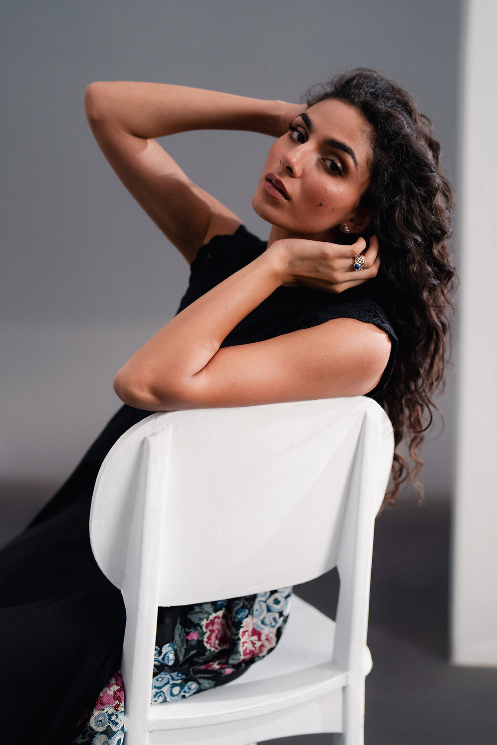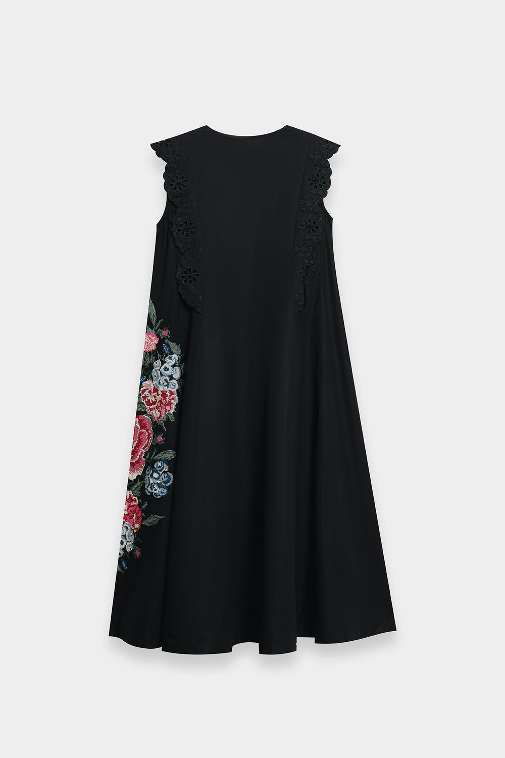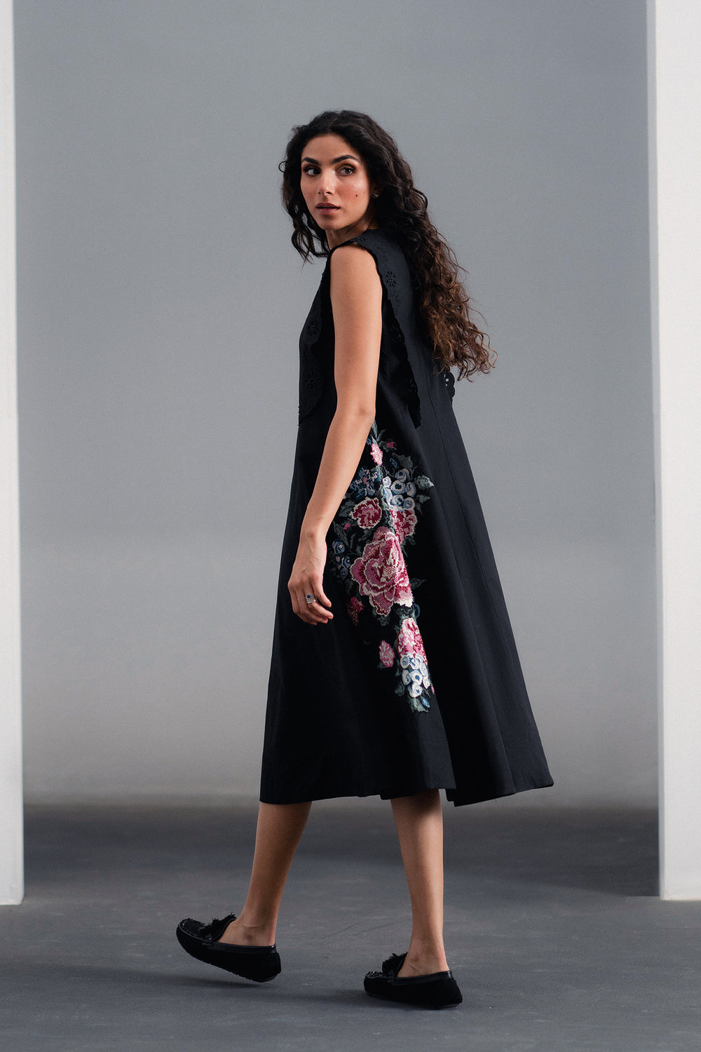 Effortless elegance is redefined in this captivating black dress. The classic A-line silhouette is beautifully enhanced by delicate cut-out and lace detailing at the shoulders and bodice. With its flowing midi skirt and a surprise pop of vibrant, embroidered pattern visible at the side, this piece offers a perfect blend of sophisticated charm and artistic detail.